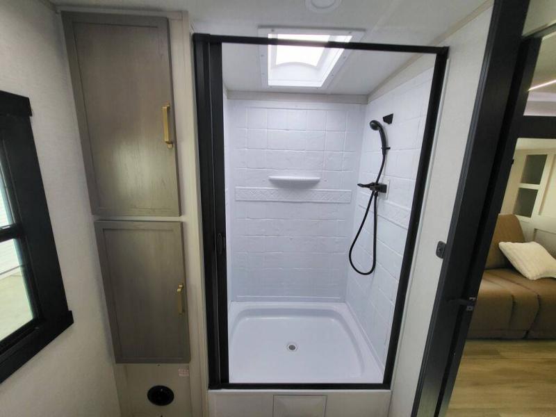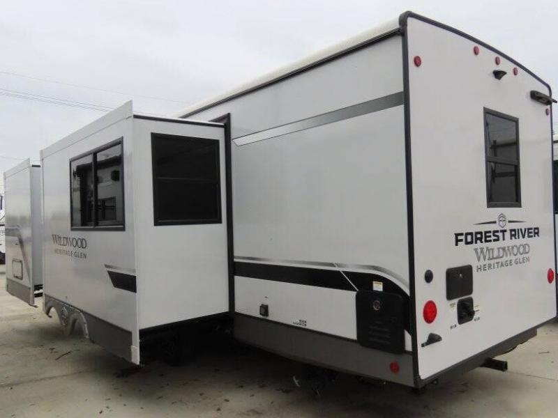 With any Wildwood Heritage Glen travel trailer by Forest River, the quality construction, attention to detail and design along with a bright and welcoming interior allows you to relax in comfort with conveniences while exploring outdoors. Each model includes a WeatherShield one piece fiberglass roof, Maxxis radial tires, and an enclosed underbelly with 12V tank heaters on all holding tanks for added protection. You will appreciate the on-demand tankless water heater, along with the 15K BTU Quite Cool A/C and 50 Amp service with a brace for a second A/C. There is an outside shower with hot and cold water, solar prep, a power tongue jack, plus many more exterior conveniences. Head inside to enjoy matte gold hardware, wood door casings in place of plastic door casings, and full length barreled ceilings for additional head room.