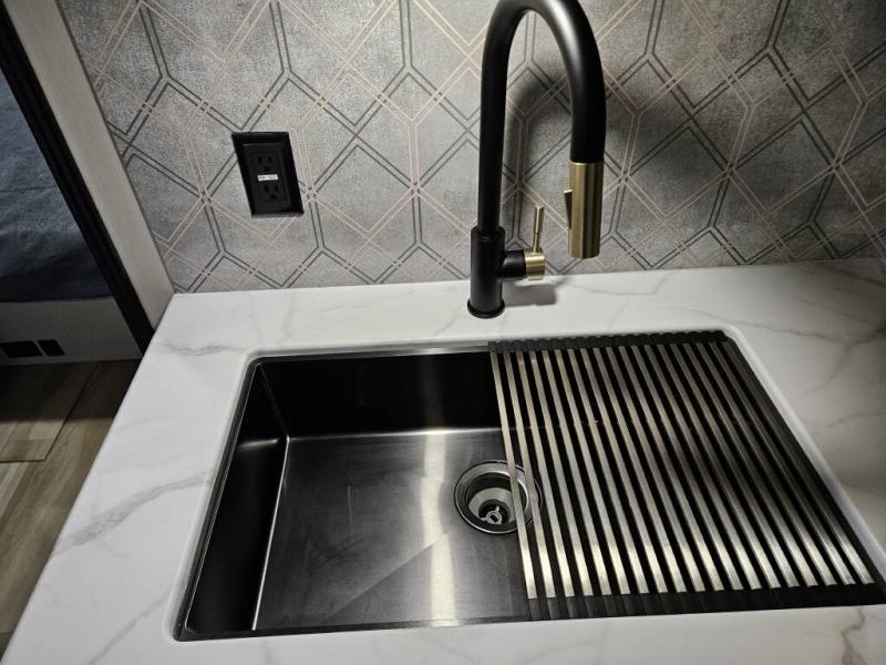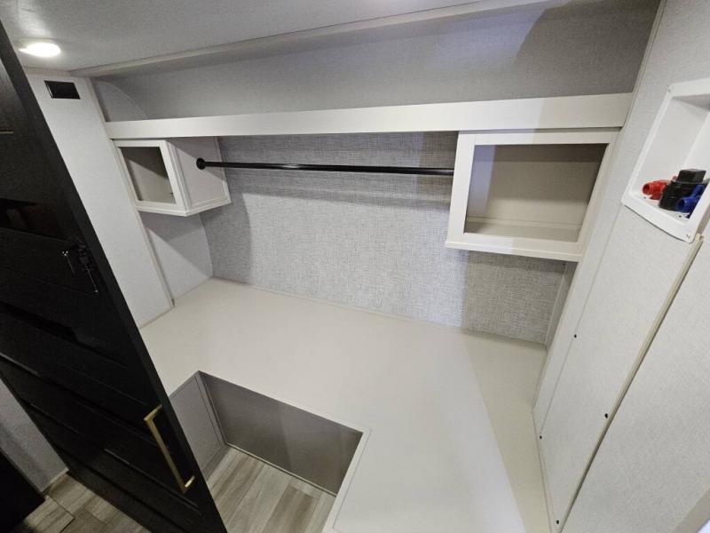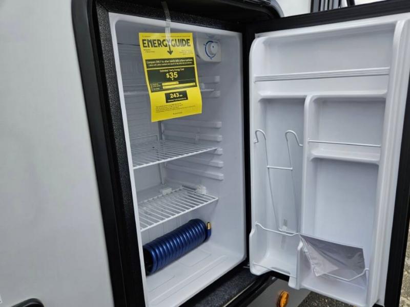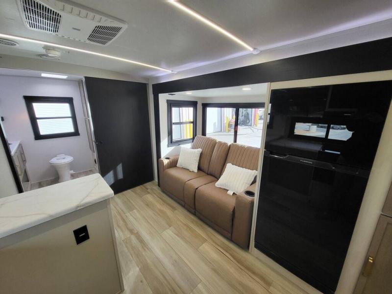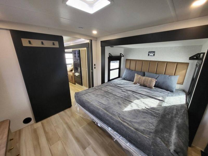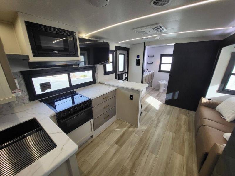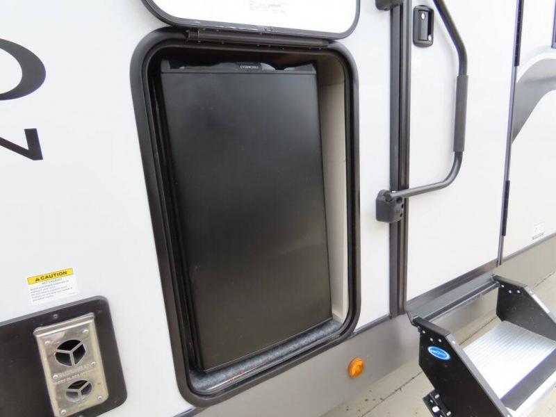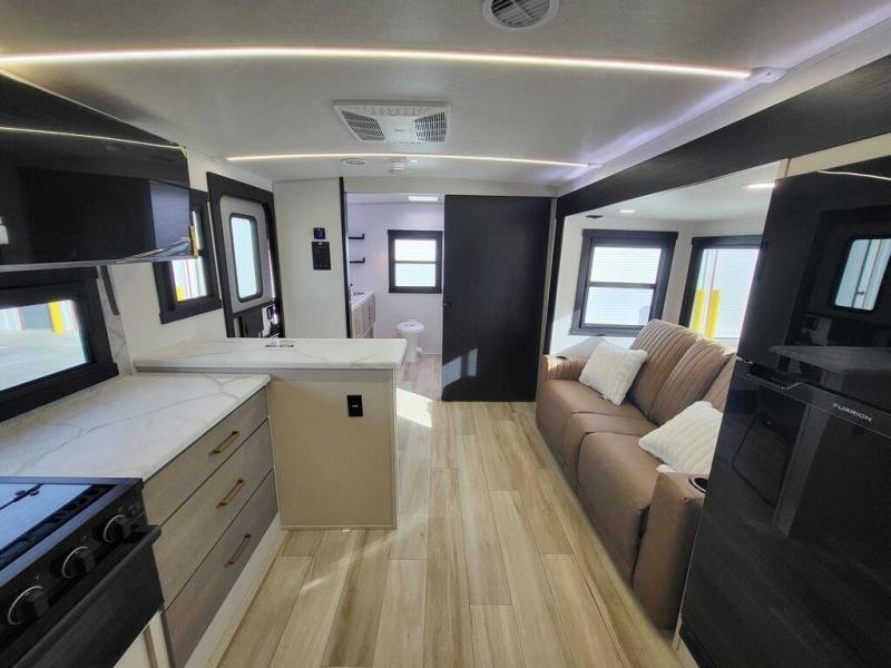 It won't be hard to find comfort in this dual entry travel trailer for two! The front bedroom includes one of the entry doors, a king bed slide out, and a large front wardrobe with washer and dryer prep if you want to add those appliances. You can relax in the main living room and combined kitchen that includes a large slide out and theater seating, or you can relax outside under the 21' awning! There is also an outside kitchen with a griddle and refrigerator if you enjoy cooking outdoors. Once you've headed back inside for the night, you can freshen up in the full rear bath before bed. Here, you'll find dual bath sinks, a linen closet, and a walk-in shower with skylights for more natural lighting!