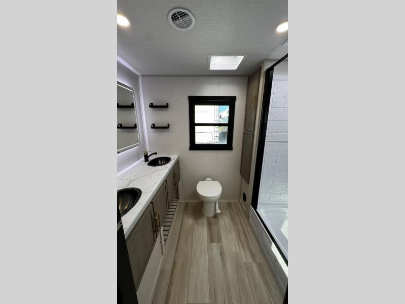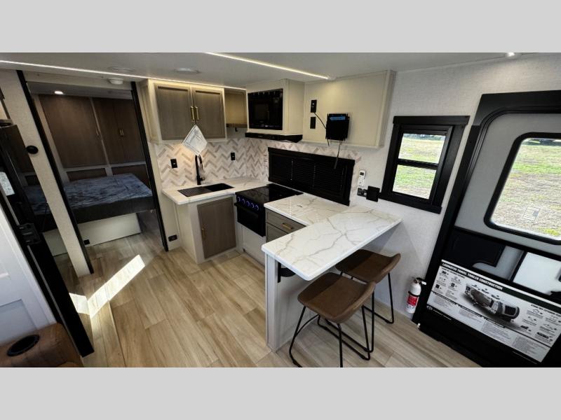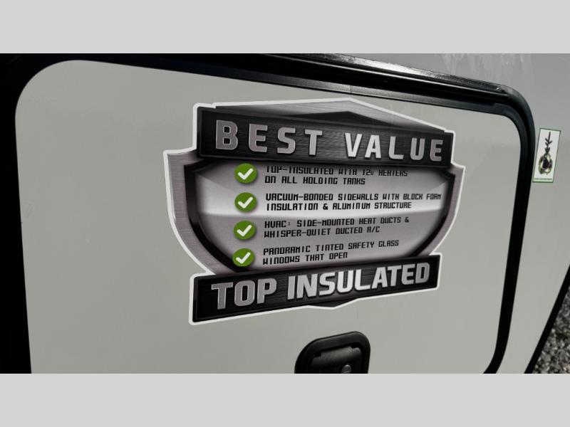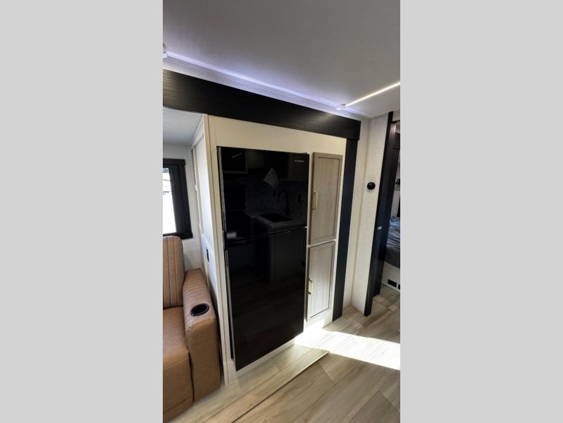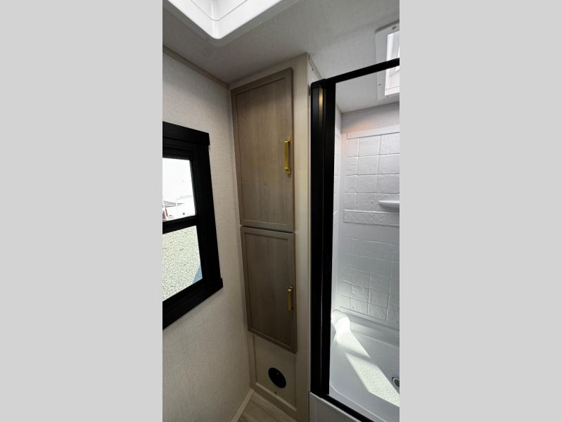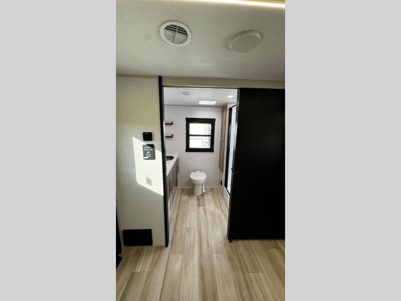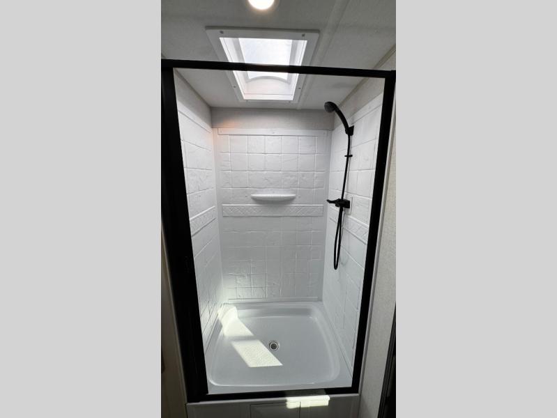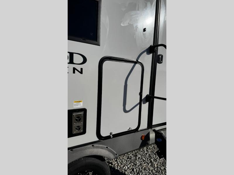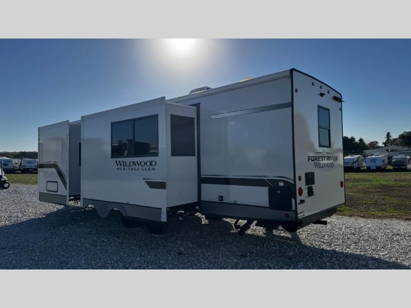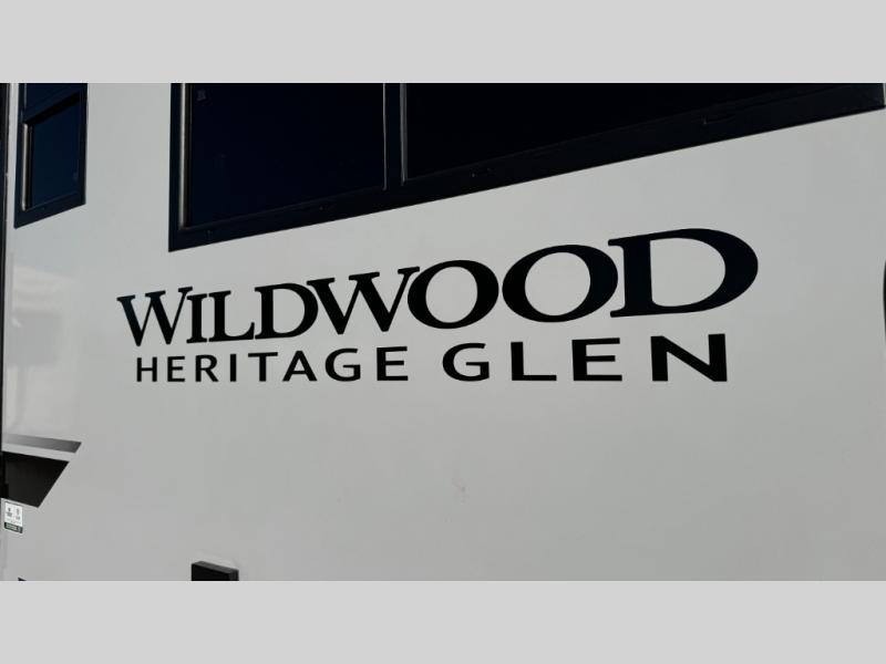 With any Wildwood Heritage Glen travel trailer by Forest River, the quality construction, attention to detail and design along with a bright and welcoming interior allows you to relax in comfort. Each model includes a WeatherShield one piece fiberglass roof, nitrogen-filled radial tires, and an enclosed underbelly with 12V tank heaters on all holding tanks for added protection. You will appreciate the on-demand tankless water heater, along with power stabilizer and tongue jacks, and an extra-large pass-thru storage with slam latch baggage doors. Head inside to enjoy matte gold hardware, wood door casings in place of plastic door casings, and an ultimate interior lighting upgrade with 4k puck/strip lights and a stylish LED back-lit bath mirror!