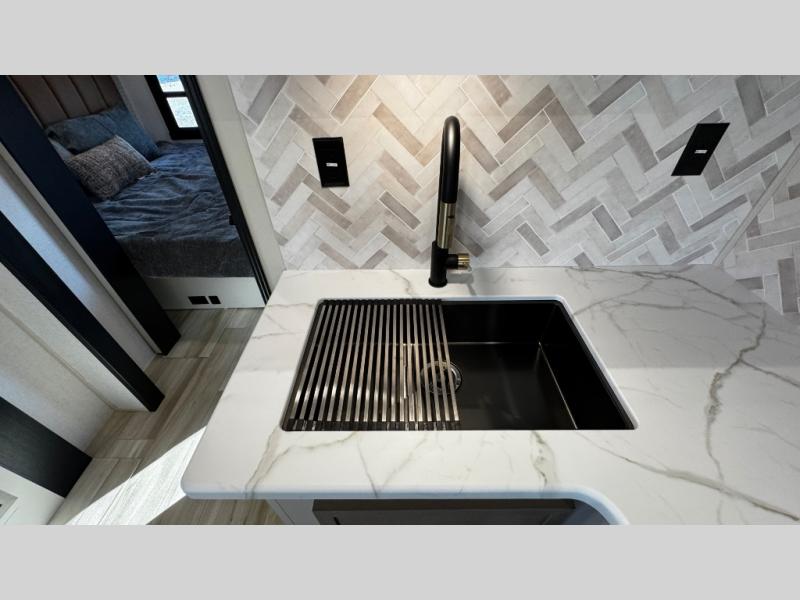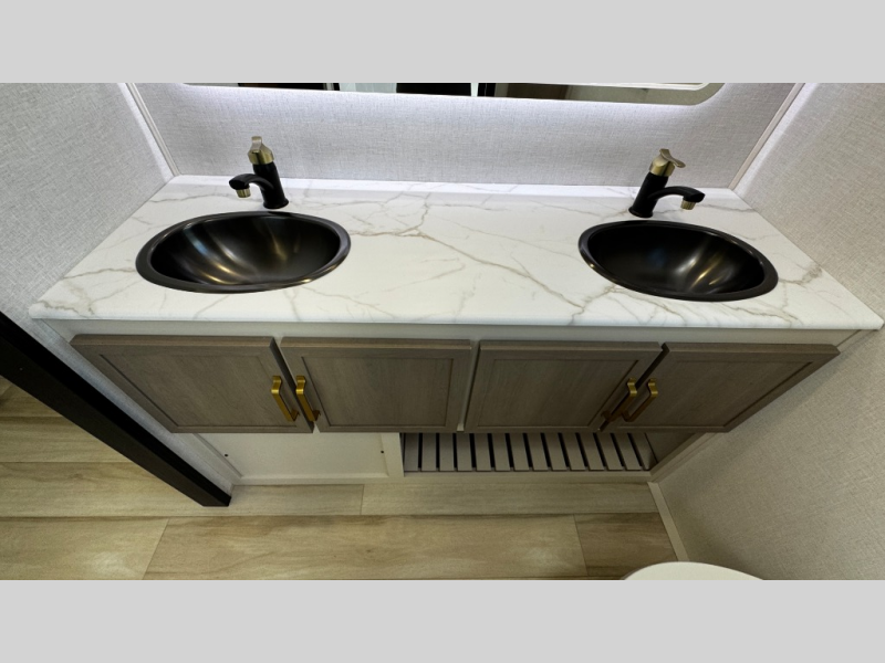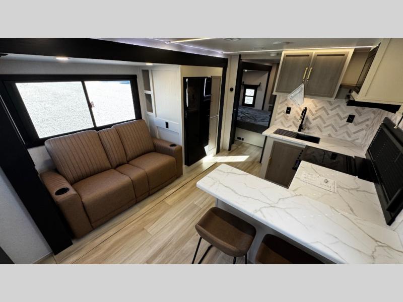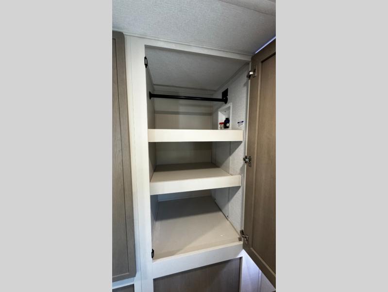 It won't be hard to find comfort in this dual entry travel trailer for two! The front bedroom includes one of the entry doors, a king bed slide out, and a large front wardrobe with washer and dryer prep if you want to add those appliances. You can relax in the main living room and combined kitchen that includes a large slide out and theater seating, or you can relax outside under the 21' awning! Once you've headed back inside for the night, you can freshen up in the full rear bath before bed. Here, you'll find dual bath sinks, a linen closet, and a walk-in shower with skylights for more natural lighting!