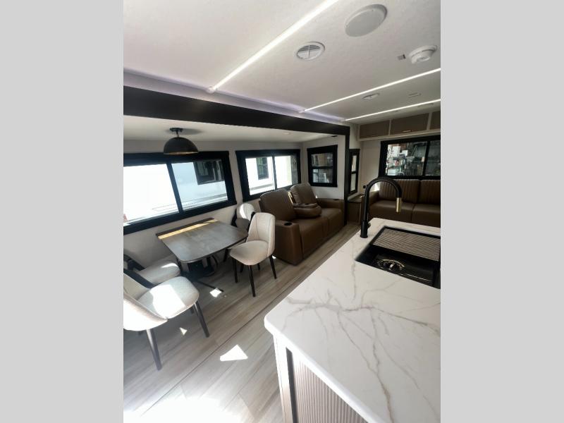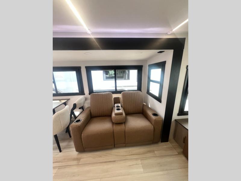 How does sleeping in your own queen bed with Versa Tilt each night after exploring outdoors away from home sound to you? In this Wildwood Heritage Glen travel trailer, the private bedroom up front offers just that plus dual wardrobes and a closet to stow away all of your clothing, blankets, and such. When you wake up the next morning, head to the spacious living area and kitchen that has dual opposing slides. The booth dinette, tri-fold sofa, and theatre seats offer plenty of seating when you have friends, plus they offer sleeping space as well. The TV and fireplace provide inside entertainment and comfort, and the two awnings offer an outdoor living area. You will also find an exterior coax/TV hookup and a Texas-size pass-through compartment to store your outdoor gear.