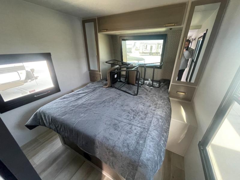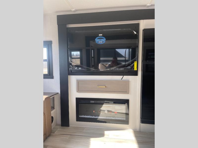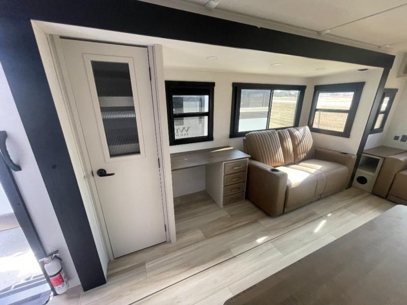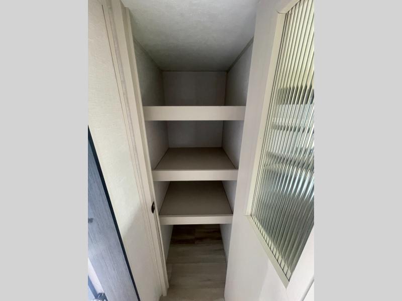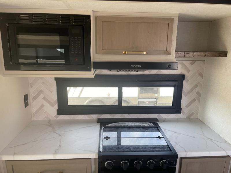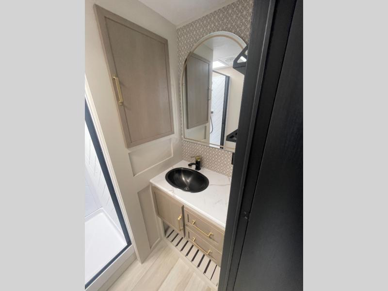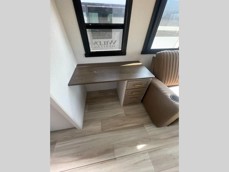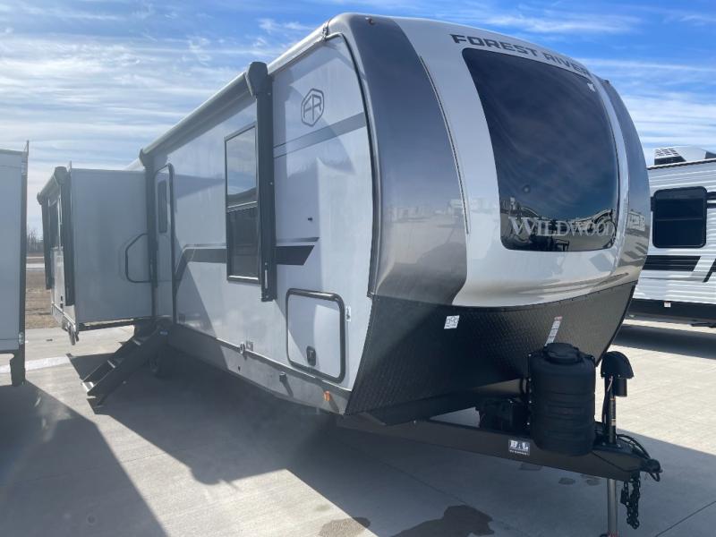 With any Wildwood Heritage Glen travel trailer by Forest River, the quality construction, attention to detail and design along with a bright and welcoming interior allows you to relax in comfort. Each model includes a WeatherShield one piece fiberglass roof, nitrogen-filled radial tires, and an enclosed underbelly with 12V tank heaters on all holding tanks for added protection. You will appreciate the on-demand tankless water heater, along with power stabilizer and tongue jacks, and an extra-large pass-thru storage with slam latch baggage doors. Head inside to enjoy matte gold hardware, wood door casings in place of plastic door casings, and an ultimate interior lighting upgrade with 4k puck/strip lights and a stylish LED back-lit bath mirror!