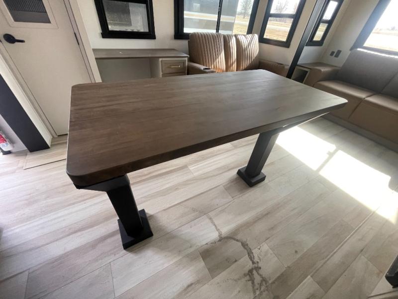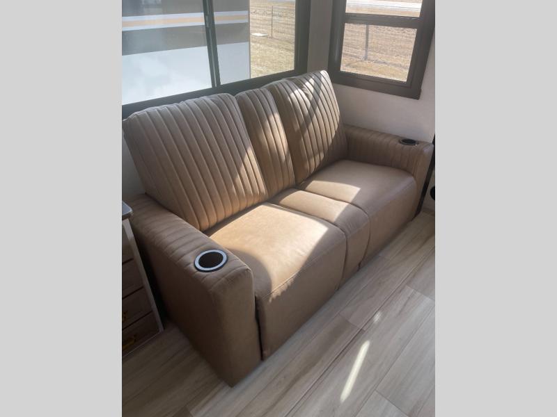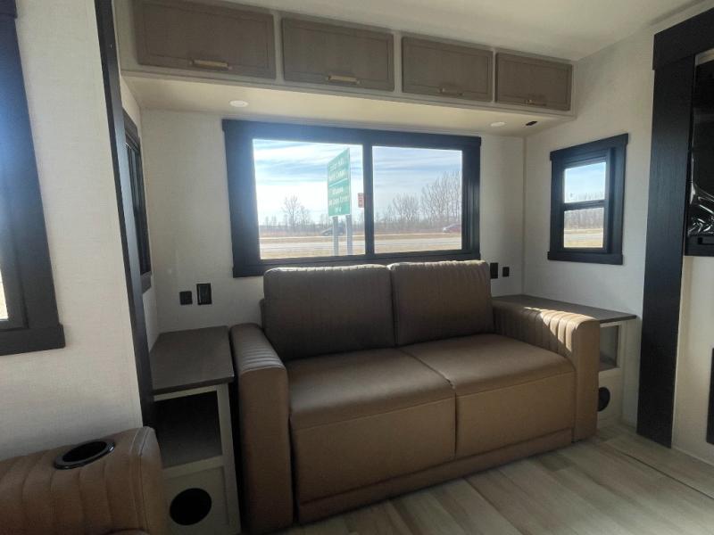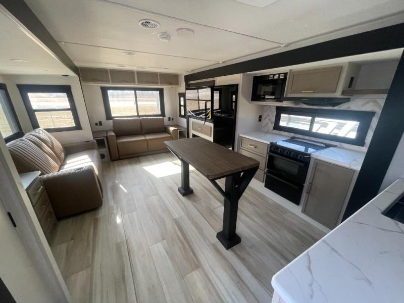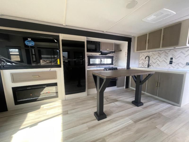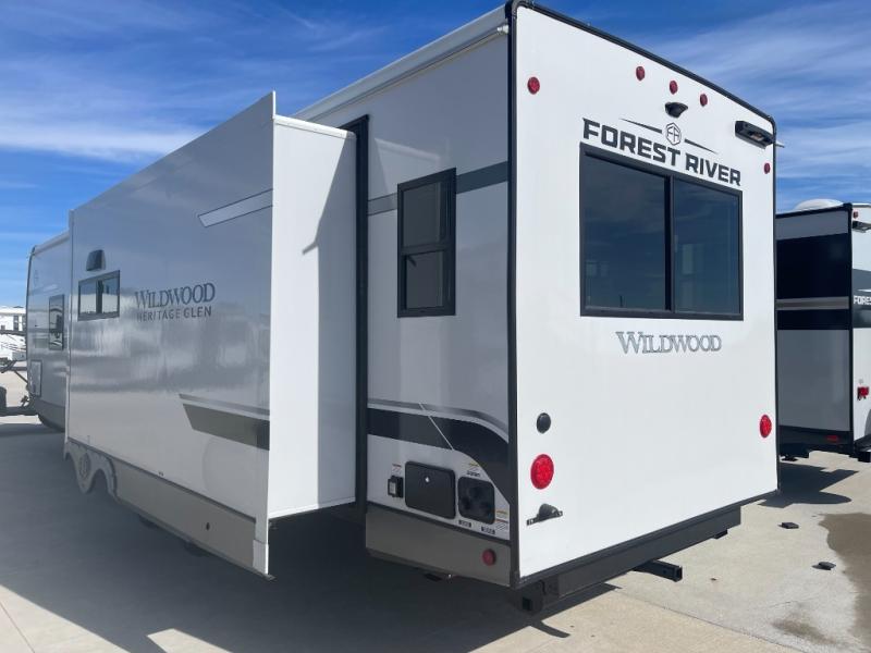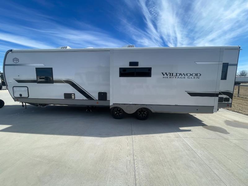 It's time to head to your destination with this Wildwood Heritage Glen travel trailer, whether it be a state park, RV resort, or your own land. Once you arrive, you can easily open up the dual opposing slides for more interior space and start planning your day. You might like to cook a meal, wash dishes using the kitchen island, and dine at the booth dinette, or you can choose the free-standing table option instead. Your guests may choose to relax in the theatre seats or the tri-fold sofa while watching TV, and the outside kitchen/bar will surely be a useful area when wanting to be outside. Don't worry about storage because the extra large pass-through compartment is available for your camping chairs, tables, fishing rods, and such.