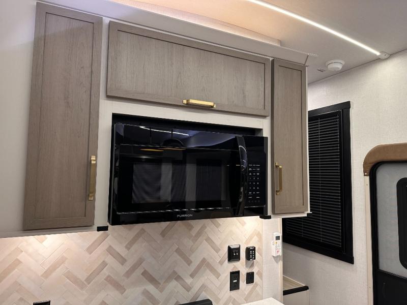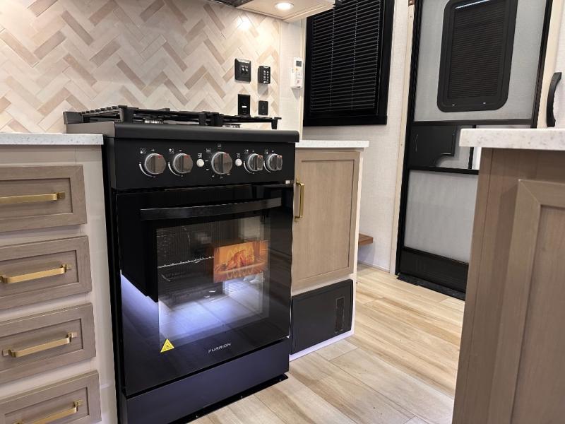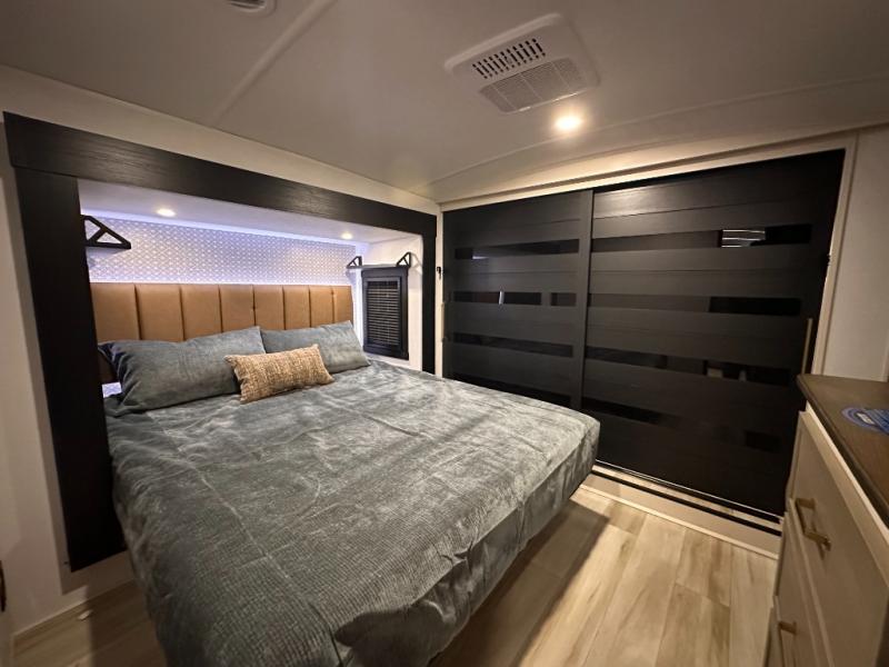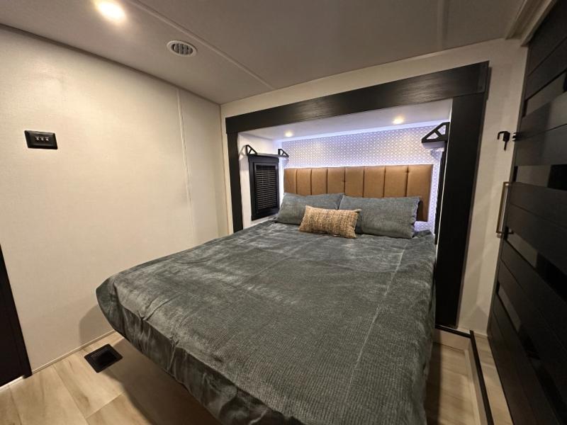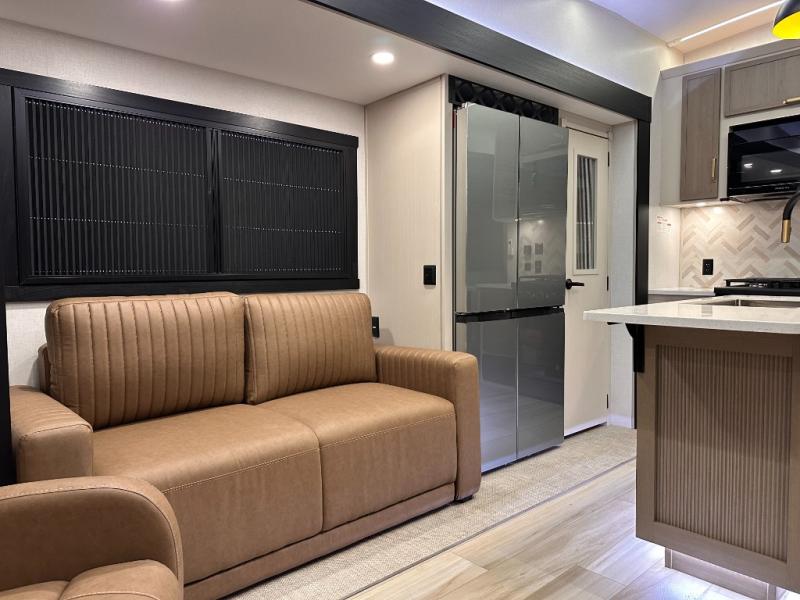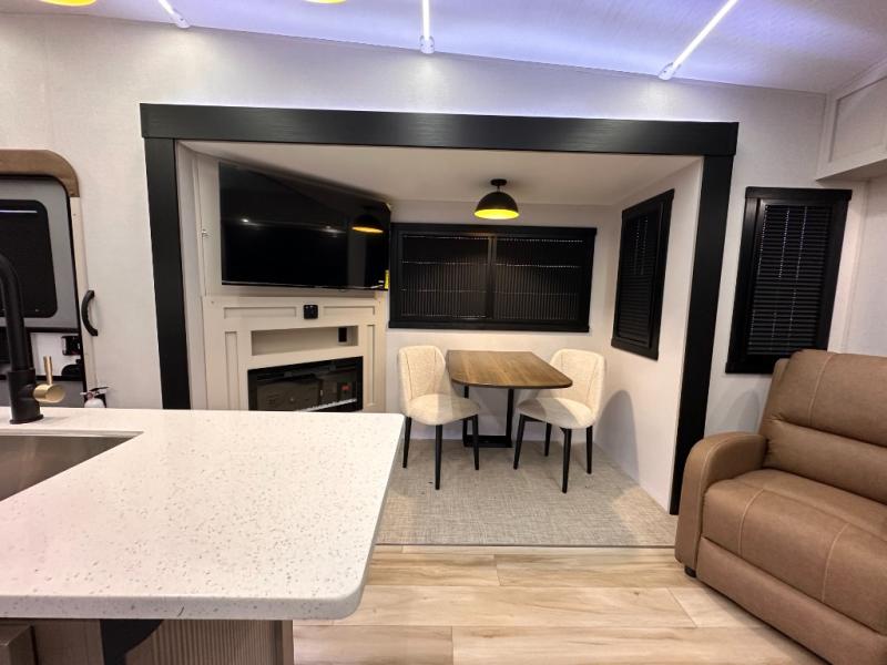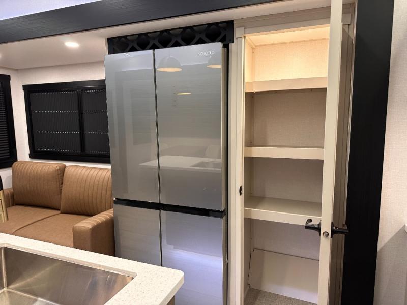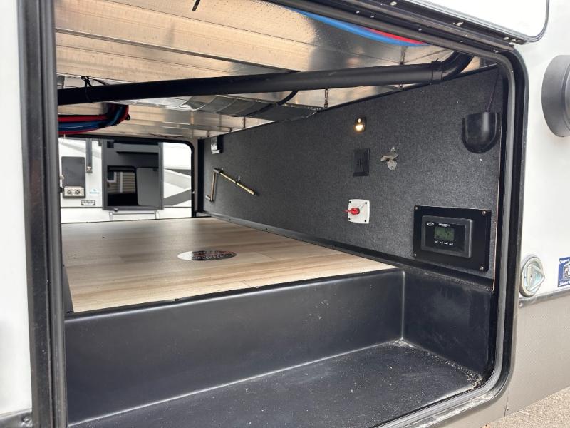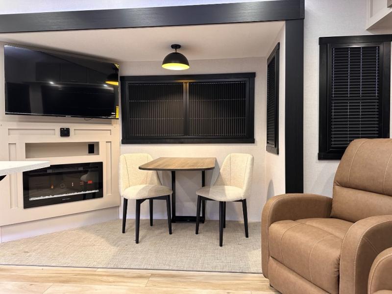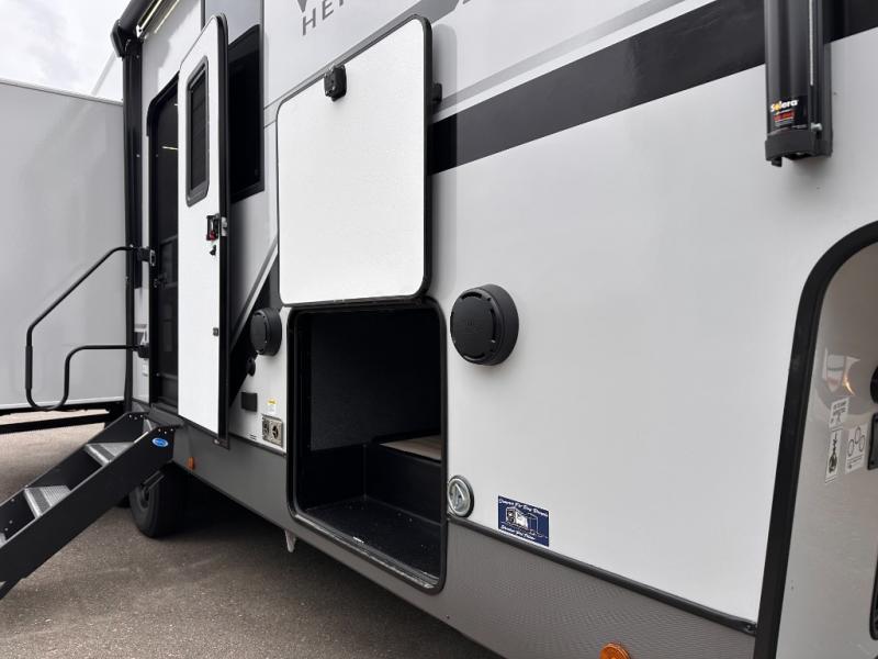 Whether you enjoy being outside or inside, this Wildwood Heritage Glen fifth wheel gives you the best of both! Imagine relaxing in a chair or on the tri-fold sofa and being able to look out panoramic windows at the scenery. Or, you might like to watch a show on the 50" LED TV with a fireplace below, and you can dine at the table and chairs that allows you to move the chairs if needed. The 16-cubic foot 12V refrigerator next to the pantry will allow you to stock up on ingredients and cold beverages for a long trip, and you will appreciate the custom king bed slide and the residential walk-in shower after being outside all day, even if just under the 13' awning. There is plenty of storage in the master bedroom and throughout, plus the XL Texas size pass-through compartment will surely come in handy for your charcoal, outdoor games, and such.