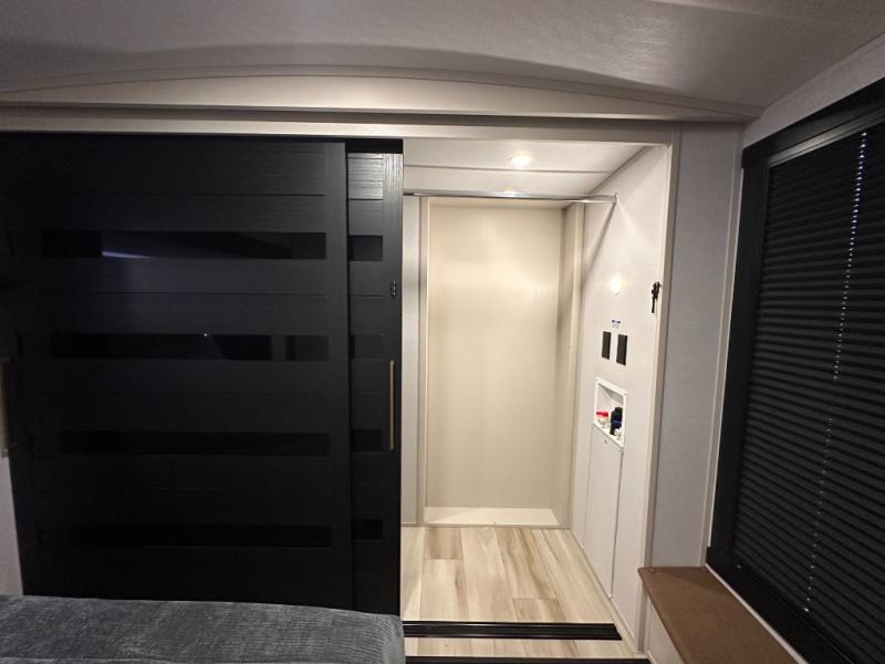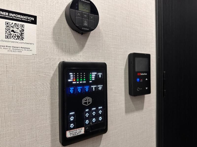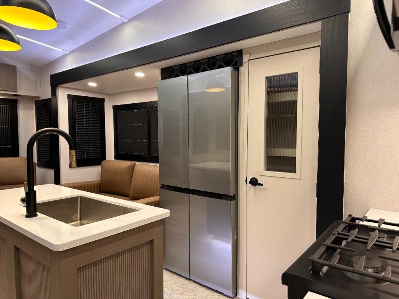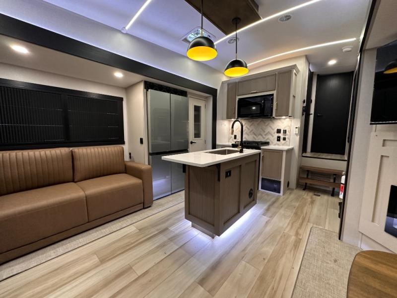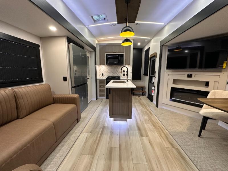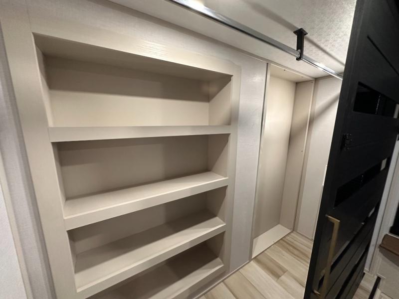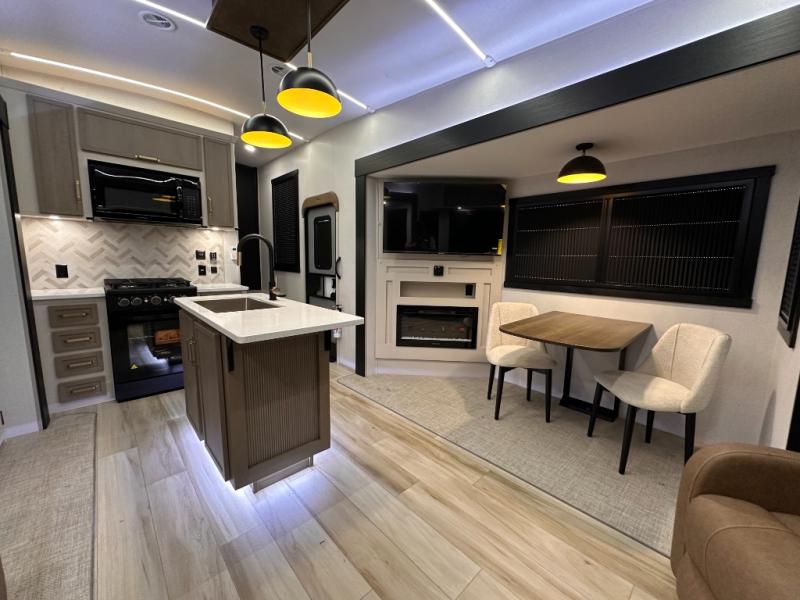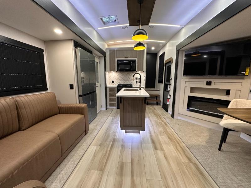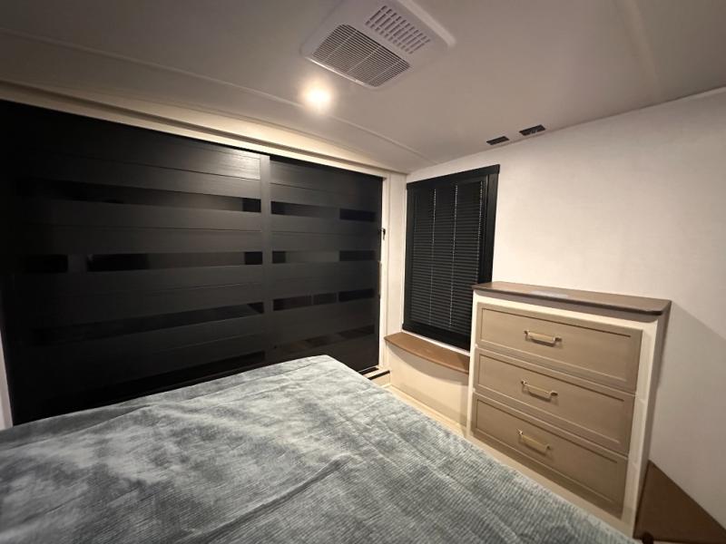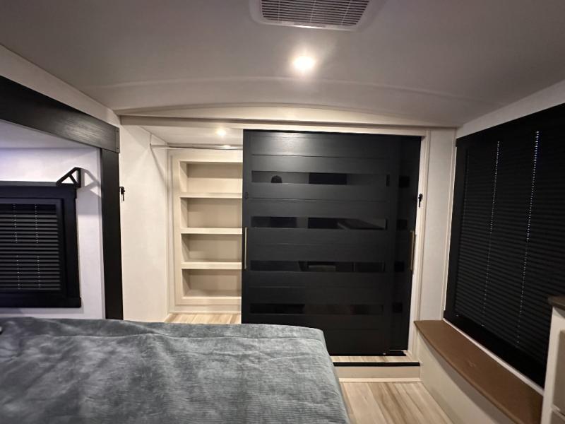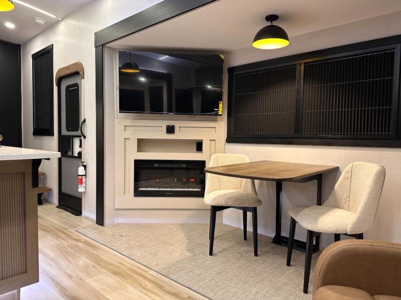 Whether you enjoy being outside or inside, this Wildwood Heritage Glen fifth wheel gives you the best of both! Imagine relaxing in a chair or on the tri-fold sofa and being able to look out panoramic windows at the scenery. Or, you might like to watch a show on the 50" LED TV with a fireplace below, and you can dine at the table and chairs that allows you to move the chairs if needed. The 16-cubic foot 12V refrigerator next to the pantry will allow you to stock up on ingredients and cold beverages for a long trip, and you will appreciate the custom king bed slide and the residential walk-in shower after being outside all day, even if just under the 13' awning. There is plenty of storage in the master bedroom and throughout, plus the XL Texas size pass-through compartment will surely come in handy for your charcoal, outdoor games, and such.