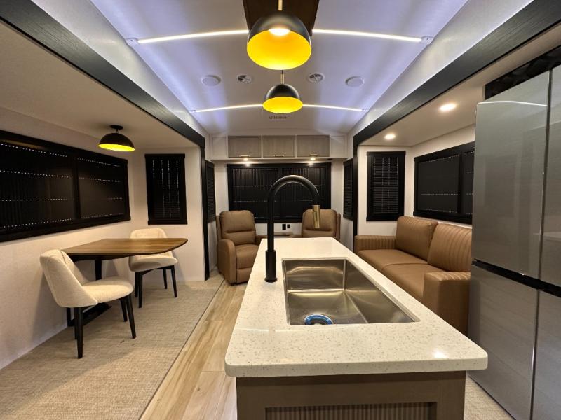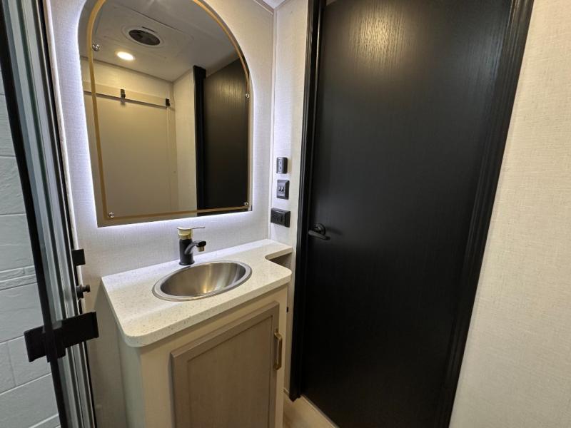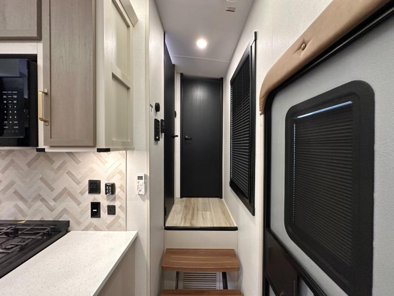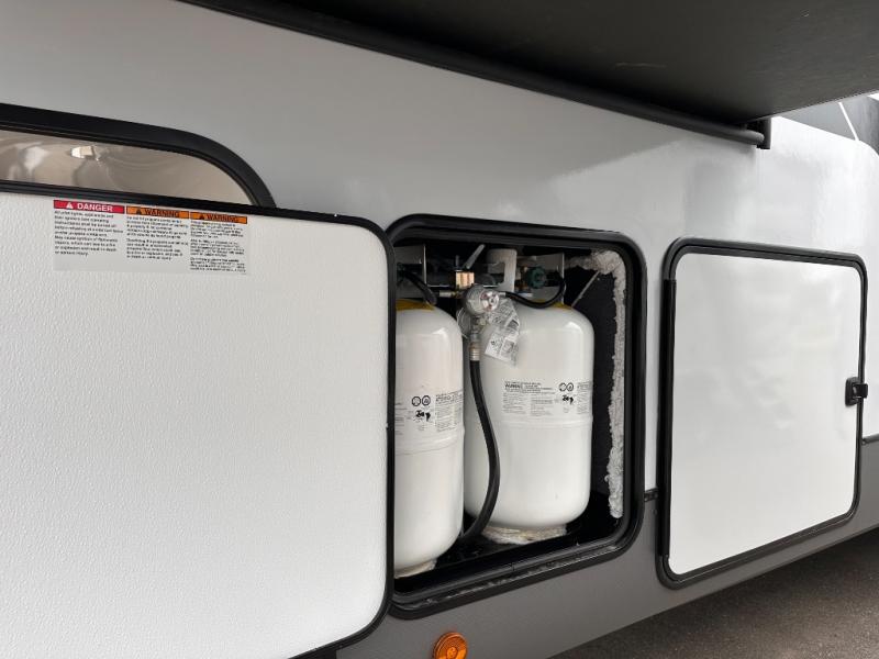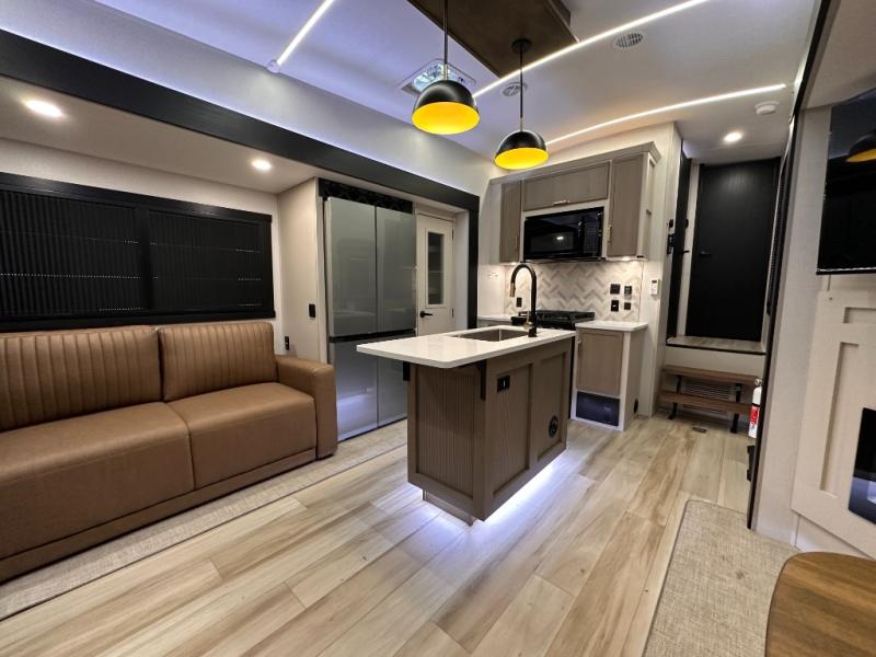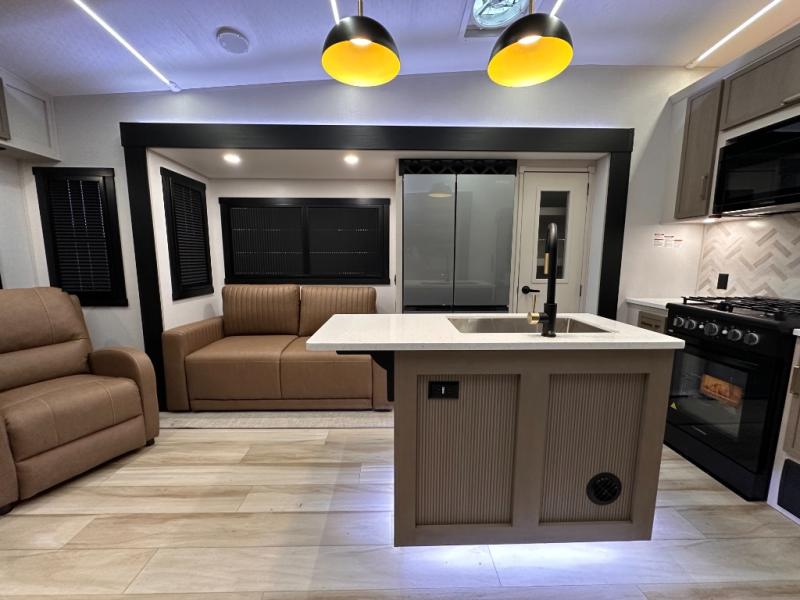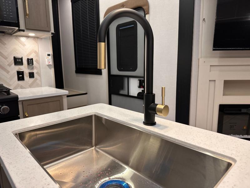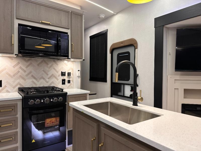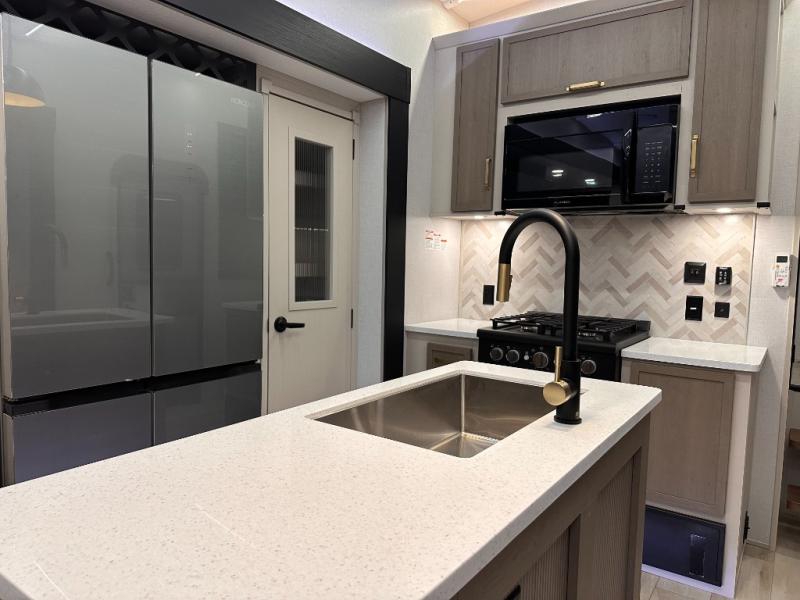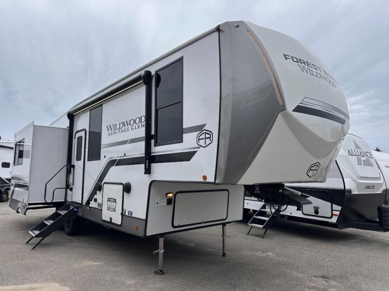 With any Wildwood Heritage Glen fifth wheel by Forest River, the quality construction, attention to detail and design along with a bright and welcoming interior allows you to relax in comfort with conveniences while exploring outdoors. The Summer Wind colored horizontal plank linoleum flooring is unique, beautiful and durable, and there are gold-accented faucets with stainless steel sinks in the bathrooms for added luxury. The Accessibelly underbelly with 12V tank heaters will help protect your unit from the elements, and the power stabilizer jacks and landing gear will make set-up a breeze. More features that provide convenience include the high-end solid surface countertops, an RV Airflow System that provides at least 25% better airflow, and solar prep for off-grid capabilities.