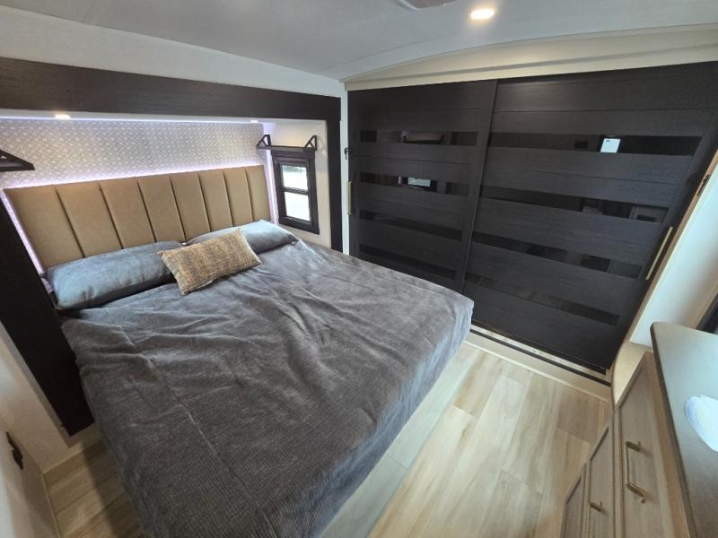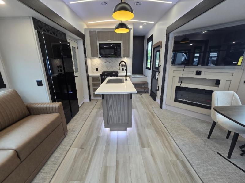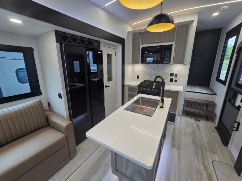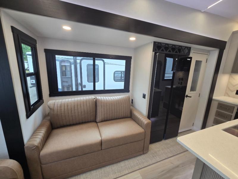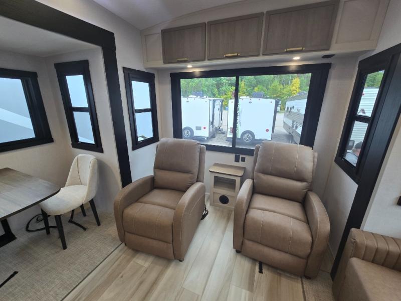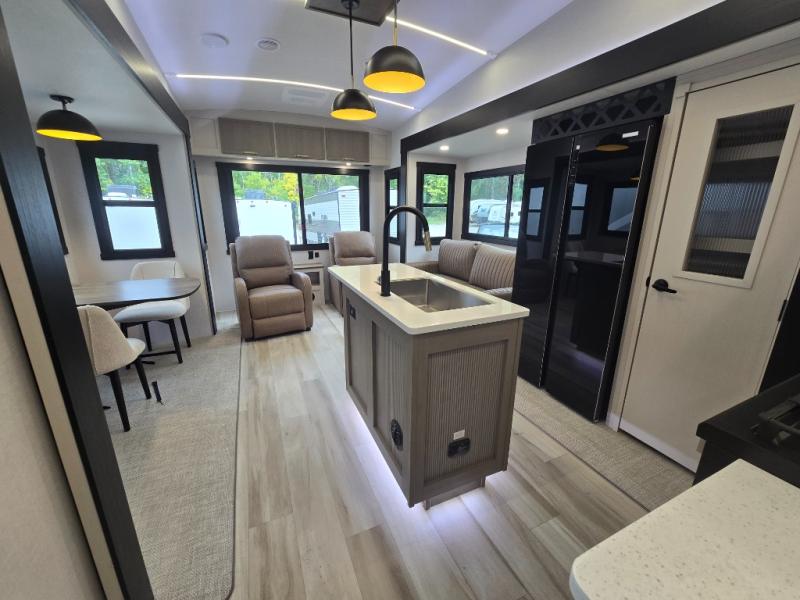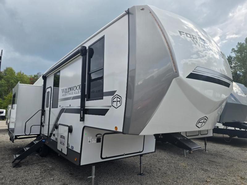 With any Wildwood Heritage Glen fifth wheel by Forest River, the quality construction, attention to detail and design along with a bright and welcoming interior allows you to relax in comfort. You'll love the high-end solid surface countertops included in the Elevated Value Package, along with a JBL sound system, full-length barreled ceilings, and an ultimate interior lighting upgrade. The included Expedition Package features an Accesibelly underbelly panel with 12V tank heaters, nitrogen-filled tires with aluminum rims, and a spacious 30" wide main entry door with a window. The Lippert On-The-Go ladder prep and back-up camera prep let you customize your fifth wheel even more, and the LED awning, front cap, marker and taillights will make it easier than ever to set up camp!