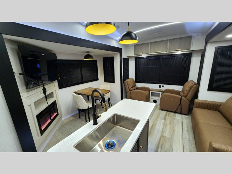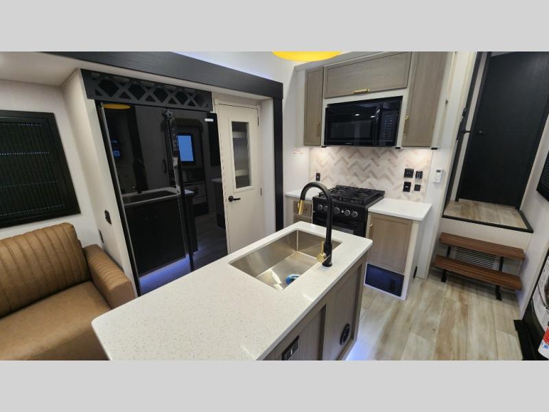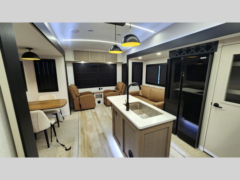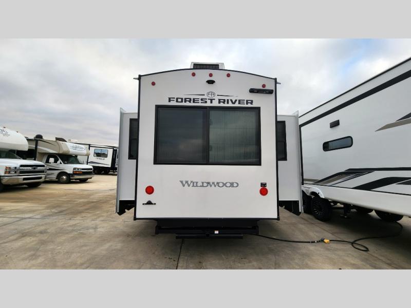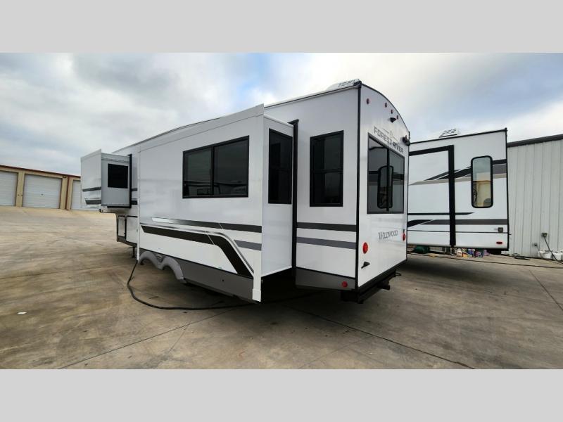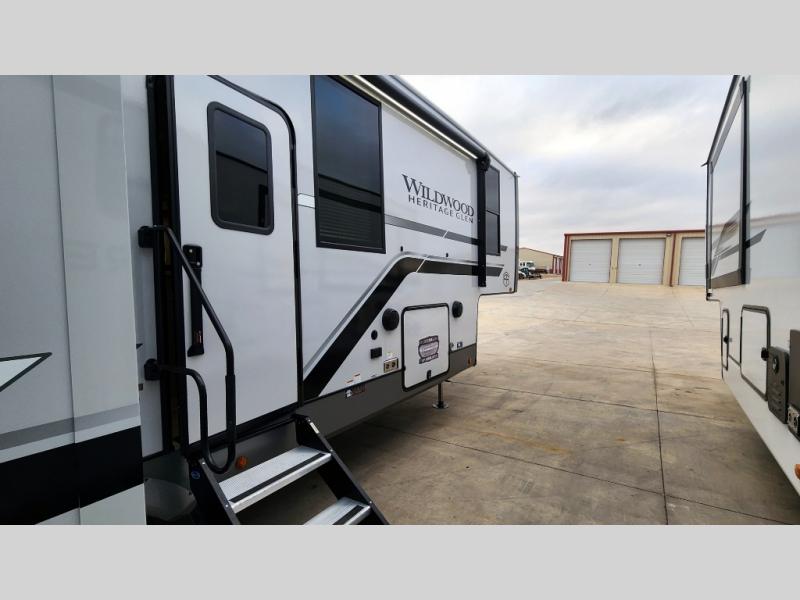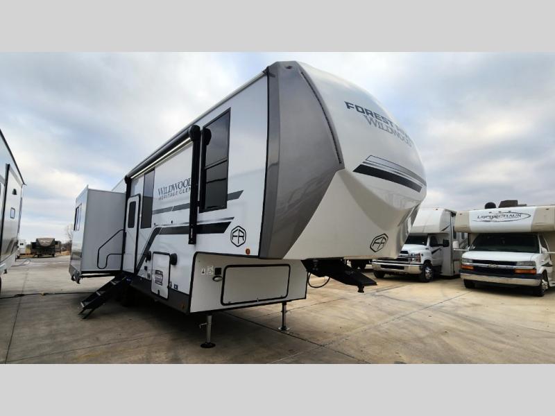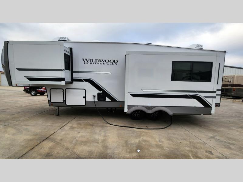 With any Wildwood Heritage Glen fifth wheel by Forest River, the quality construction, attention to detail and design along with a bright and welcoming interior allows you to relax in comfort. You'll love the high-end solid surface countertops included in the Elevated Value Package, along with a JBL sound system, full-length barreled ceilings, and an ultimate interior lighting upgrade. The included Expedition Package features an Accesibelly underbelly panel with 12V tank heaters, nitrogen-filled tires with aluminum rims, and a spacious 30" wide main entry door with a window. The Lippert On-The-Go ladder prep and back-up camera prep let you customize your fifth wheel even more, and the LED awning, front cap, marker and taillights will make it easier than ever to set up camp!