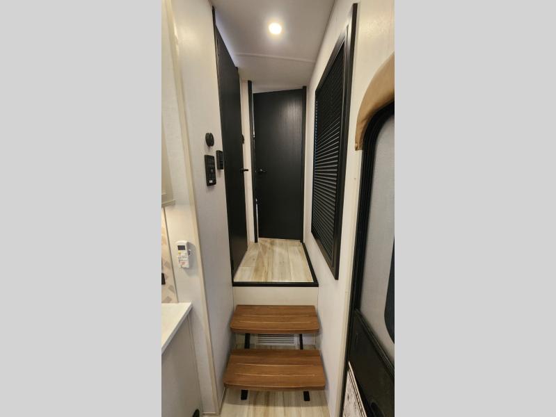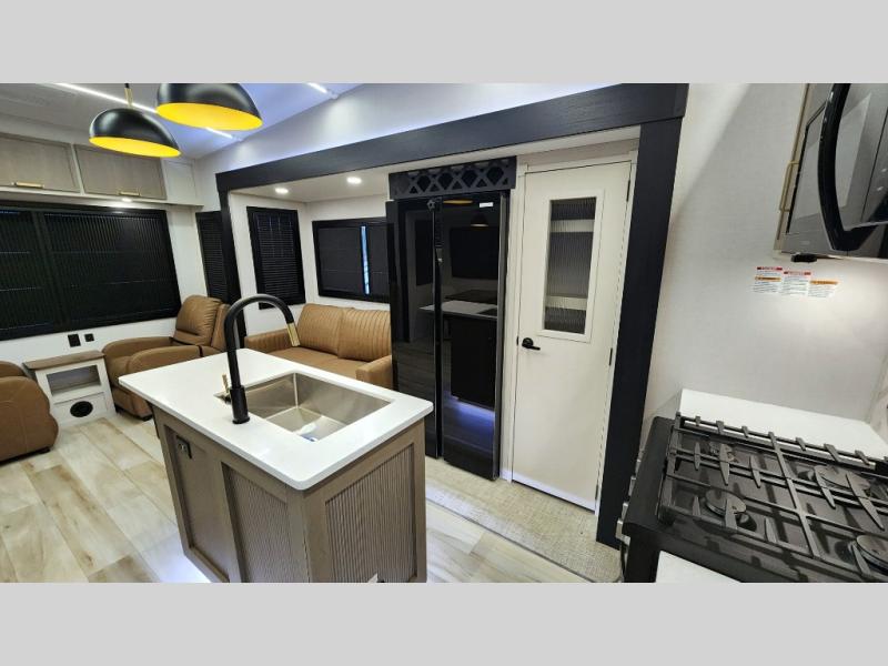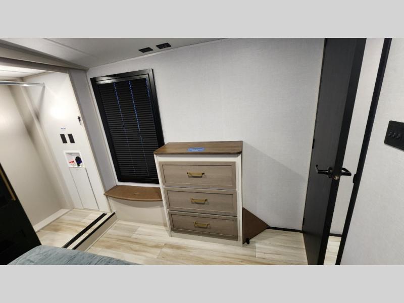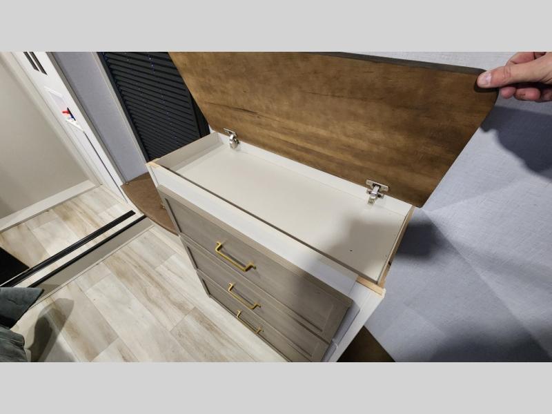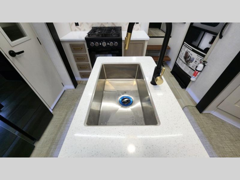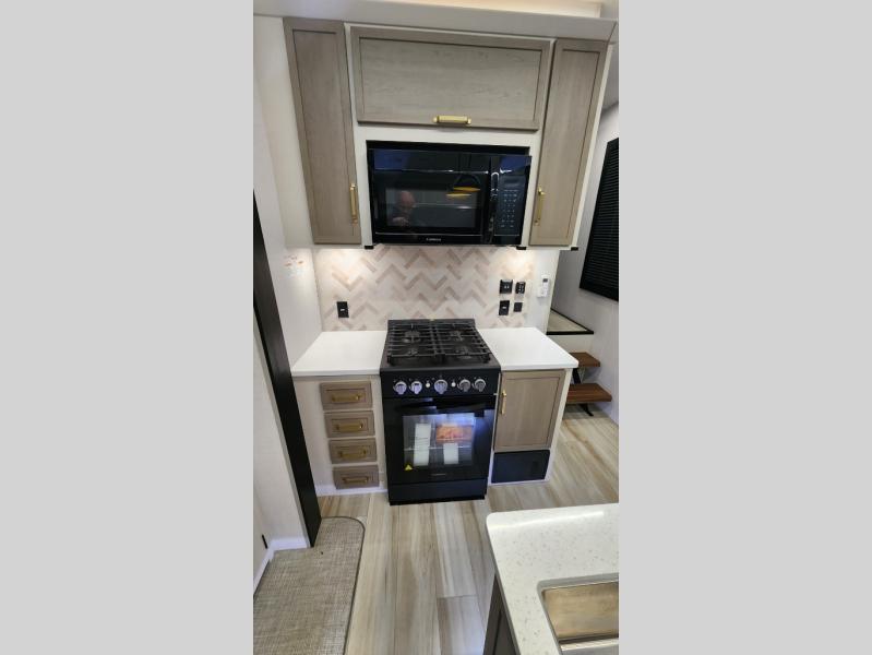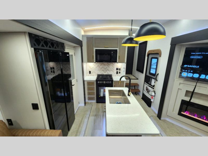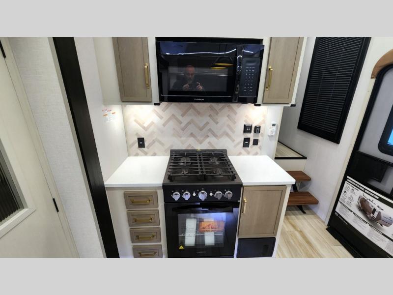 With any Wildwood Heritage Glen fifth wheel by Forest River, the quality construction, attention to detail and design along with a bright and welcoming interior allows you to relax in comfort. You'll love the high-end solid surface countertops included in the Elevated Value Package, along with a JBL sound system, full-length barreled ceilings, and an ultimate interior lighting upgrade. The included Expedition Package features an Accesibelly underbelly panel with 12V tank heaters, nitrogen-filled tires with aluminum rims, and a spacious 30" wide main entry door with a window. The Lippert On-The-Go ladder prep and back-up camera prep let you customize your fifth wheel even more, and the LED awning, front cap, marker and taillights will make it easier than ever to set up camp!