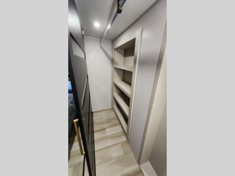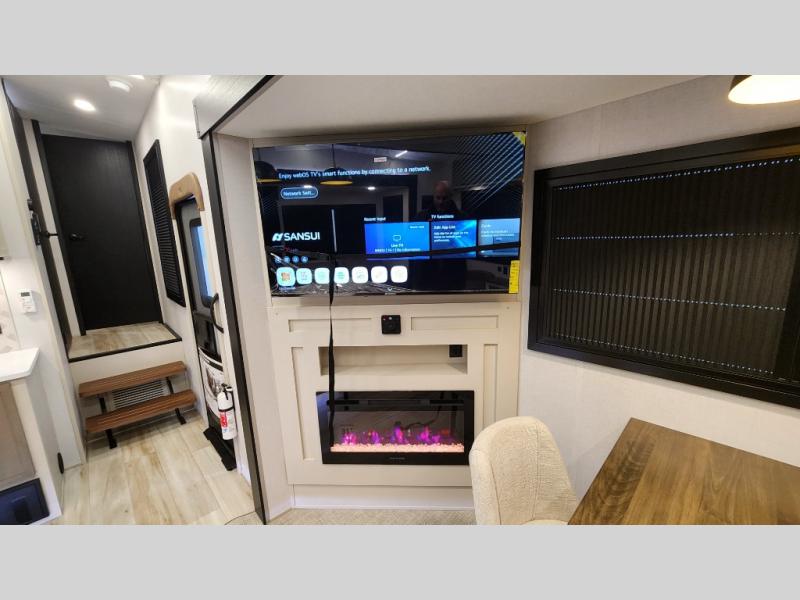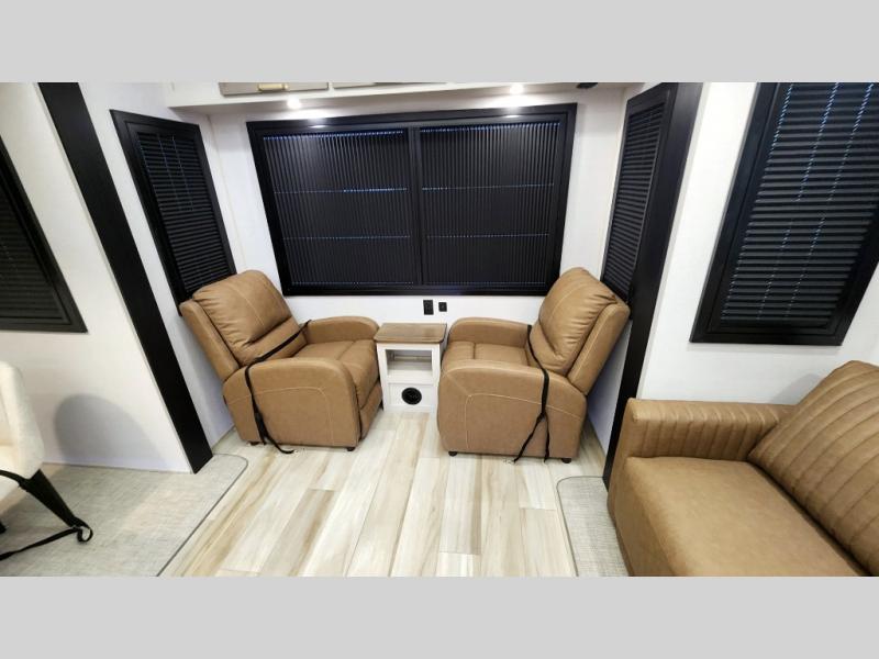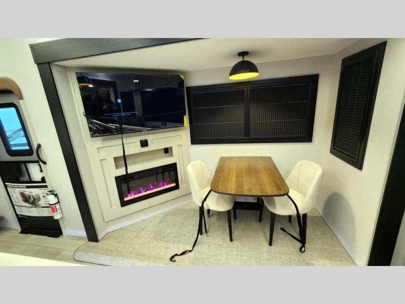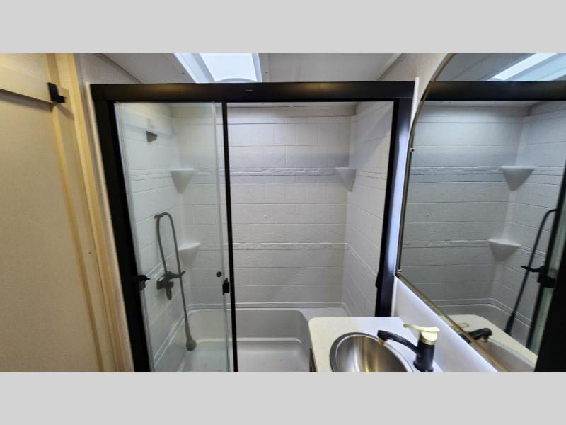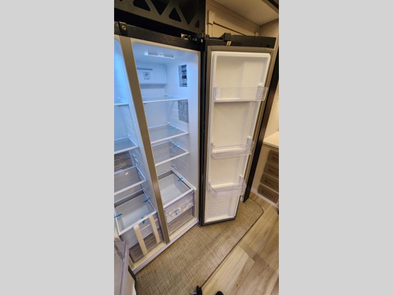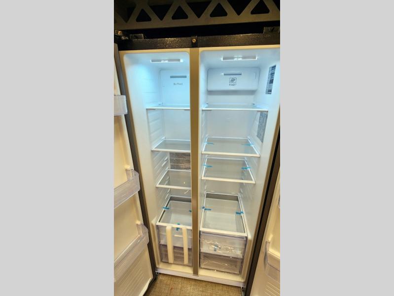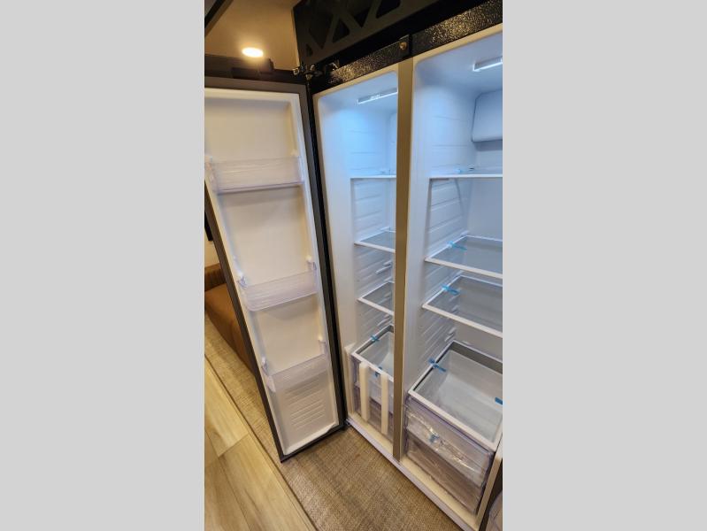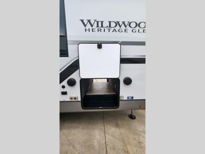 Whether you enjoy being outside or inside, this Wildwood Heritage Glen fifth wheel gives you the best of both! Imagine relaxing in a chair or on the tri-fold sofa and being able to look out panoramic windows at the scenery. Or, you might like to watch a show on the 50" LED TV with a fireplace below, and you can dine at the table and chairs that allows you to move the chairs if needed. The 16-cubic foot 12V refrigerator next to the pantry will allow you to stock up on ingredients and cold beverages for a long trip, and you will appreciate the custom king bed slide and the residential walk-in shower after being outside all day, even if just under the 13' awning. There is plenty of storage in the master bedroom and throughout, plus the XL Texas size pass-through compartment will surely come in handy for your charcoal, outdoor games, and such.