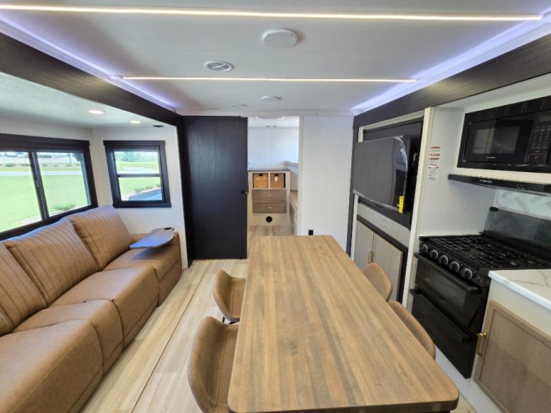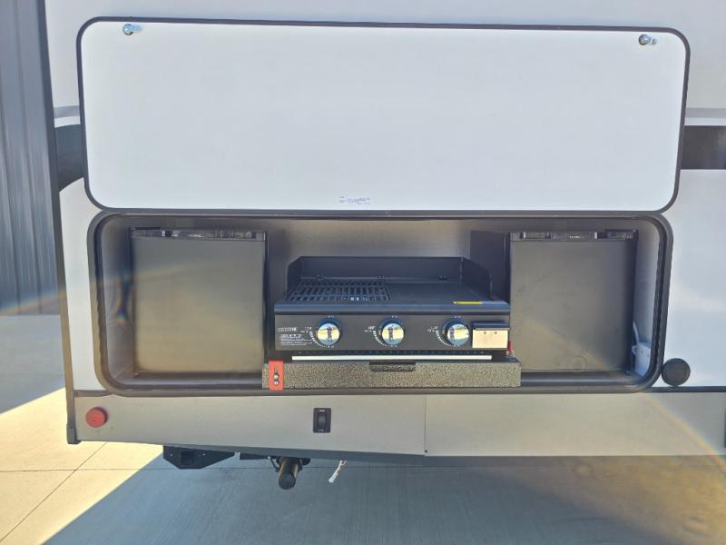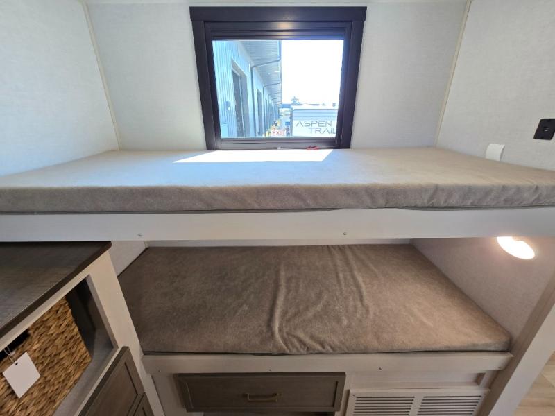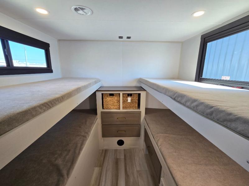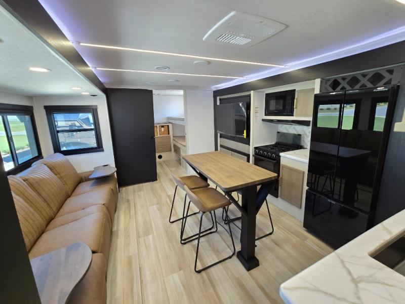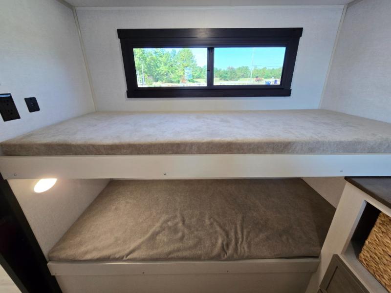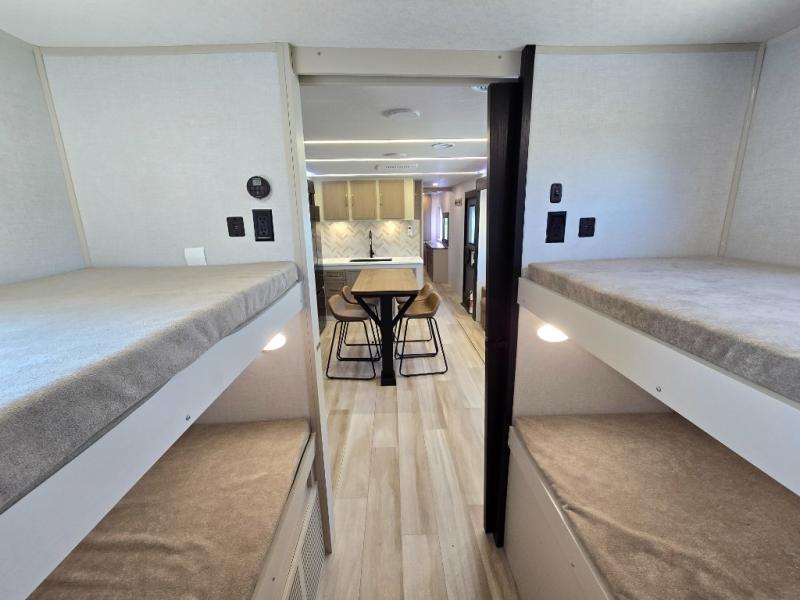 This is the perfect travel trailer if you enjoy camping with a larger group! The rear private bunkhouse includes four bunk beds plus a dresser to keep this space tidy. You'll have the queen bed slide out in the front bedroom all to yourselves, along with a dresser and an ottoman, plus a front wardrobe with washer/dryer prep. Everyone can meet in the combined kitchen and living area that includes spacious theater seating, a kitchen island with four chairs, full kitchen amenities, and dual opposing slides for more space!