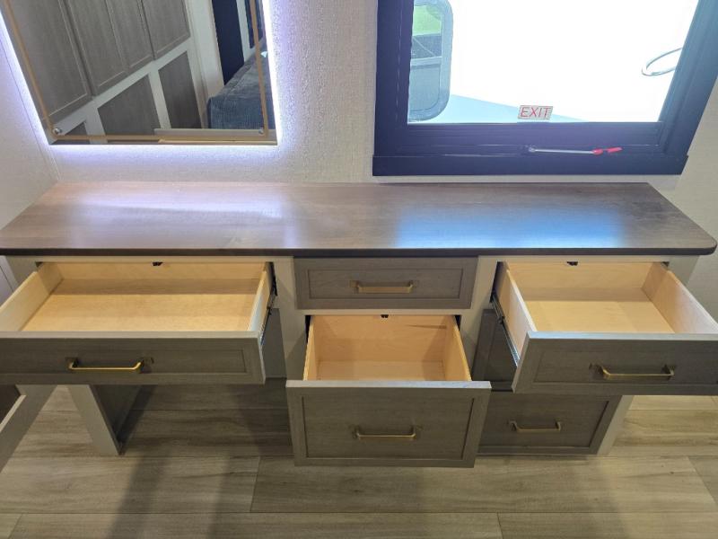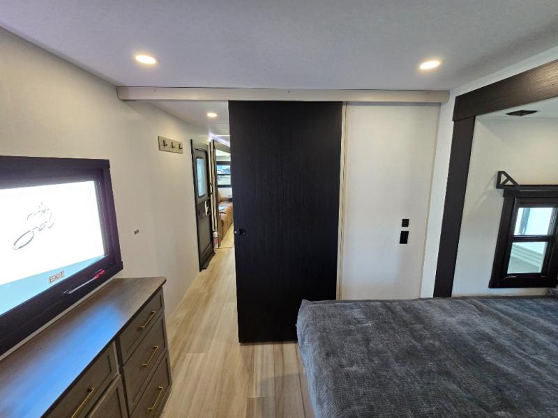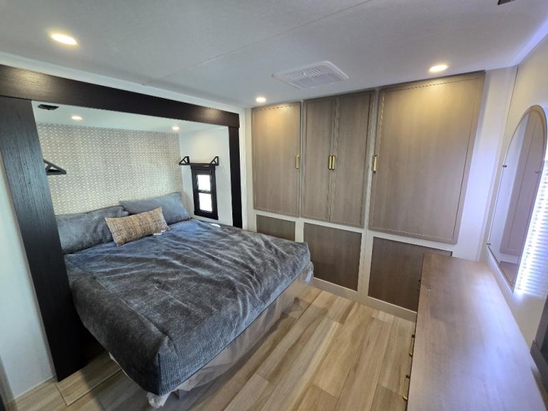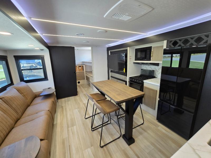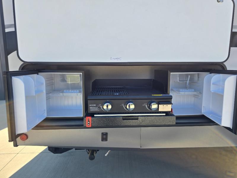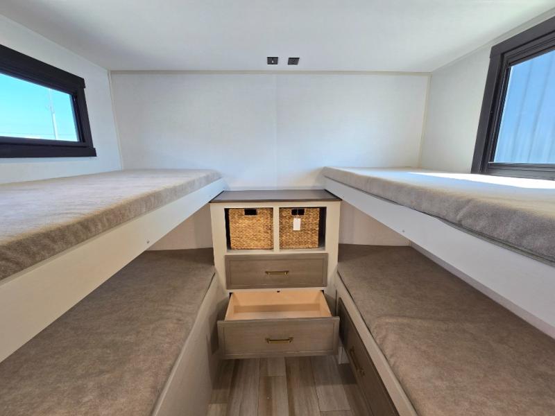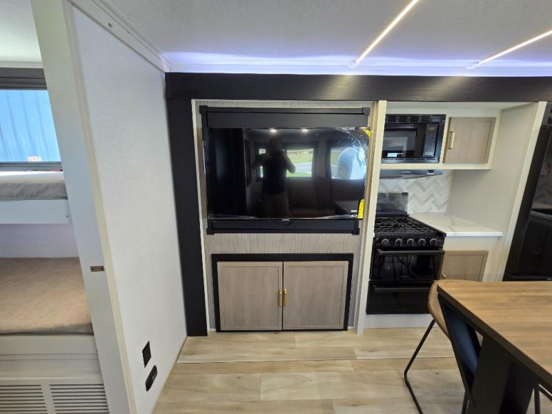 This is the perfect travel trailer if you enjoy camping with a larger group! The rear private bunkhouse includes four bunk beds plus a dresser to keep this space tidy. You'll have the queen bed slide out in the front bedroom all to yourselves, along with a dresser and an ottoman, plus a front wardrobe with washer/dryer prep. Everyone can meet in the combined kitchen and living area that includes spacious theater seating, a kitchen island with four chairs, full kitchen amenities, and dual opposing slides for more space!