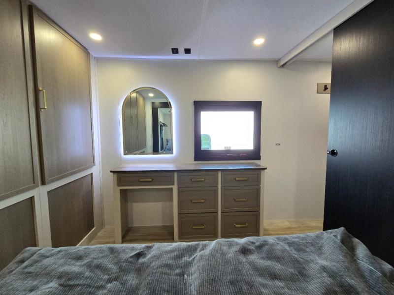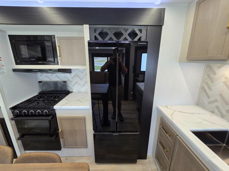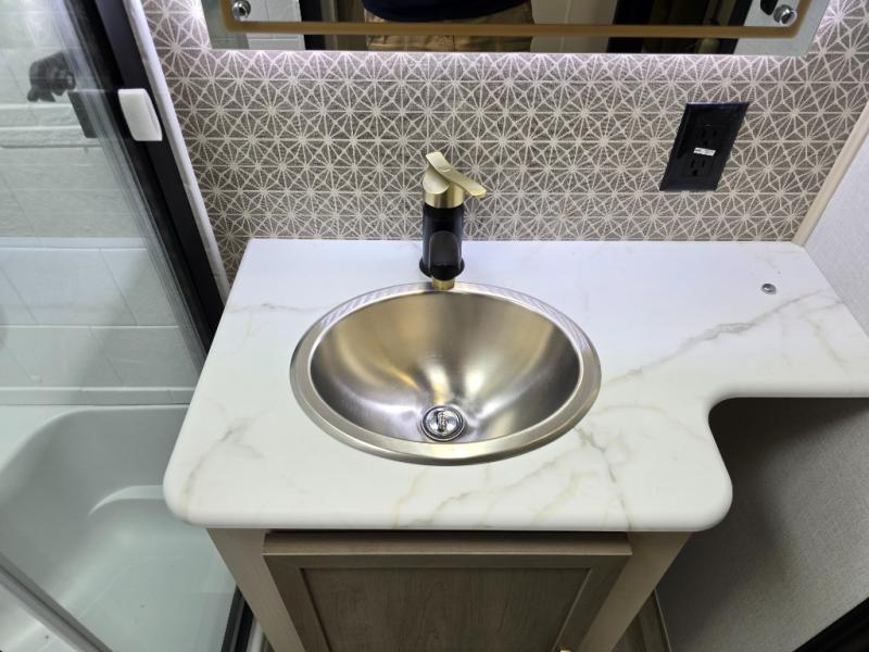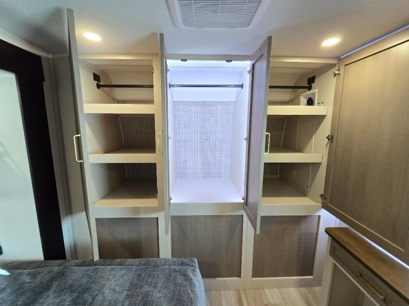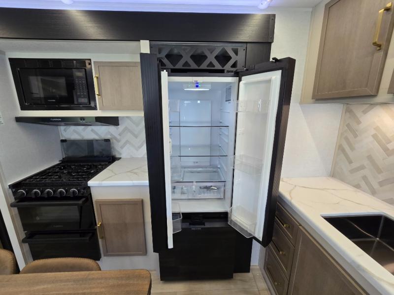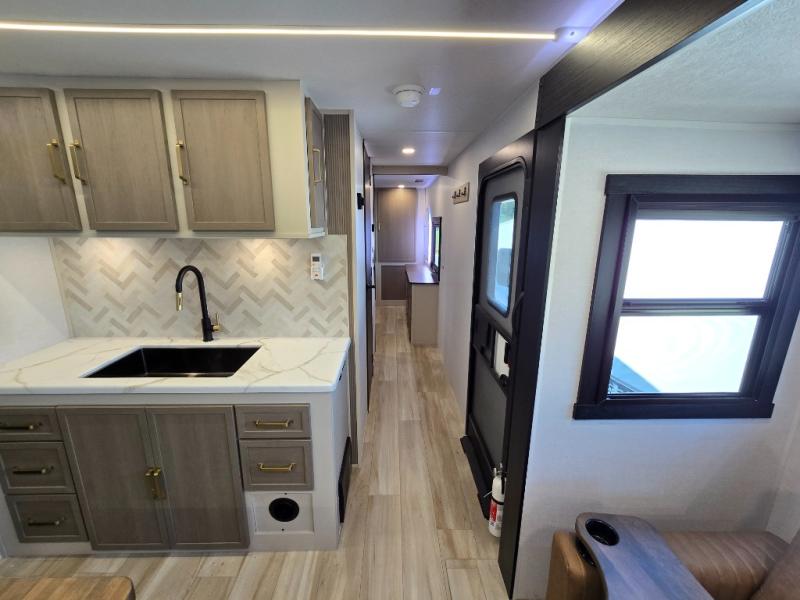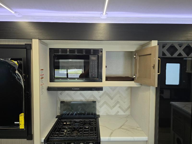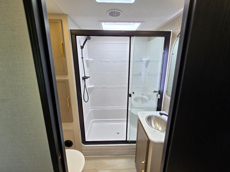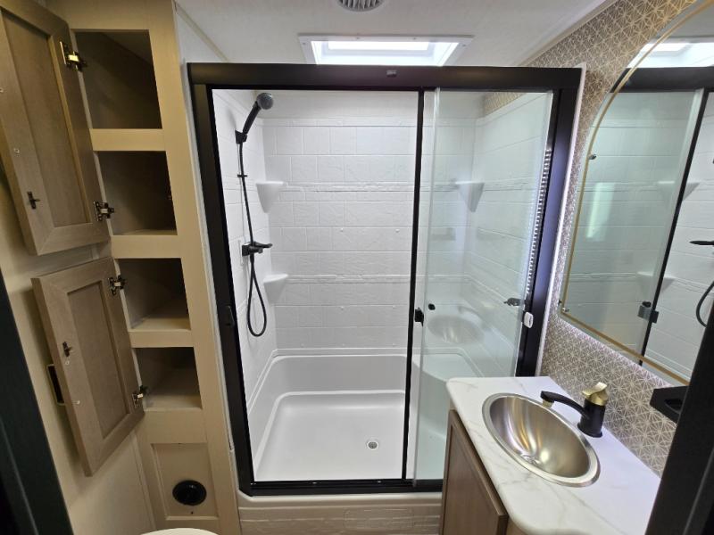 With any Wildwood Heritage Glen travel trailer by Forest River, the quality construction, attention to detail and design along with a bright and welcoming interior allows you to relax in comfort. Each model includes a WeatherShield one piece fiberglass roof, nitrogen-filled radial tires, and an enclosed underbelly with 12V tank heaters on all holding tanks for added protection. You will appreciate the on-demand tankless water heater, along with power stabilizer and tongue jacks, and an extra-large pass-thru storage with slam latch baggage doors. Head inside to enjoy matte gold hardware, wood door casings in place of plastic door casings, and an ultimate interior lighting upgrade with 4k puck/strip lights and a stylish LED back-lit bath mirror!
