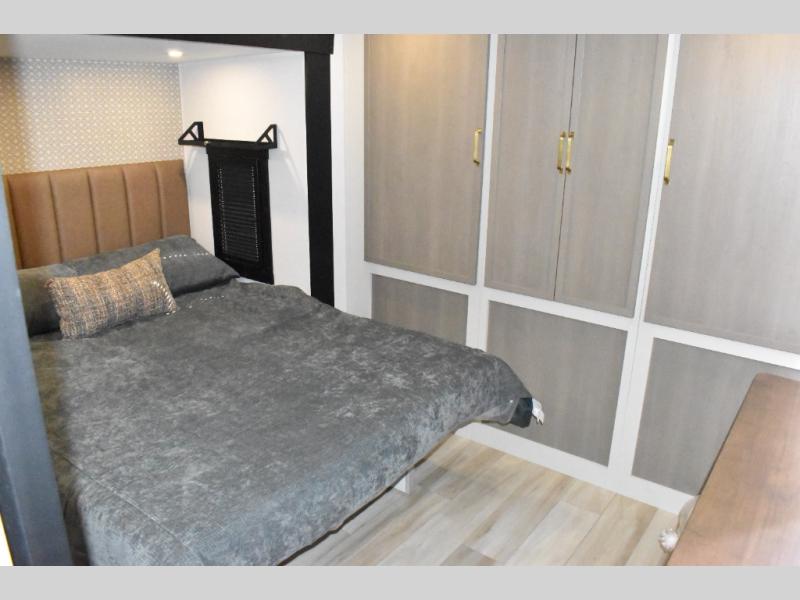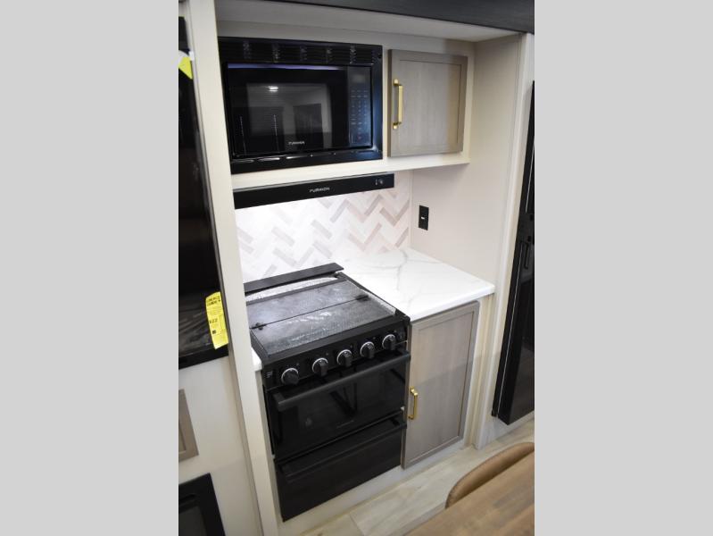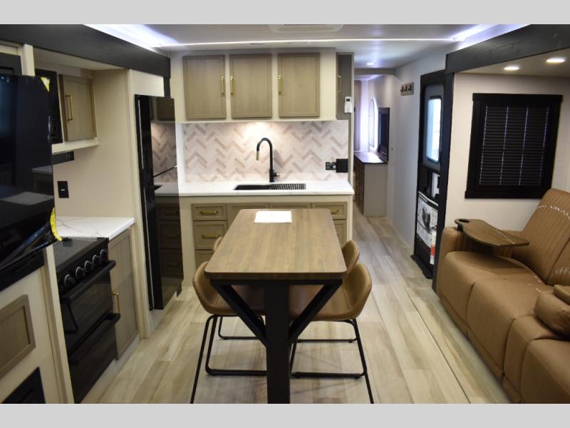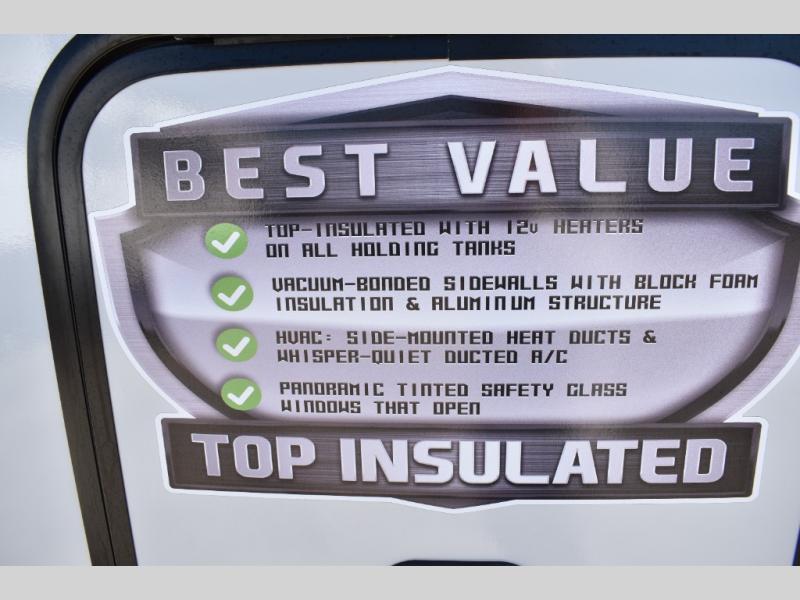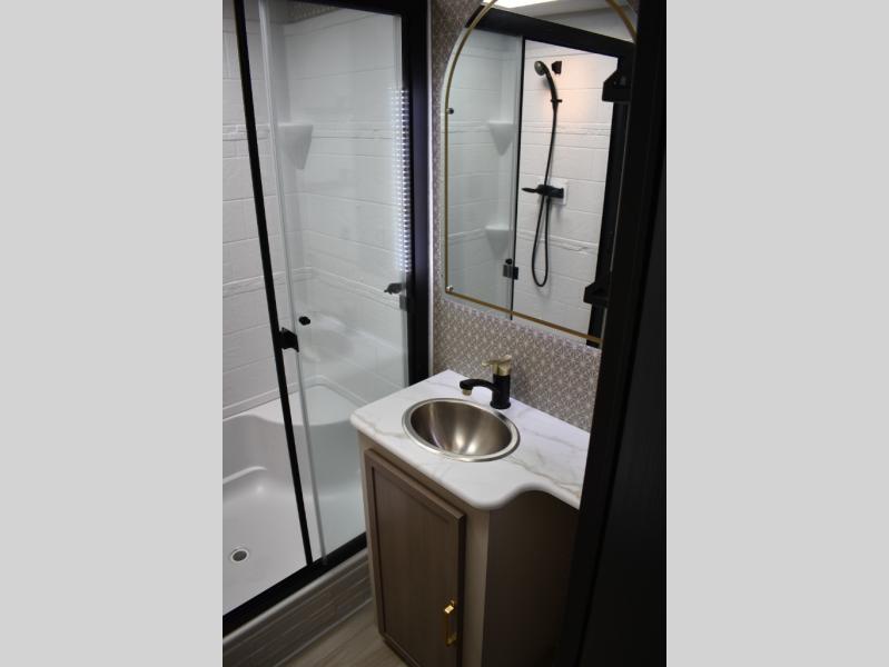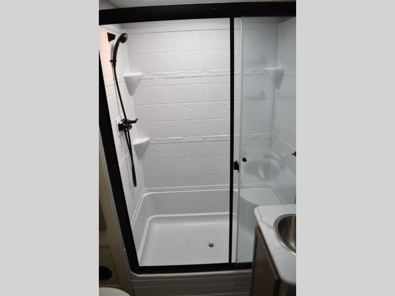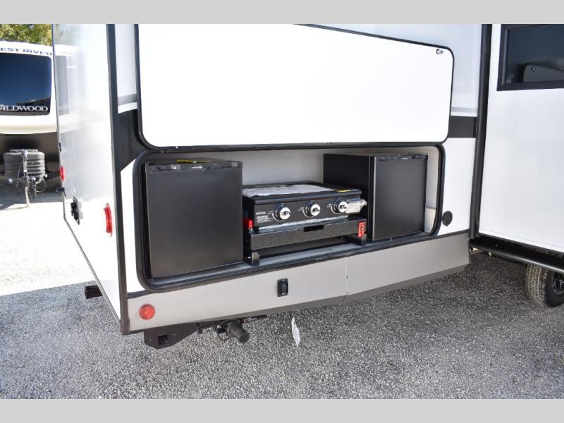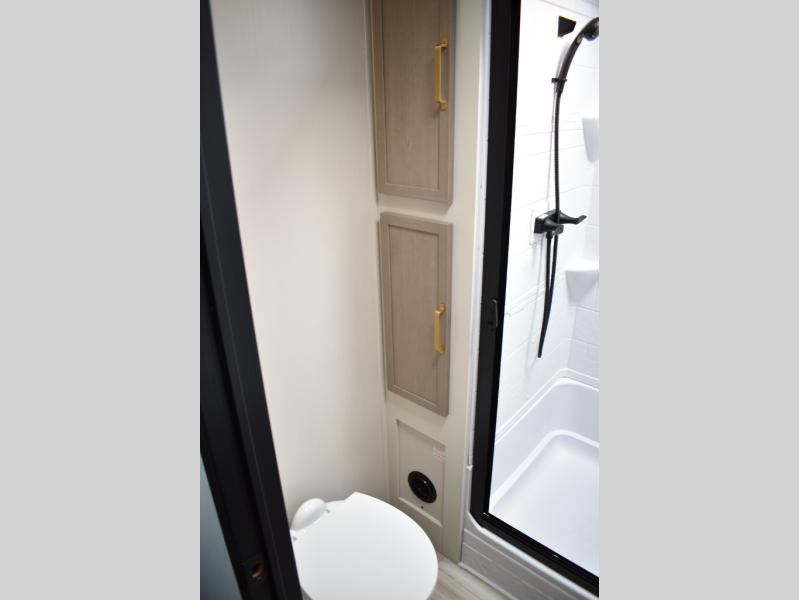 With any Wildwood Heritage Glen travel trailer by Forest River, the quality construction, attention to detail and design along with a bright and welcoming interior allows you to relax in comfort. Each model includes a WeatherShield one piece fiberglass roof, nitrogen-filled radial tires, and an enclosed underbelly with 12V tank heaters on all holding tanks for added protection. You will appreciate the on-demand tankless water heater, along with power stabilizer and tongue jacks, and an extra-large pass-thru storage with slam latch baggage doors. Head inside to enjoy matte gold hardware, wood door casings in place of plastic door casings, and an ultimate interior lighting upgrade with 4k puck/strip lights and a stylish LED back-lit bath mirror!