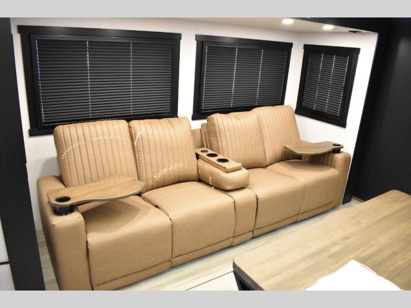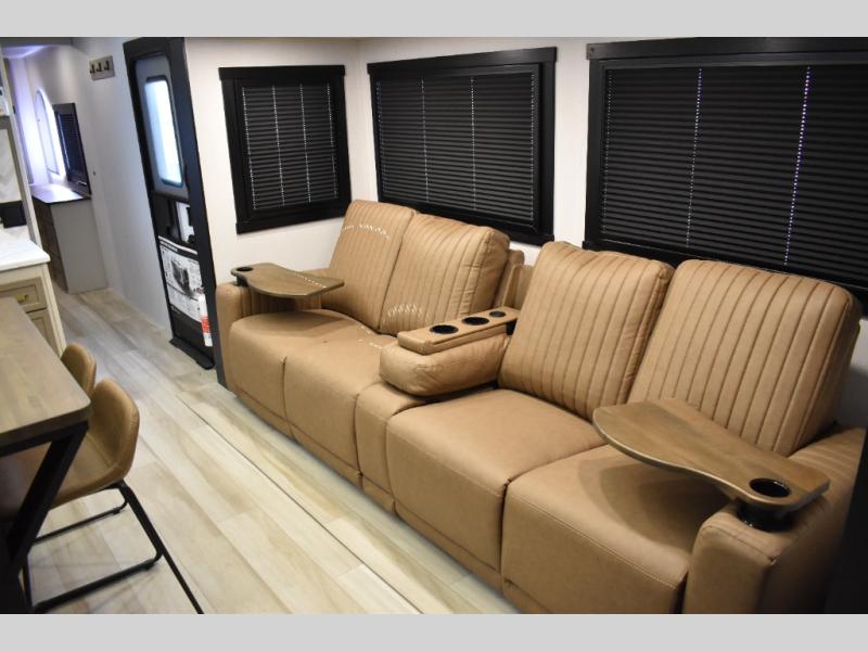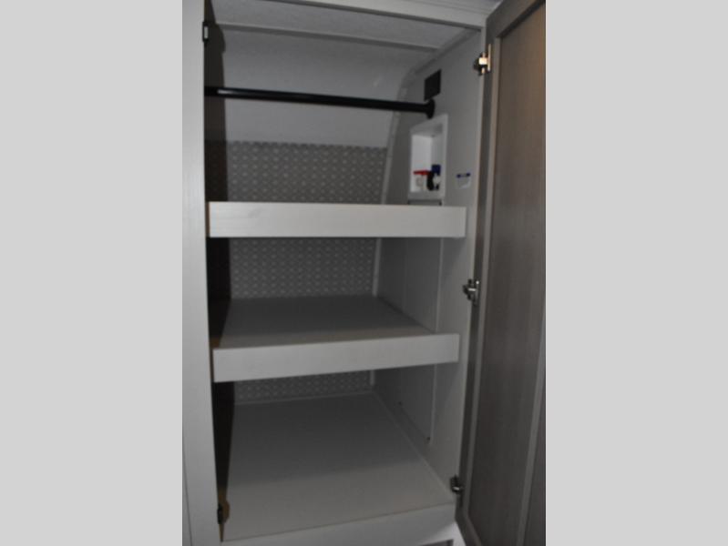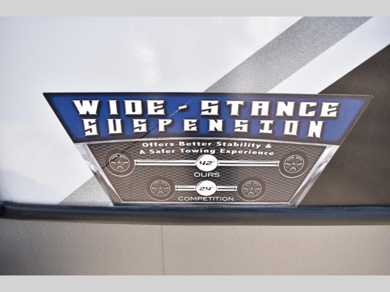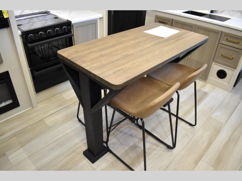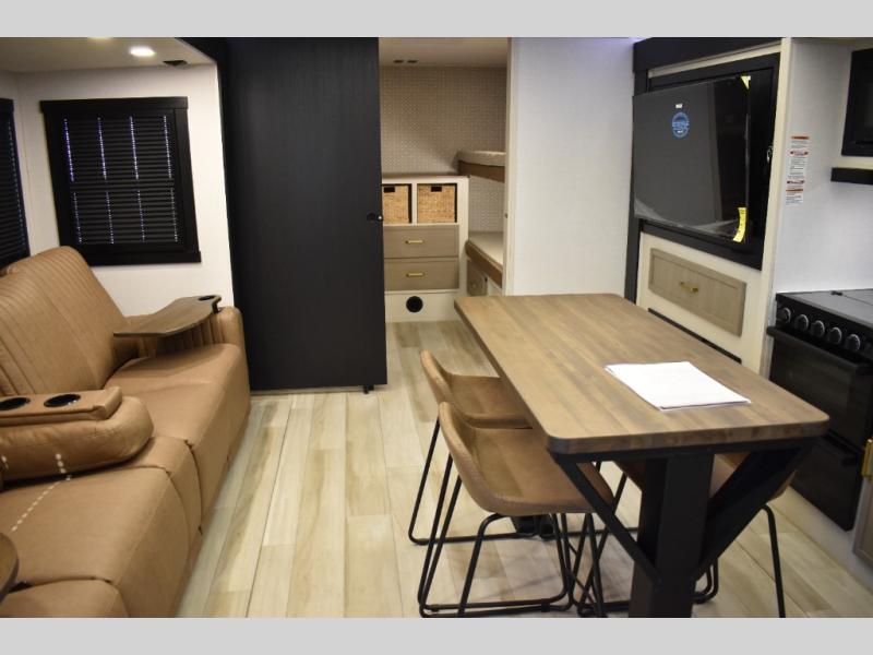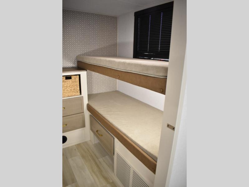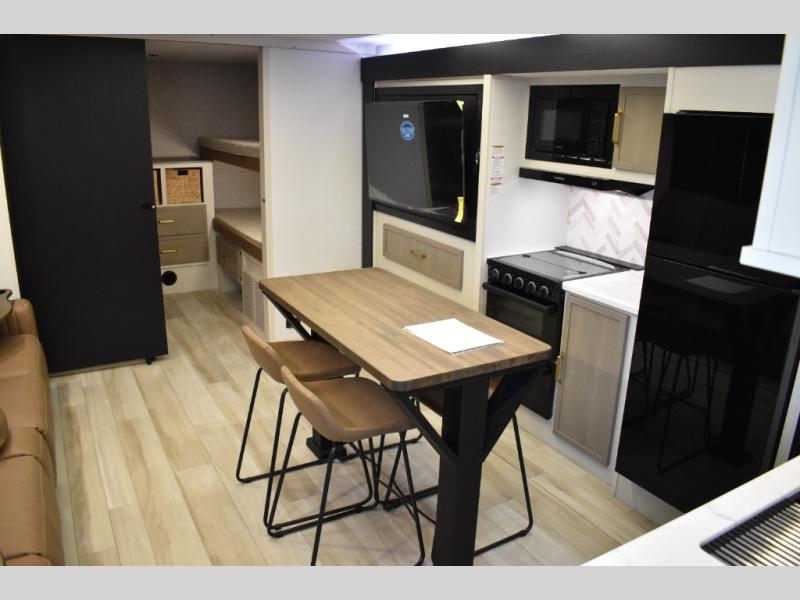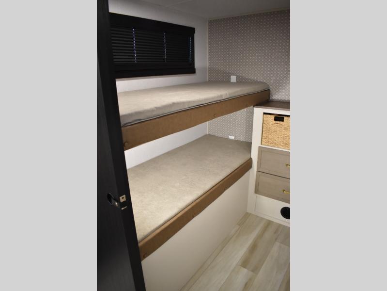 This is the perfect travel trailer if you enjoy camping with a larger group! The rear private bunkhouse includes four bunk beds plus a dresser to keep this space tidy. You'll have the queen bed slide out in the front bedroom all to yourselves, along with a dresser and an ottoman, plus a front wardrobe with washer/dryer prep. Everyone can meet in the combined kitchen and living area that includes spacious theater seating, a kitchen island with four chairs, full kitchen amenities, and dual opposing slides for more space!