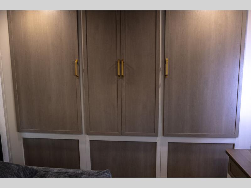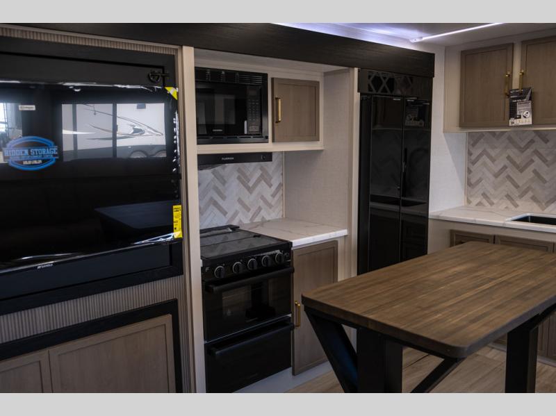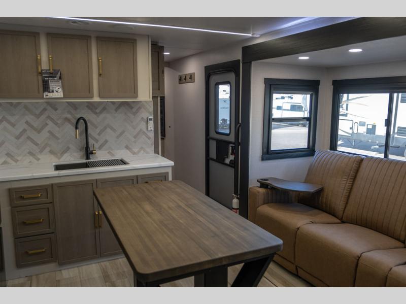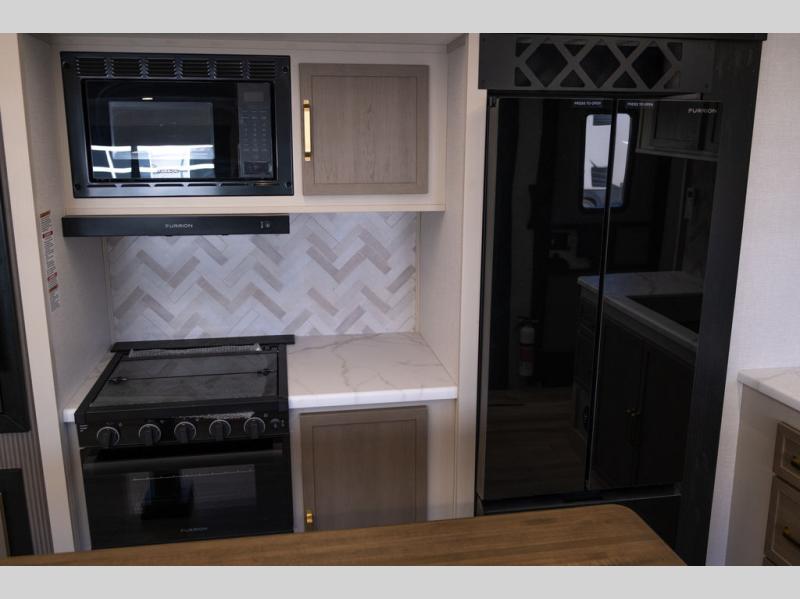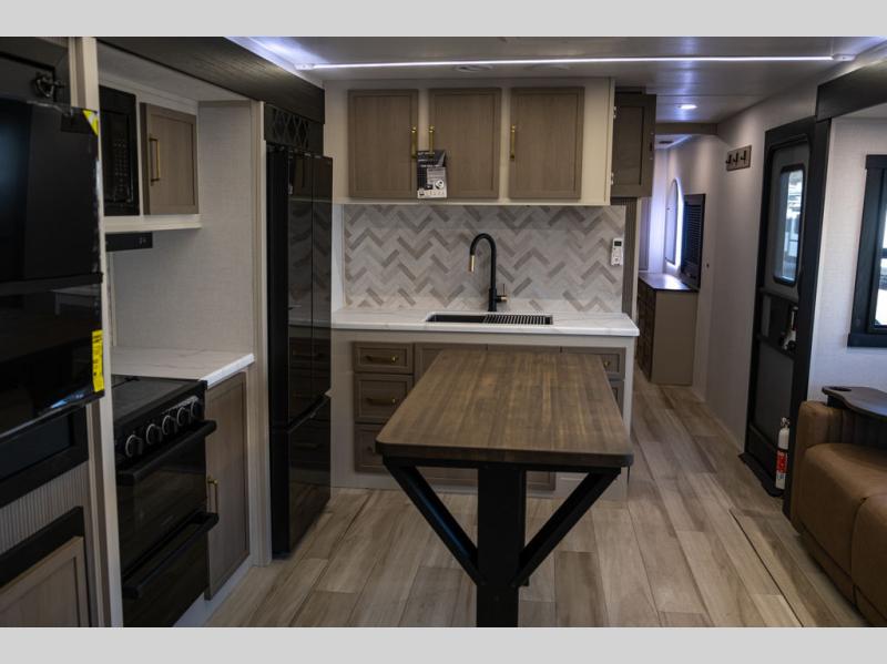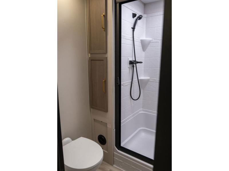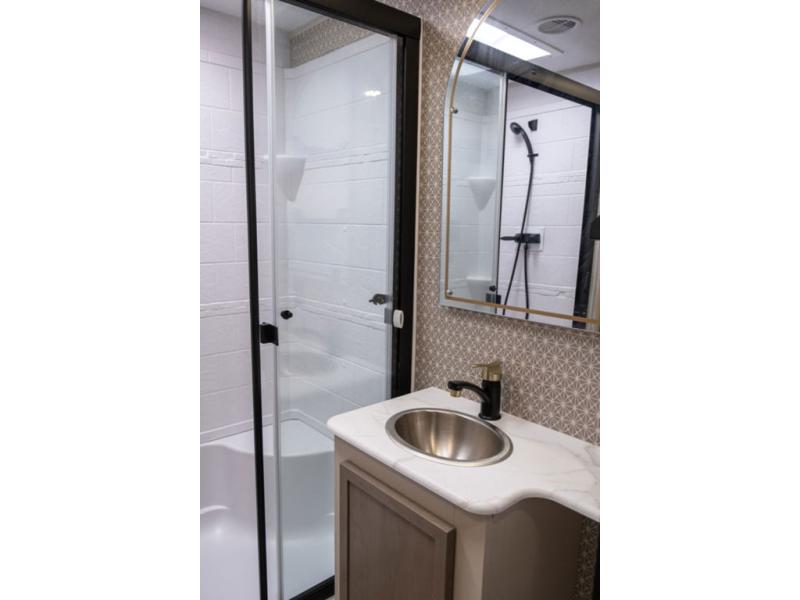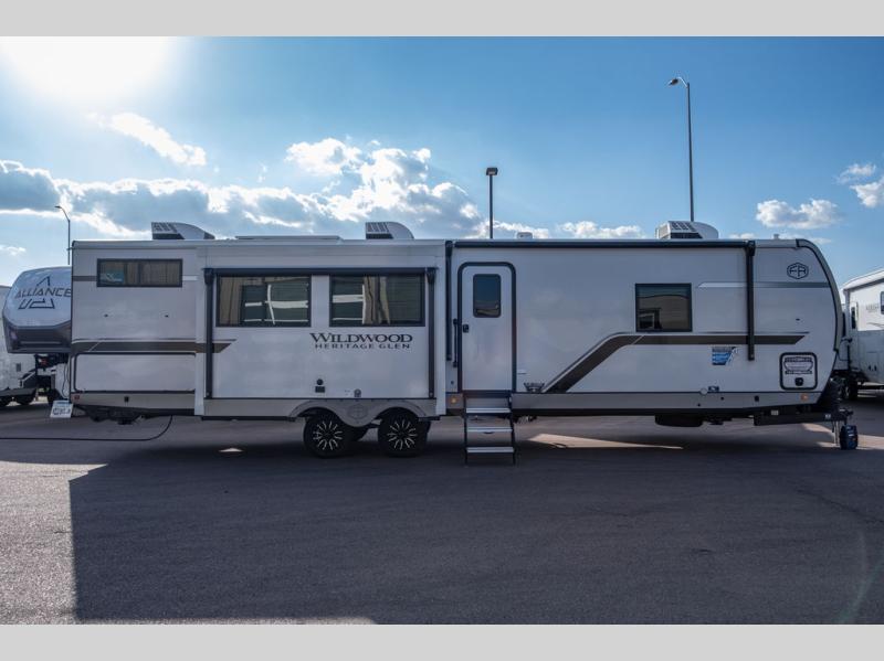With any Wildwood Heritage Glen travel trailer by Forest River, the quality construction, attention to detail and design along with a bright and welcoming interior allows you to relax in comfort. Each model includes a WeatherShield one piece fiberglass roof, nitrogen-filled radial tires, and an enclosed underbelly with 12V tank heaters on all holding tanks for added protection. You will appreciate the on-demand tankless water heater, along with power stabilizer and tongue jacks, and an extra-large pass-thru storage with slam latch baggage doors. Head inside to enjoy matte gold hardware, wood door casings in place of plastic door casings, and an ultimate interior lighting upgrade with 4k puck/strip lights and a stylish LED back-lit bath mirror!