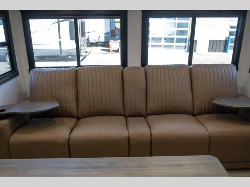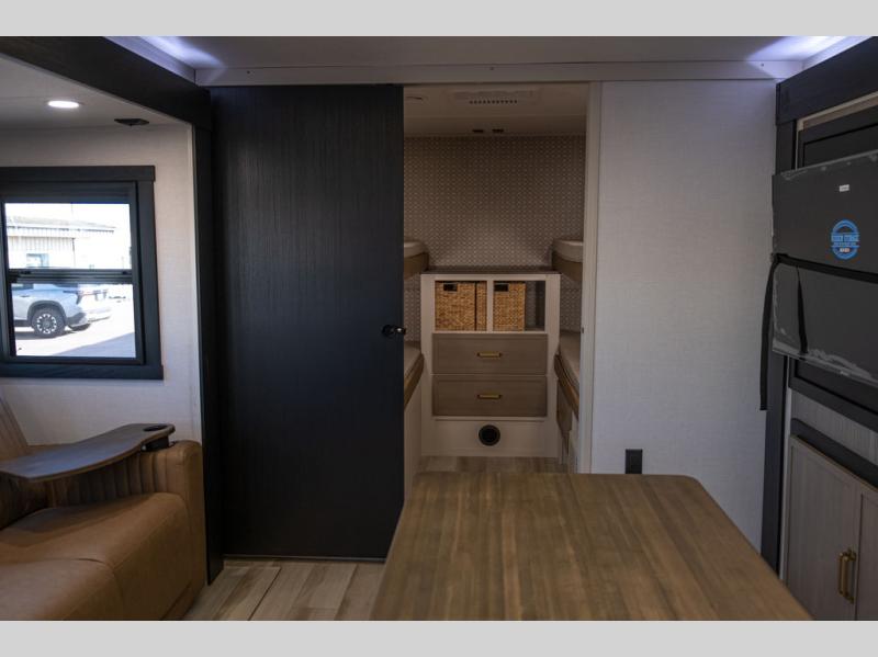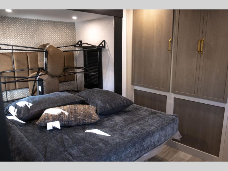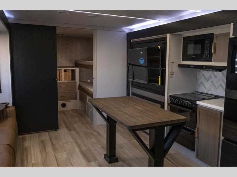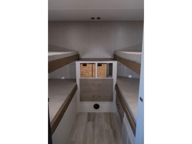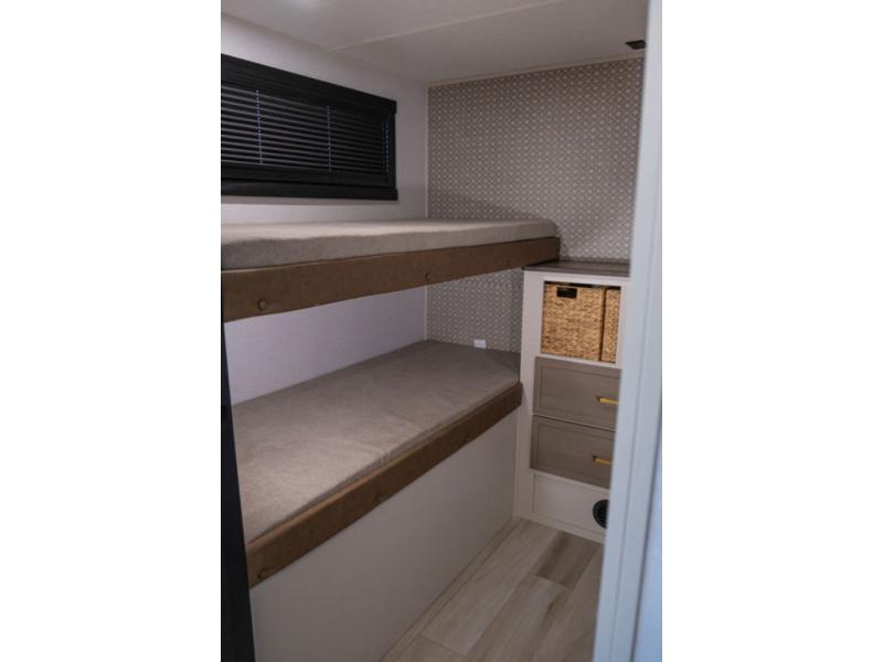 This is the perfect travel trailer if you enjoy camping with a larger group! The rear private bunkhouse includes four bunk beds plus a dresser to keep this space tidy. You'll have the queen bed slide out in the front bedroom all to yourselves, along with a dresser and an ottoman, plus a front wardrobe with washer/dryer prep. Everyone can meet in the combined kitchen and living area that includes spacious theater seating, a kitchen island with four chairs, full kitchen amenities, and dual opposing slides for more space!