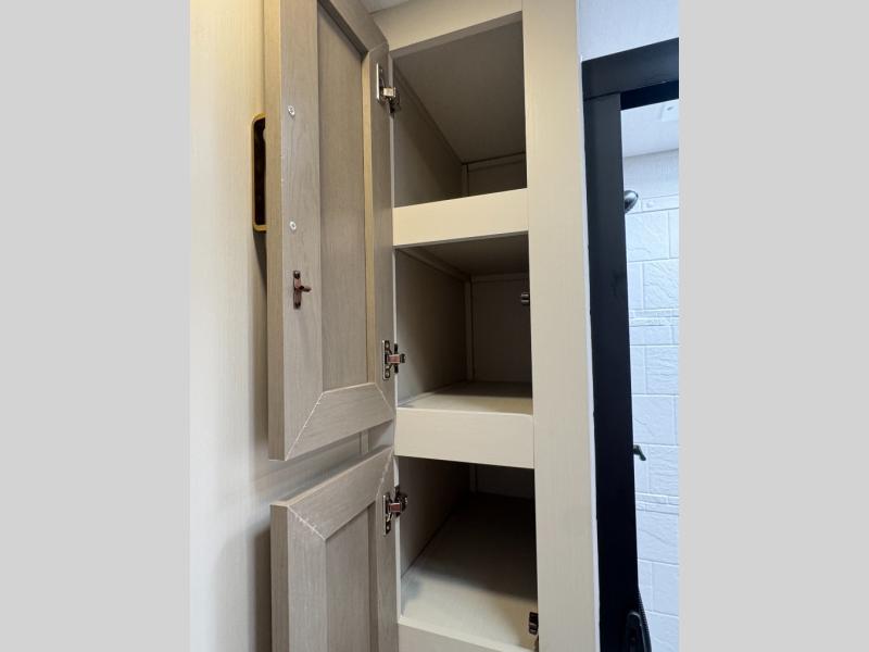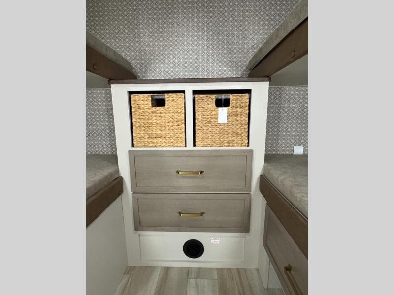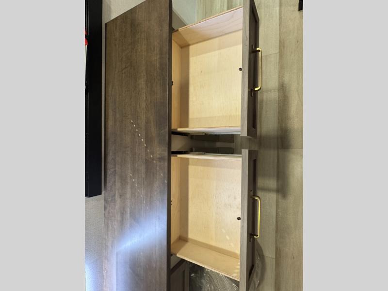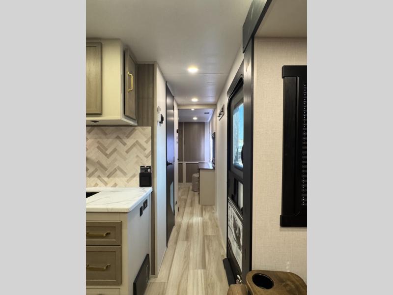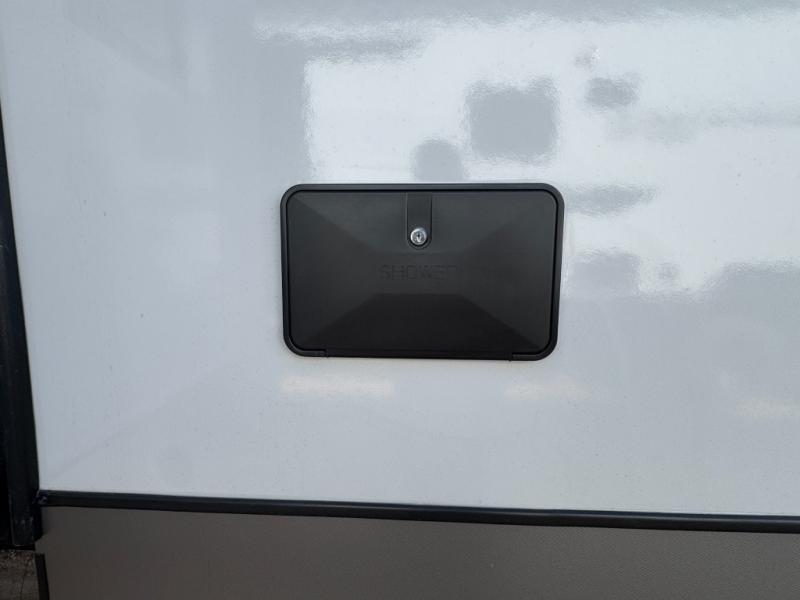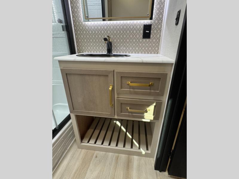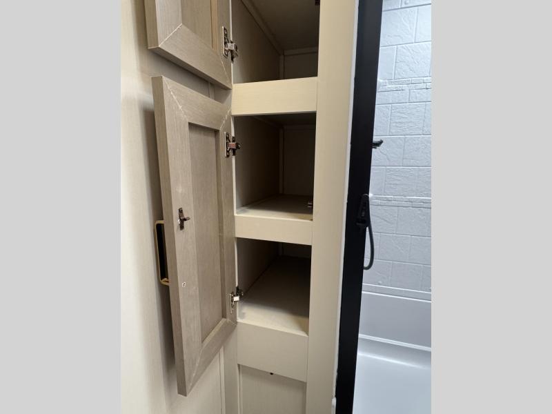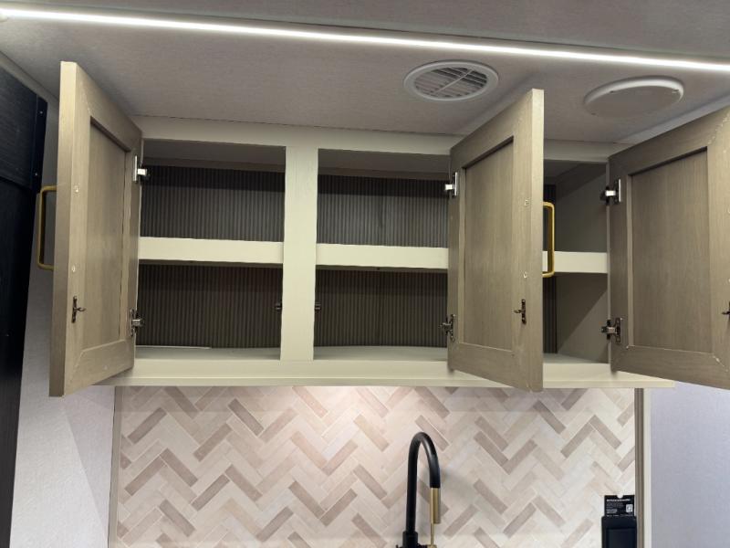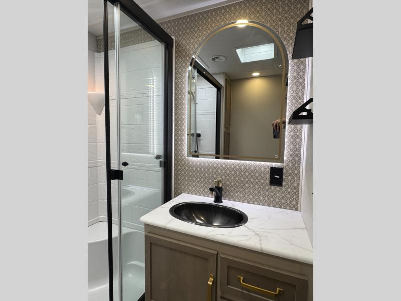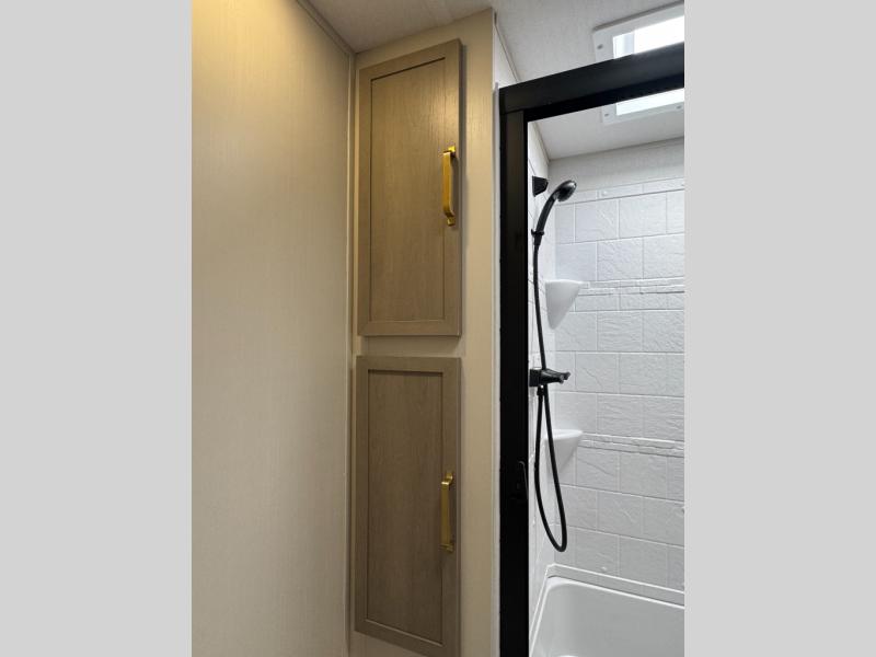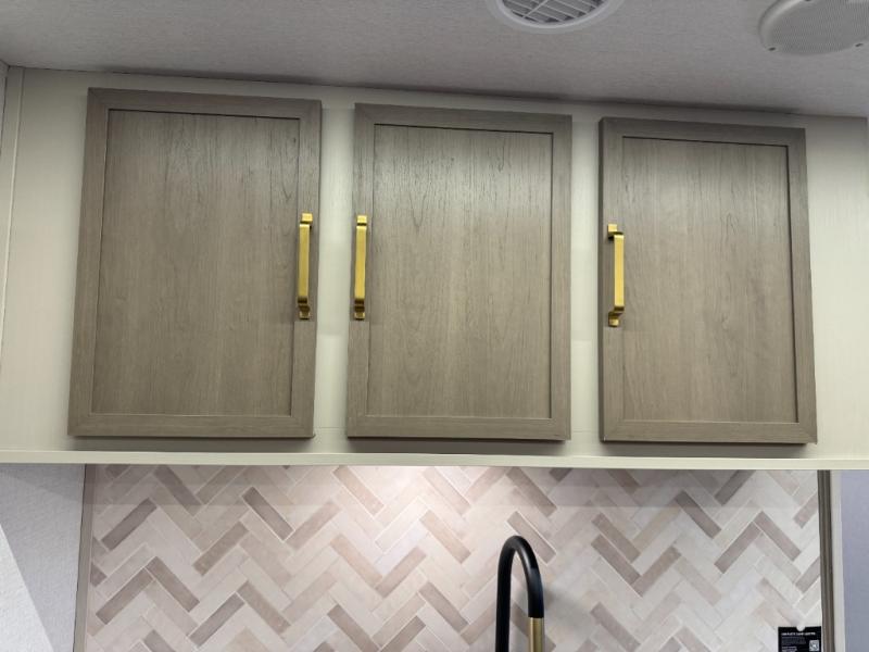 With any Wildwood Heritage Glen travel trailer by Forest River, the quality construction, attention to detail and design along with a bright and welcoming interior allows you to relax in comfort. Each model includes a WeatherShield one piece fiberglass roof, nitrogen-filled radial tires, and an enclosed underbelly with 12V tank heaters on all holding tanks for added protection. You will appreciate the on-demand tankless water heater, along with power stabilizer and tongue jacks, and an extra-large pass-thru storage with slam latch baggage doors. Head inside to enjoy matte gold hardware, wood door casings in place of plastic door casings, and an ultimate interior lighting upgrade with 4k puck/strip lights and a stylish LED back-lit bath mirror!