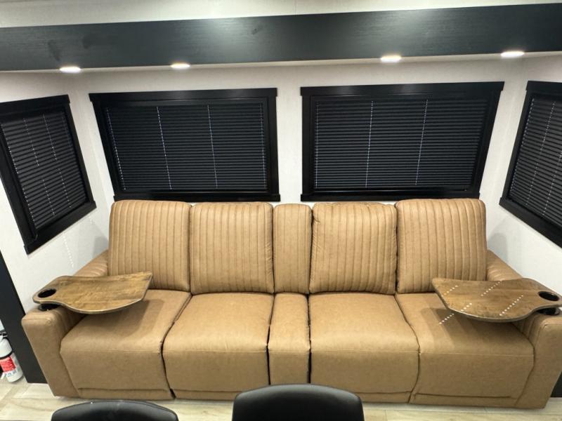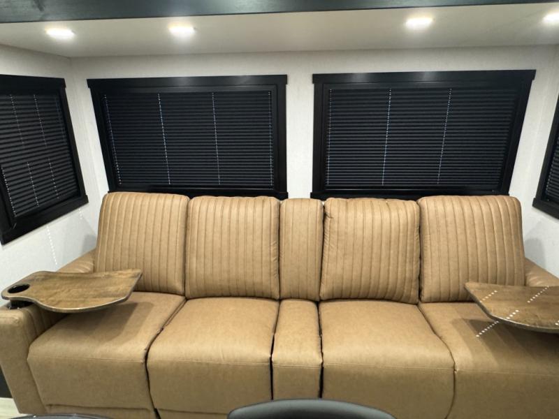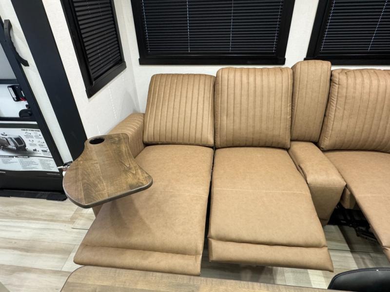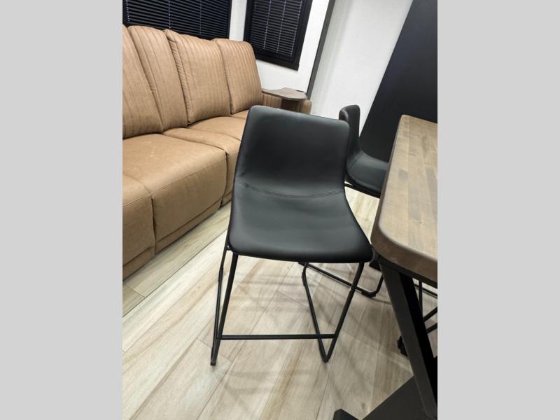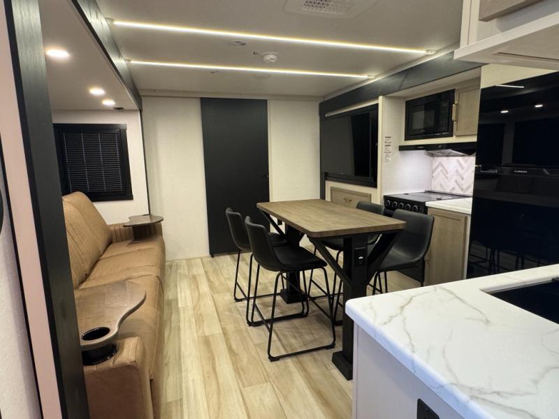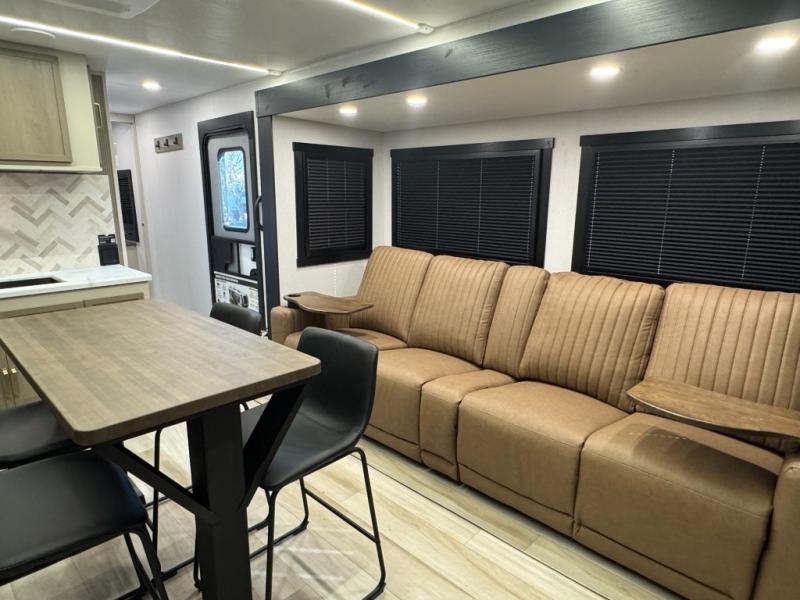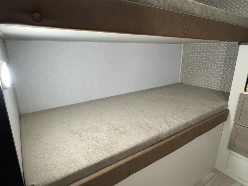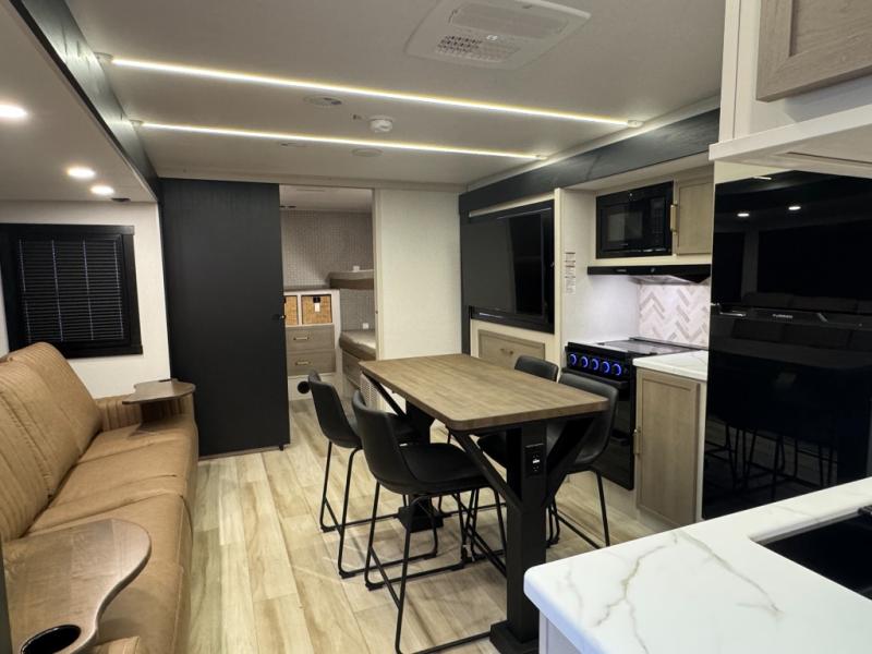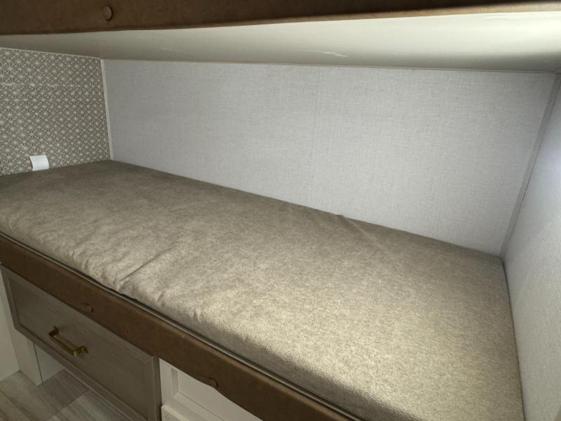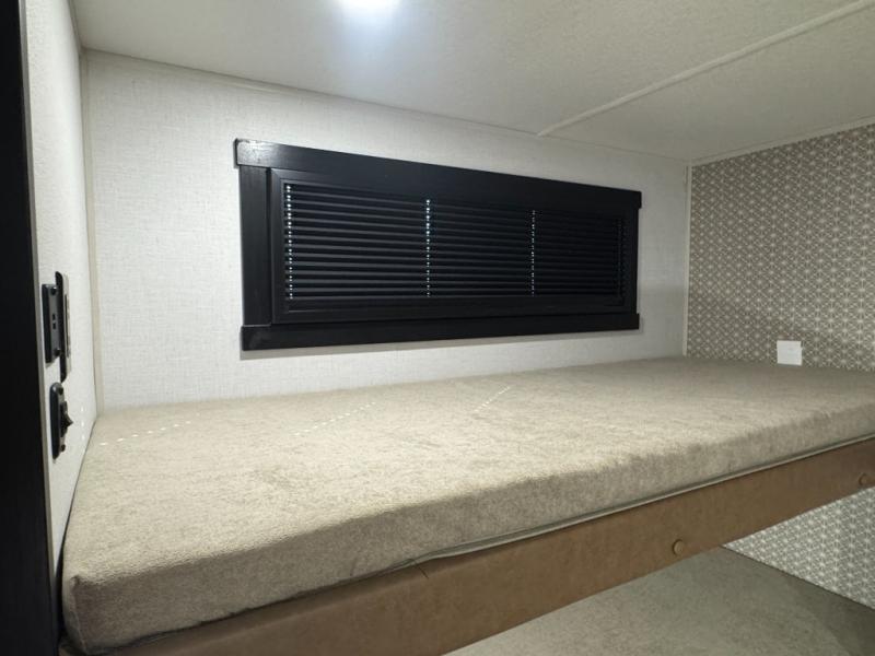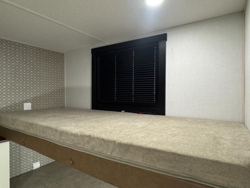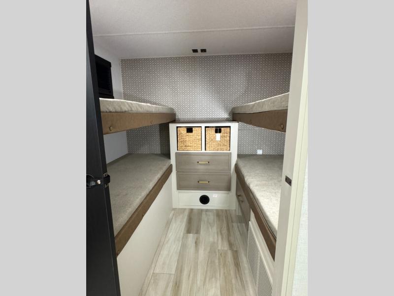 This is the perfect travel trailer if you enjoy camping with a larger group! The rear private bunkhouse includes four bunk beds plus a dresser to keep this space tidy. You'll have the queen bed slide out in the front bedroom all to yourselves, along with a dresser and an ottoman, plus a front wardrobe with washer/dryer prep. Everyone can meet in the combined kitchen and living area that includes spacious theater seating, a kitchen island with four chairs, full kitchen amenities, and dual opposing slides for more space!