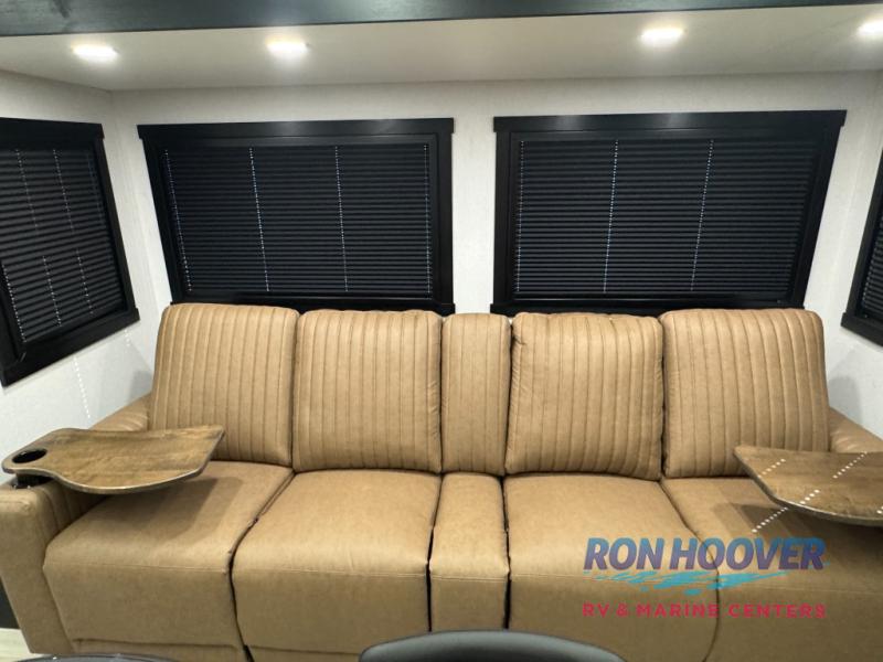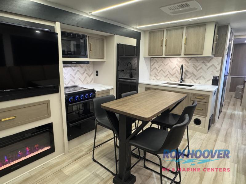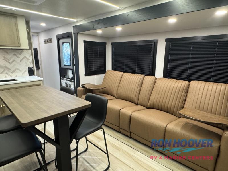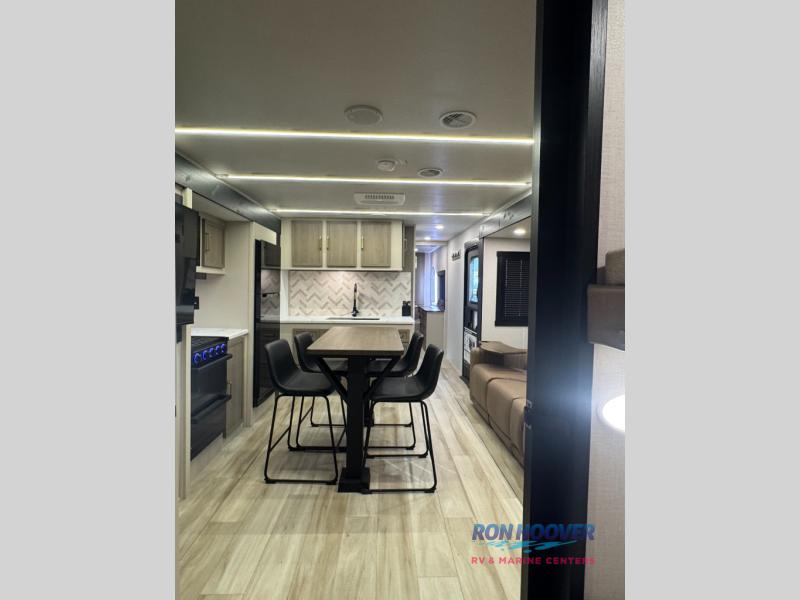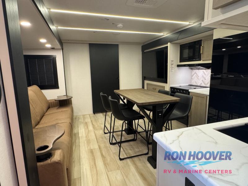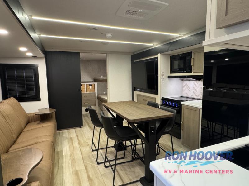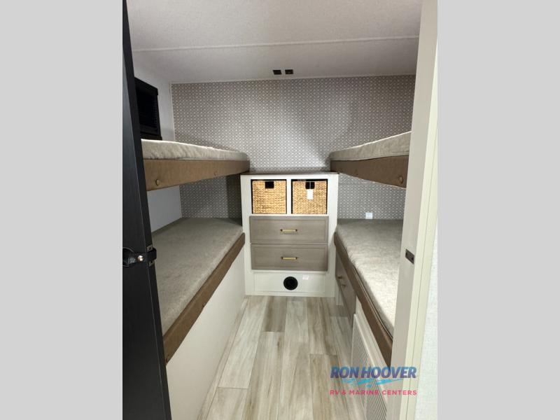 This is the perfect travel trailer if you enjoy camping with a larger group! The rear private bunkhouse includes four bunk beds plus a dresser to keep this space tidy. You'll have the queen bed slide out in the front bedroom all to yourselves, along with a dresser and an ottoman, plus a front wardrobe with washer/dryer prep. Everyone can meet in the combined kitchen and living area that includes spacious theater seating, a kitchen island with four chairs, full kitchen amenities, and dual opposing slides for more space!