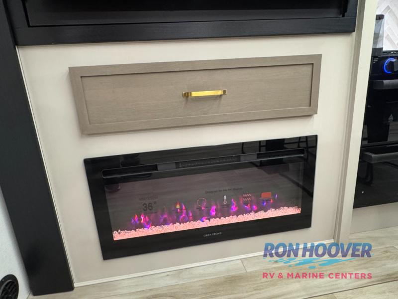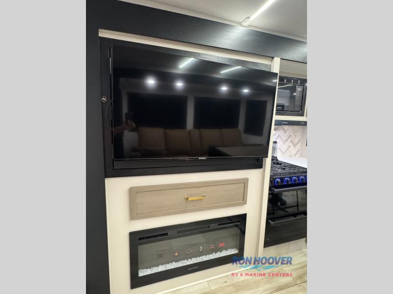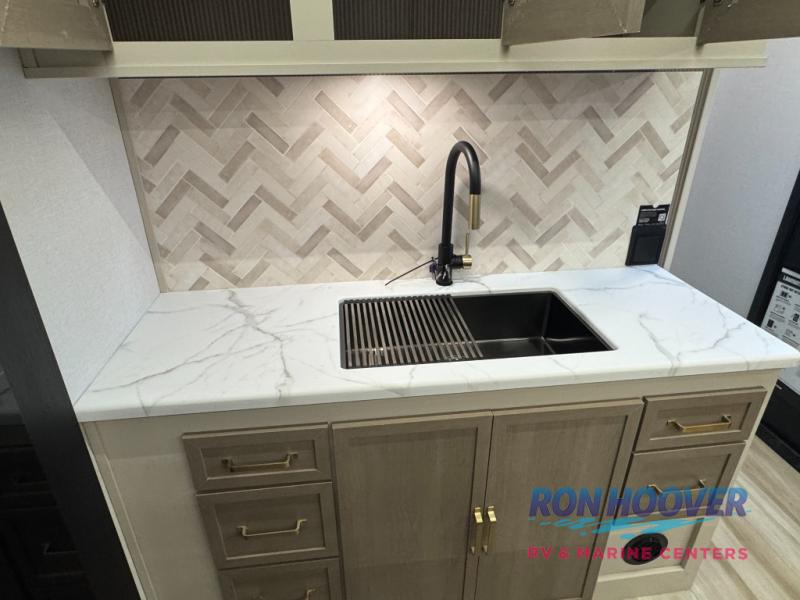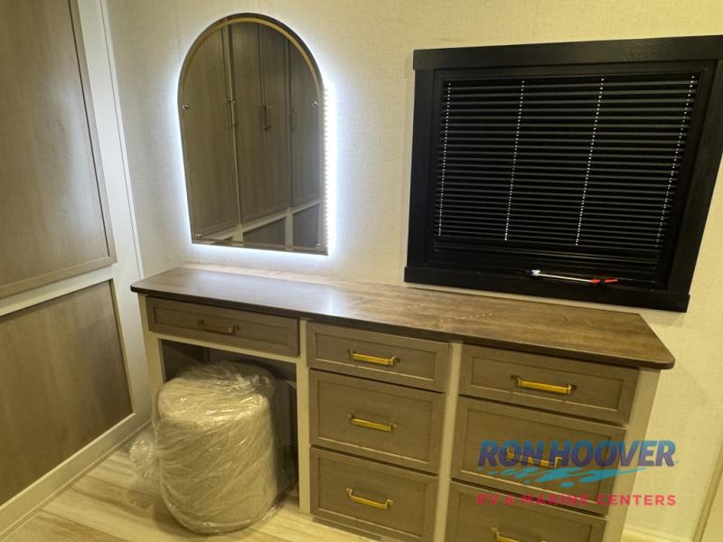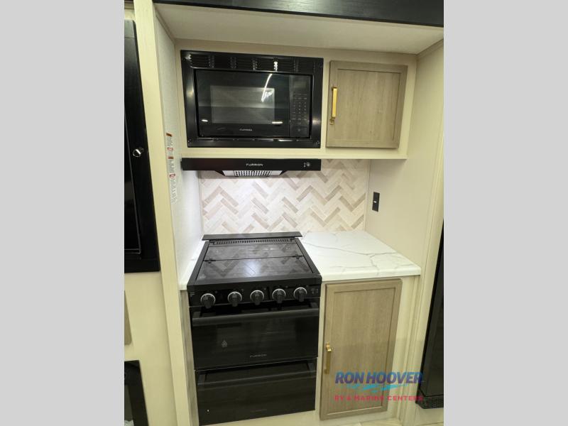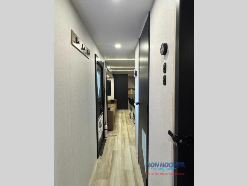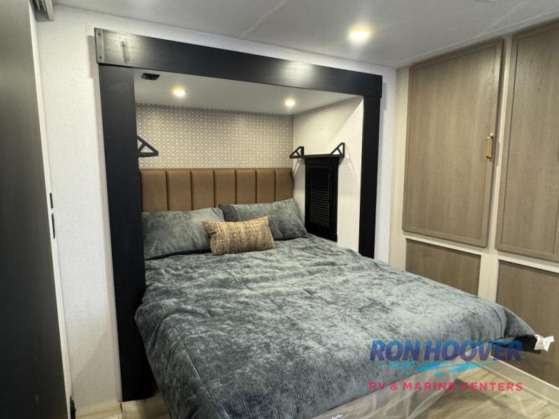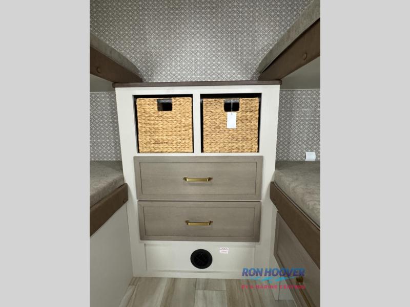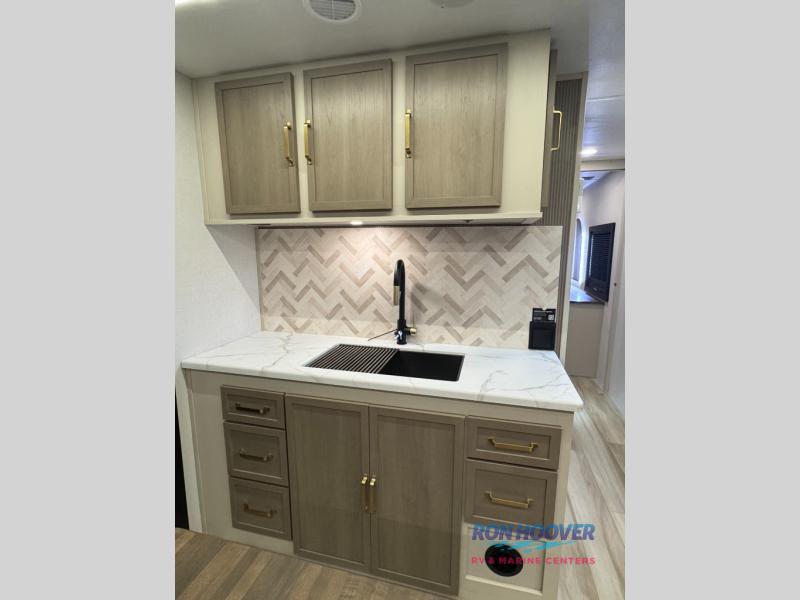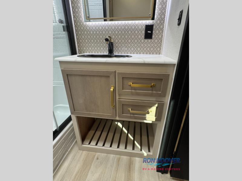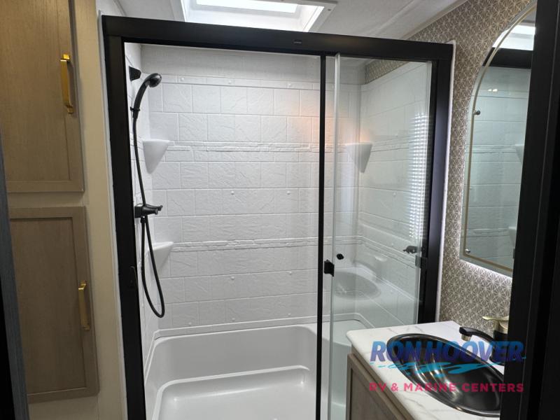 With any Wildwood Heritage Glen travel trailer by Forest River, the quality construction, attention to detail and design along with a bright and welcoming interior allows you to relax in comfort. Each model includes a WeatherShield one piece fiberglass roof, nitrogen-filled radial tires, and an enclosed underbelly with 12V tank heaters on all holding tanks for added protection. You will appreciate the on-demand tankless water heater, along with power stabilizer and tongue jacks, and an extra-large pass-thru storage with slam latch baggage doors. Head inside to enjoy matte gold hardware, wood door casings in place of plastic door casings, and an ultimate interior lighting upgrade with 4k puck/strip lights and a stylish LED back-lit bath mirror!