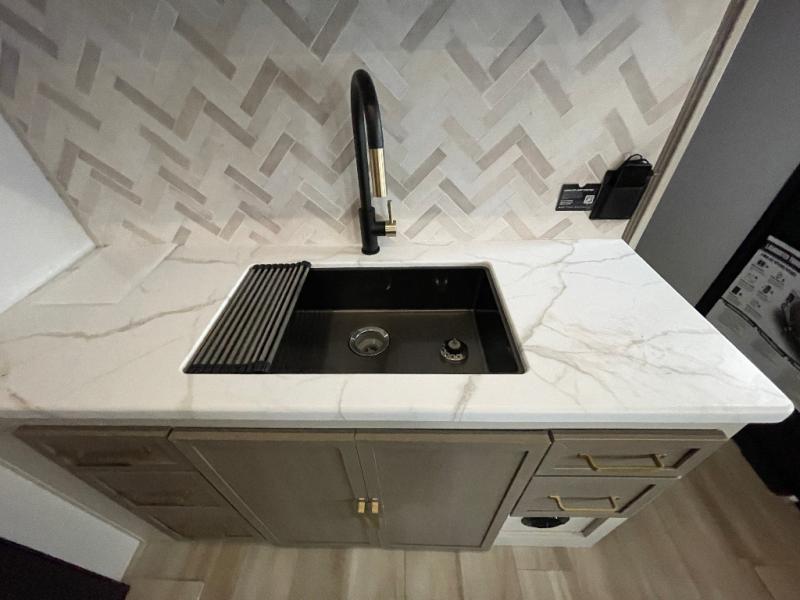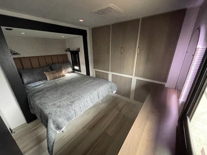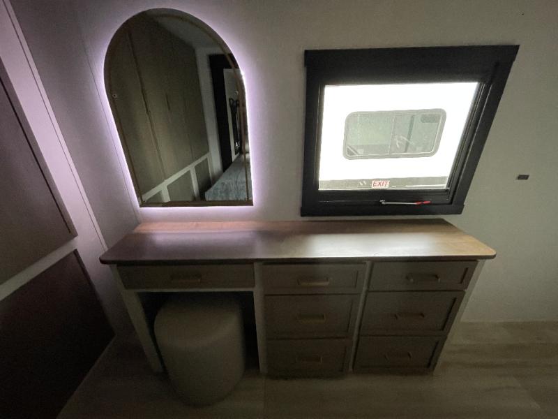 With any Wildwood Heritage Glen travel trailer by Forest River, the quality construction, attention to detail and design along with a bright and welcoming interior allows you to relax in comfort. Each model includes a WeatherShield one piece fiberglass roof, nitrogen-filled radial tires, and an enclosed underbelly with 12V tank heaters on all holding tanks for added protection. You will appreciate the on-demand tankless water heater, along with power stabilizer and tongue jacks, and an extra-large pass-thru storage with slam latch baggage doors. Head inside to enjoy matte gold hardware, wood door casings in place of plastic door casings, and an ultimate interior lighting upgrade with 4k puck/strip lights and a stylish LED back-lit bath mirror!