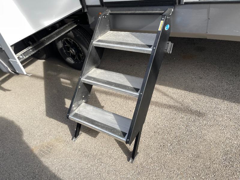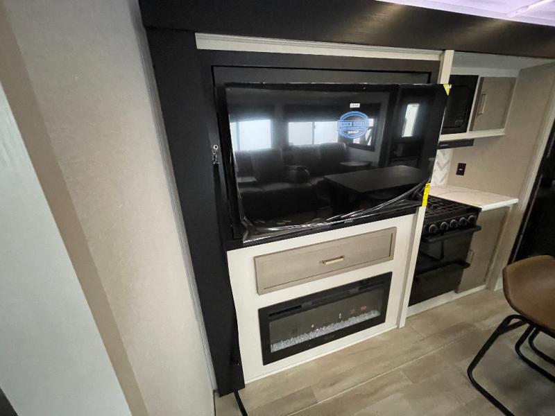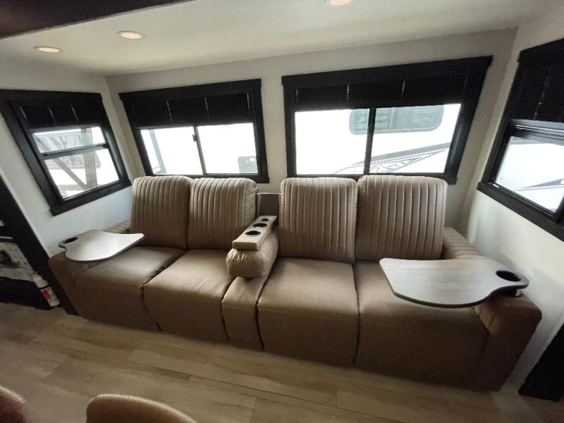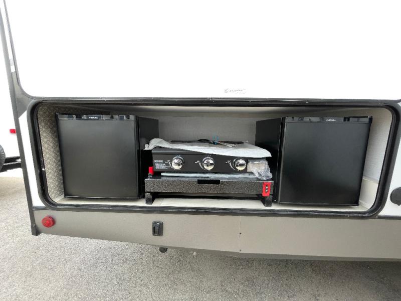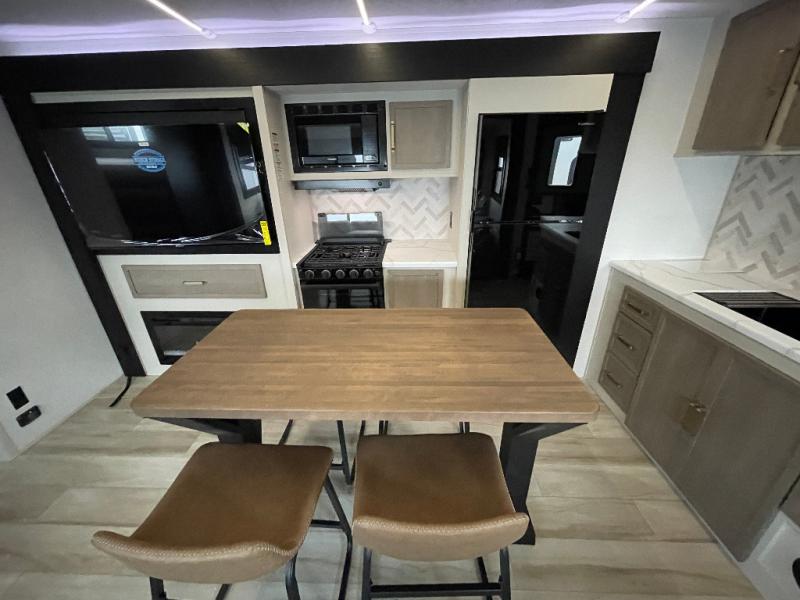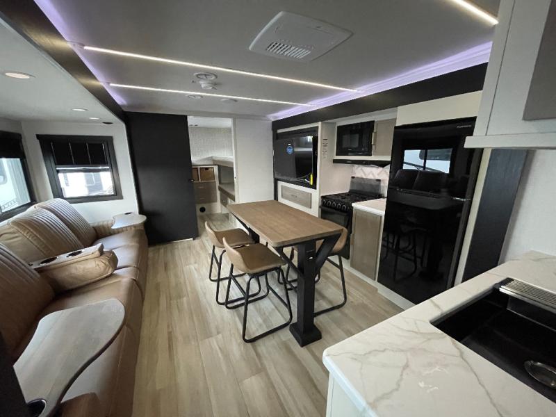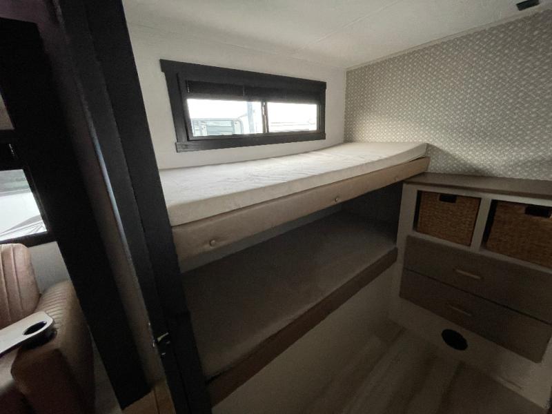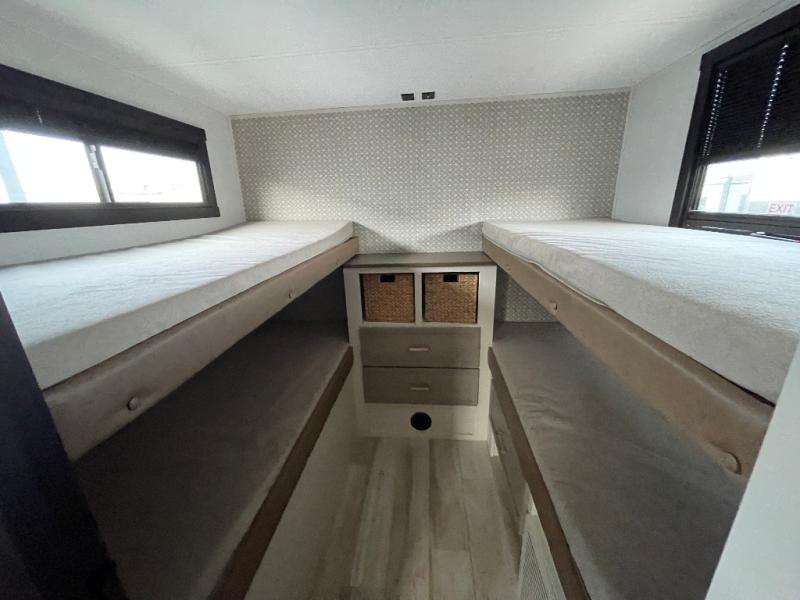 This is the perfect travel trailer if you enjoy camping with a larger group! The rear private bunkhouse includes four bunk beds plus a dresser to keep this space tidy. You'll have the queen bed slide out in the front bedroom all to yourselves, along with a dresser and an ottoman, plus a front wardrobe with washer/dryer prep. Everyone can meet in the combined kitchen and living area that includes spacious theater seating, a kitchen island with four chairs, full kitchen amenities, and dual opposing slides for more space!