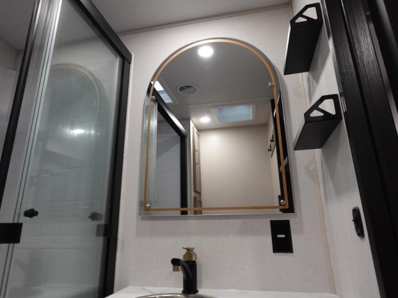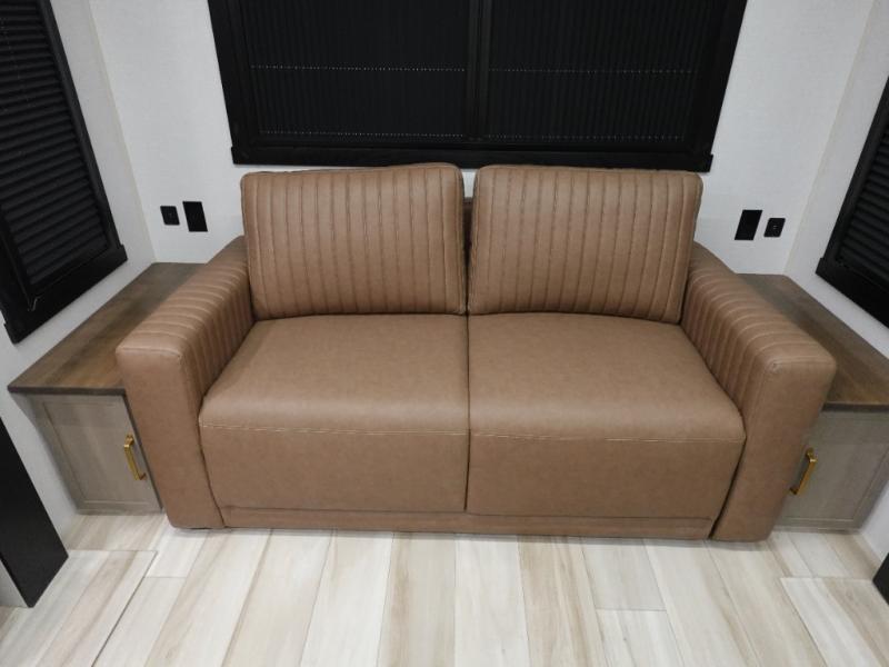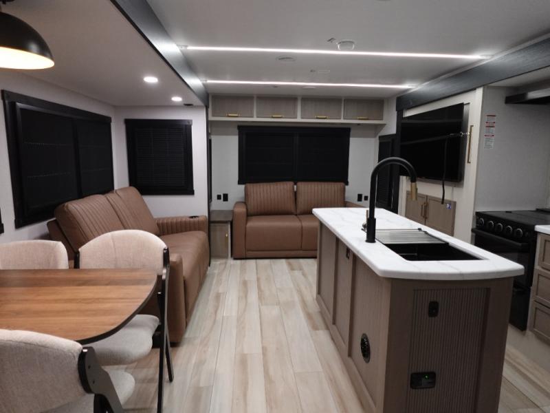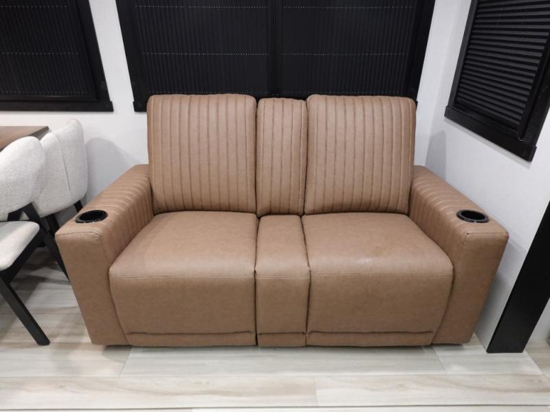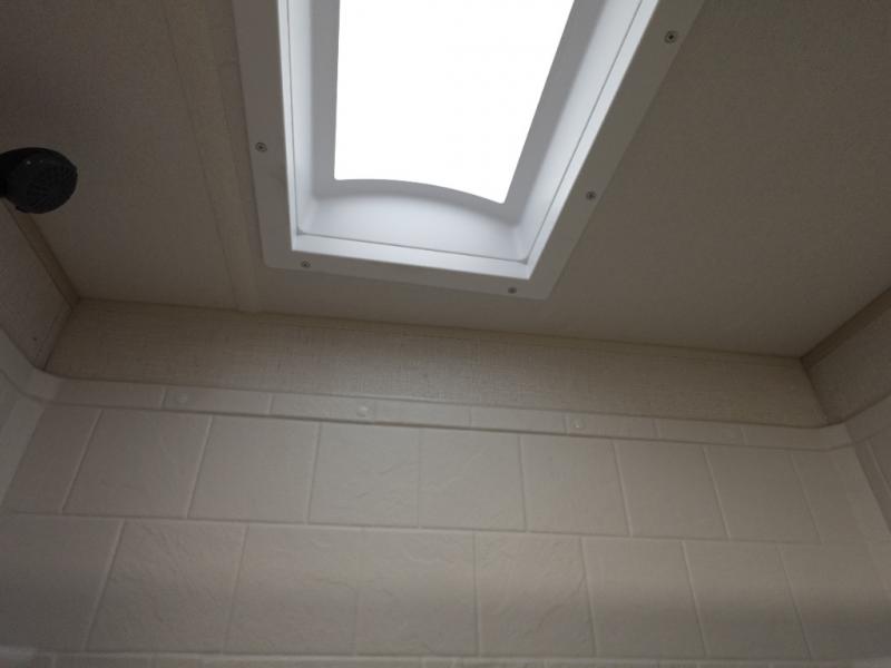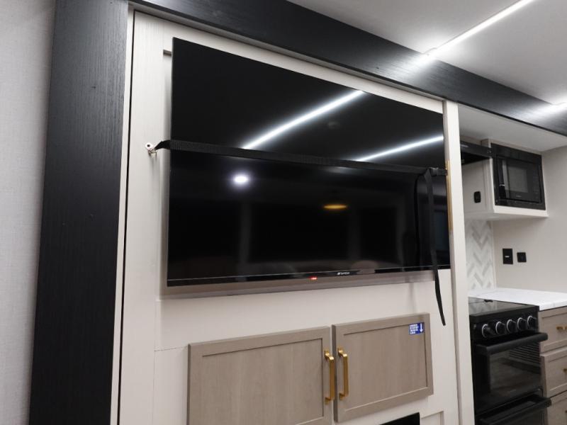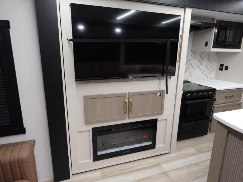 You are going to love the spacious private bedroom with a space-saving door, custom king bed slide, a dresser, and a full-width wardrobe with washer and dryer prep. If you ever decide to get out of bed, you can enjoy a relaxing shower in the residential shower with a skylight and a wide-open kitchen and living area with dual opposing slide outs. The cook will love having a kitchen island, a hutch, a large pantry, plus a 12V refrigerator. There is an entertainment center with a 50" TV and fireplace plus plenty of seating on the furniture. And don't forget about the natural lighting and views you will receive from the panoramic windows.