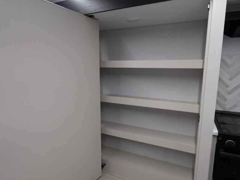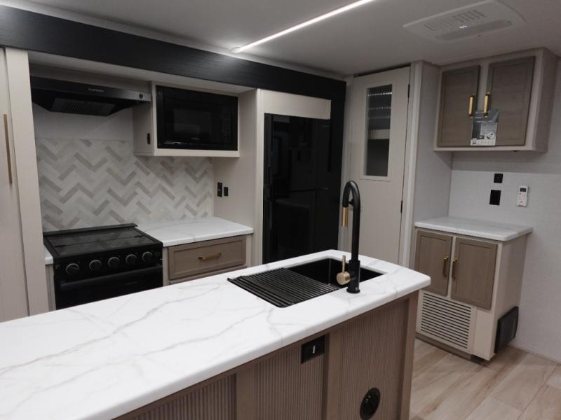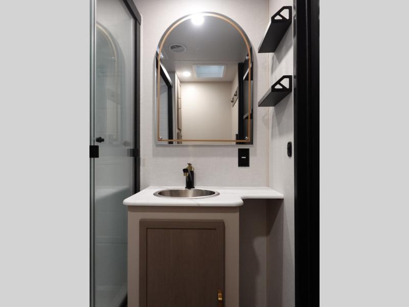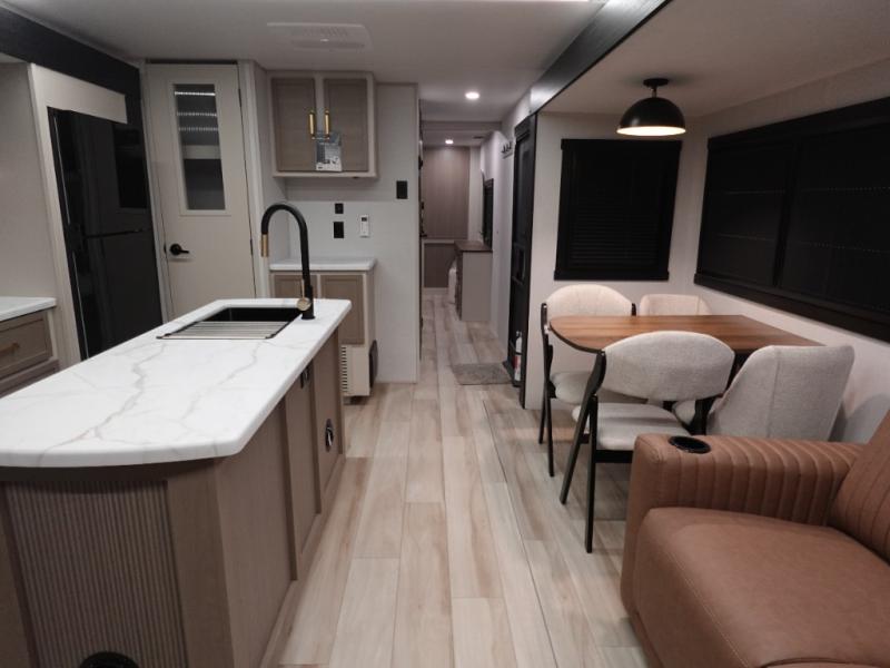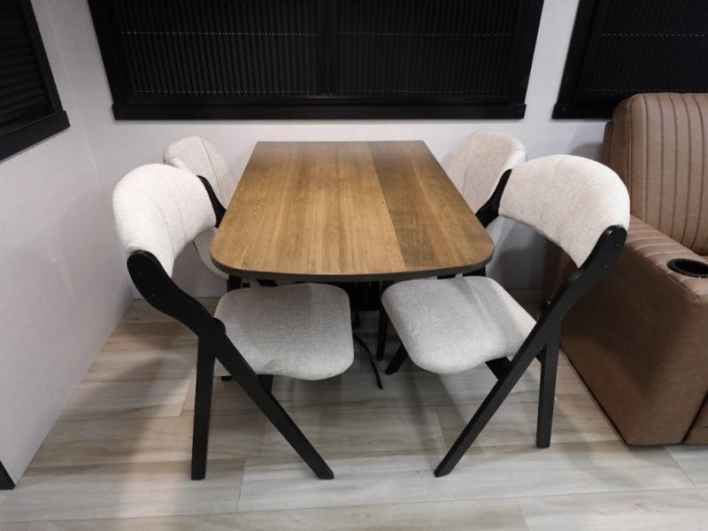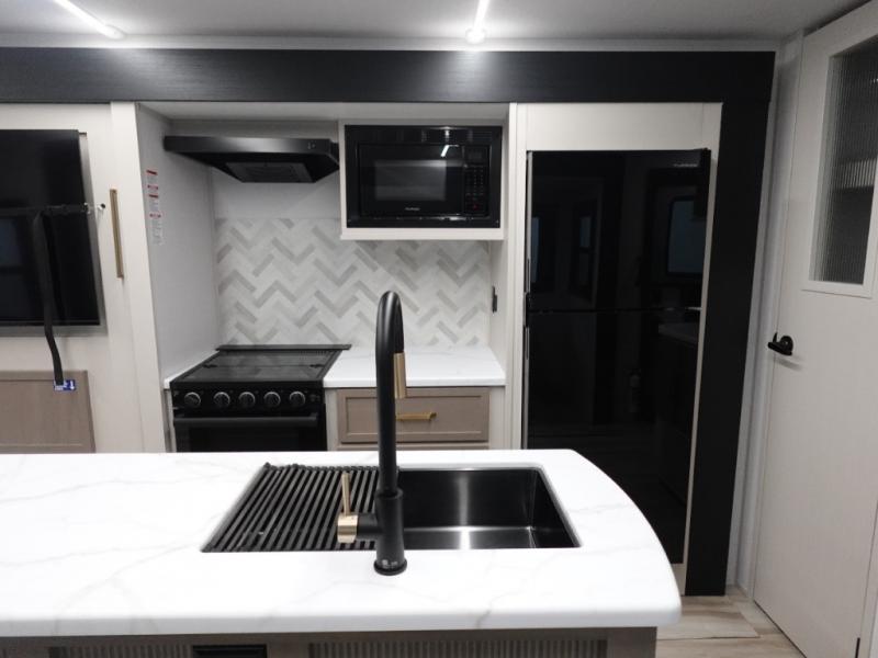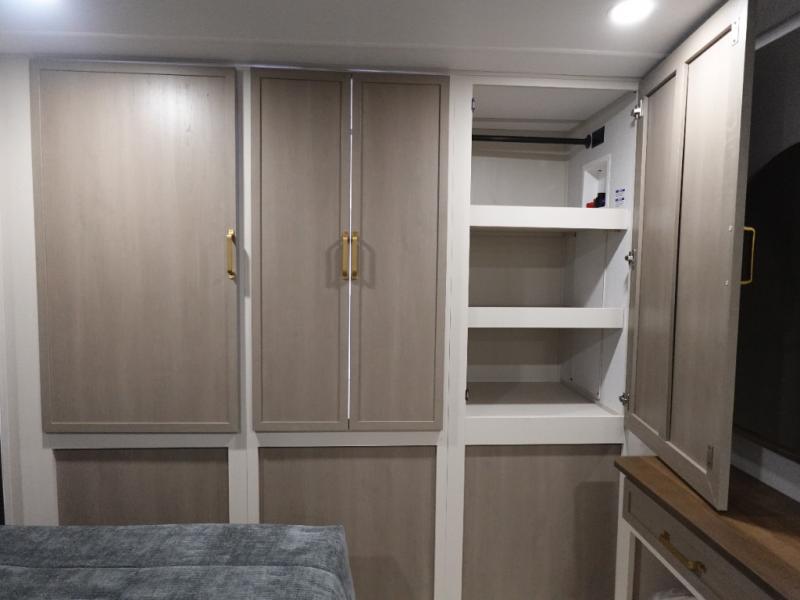 You are going to love the spacious private bedroom with a space-saving door, custom king bed slide, a dresser, and a full-width wardrobe with washer and dryer prep. If you ever decide to get out of bed, you can enjoy a relaxing shower in the residential shower with a skylight and a wide-open kitchen and living area with dual opposing slide outs. The cook will love having a kitchen island, a hutch, a large pantry, plus a 12V refrigerator. There is an entertainment center with a 50" TV and fireplace plus plenty of seating on the furniture. And don't forget about the natural lighting and views you will receive from the panoramic windows.