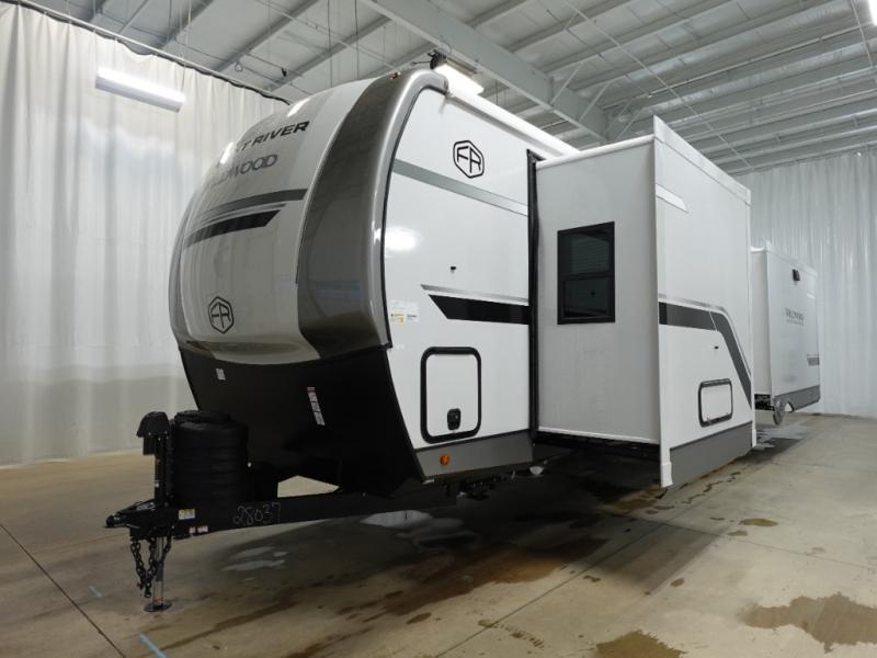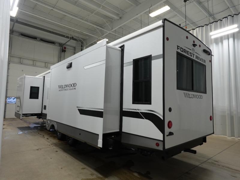 With any Wildwood Heritage Glen travel trailer by Forest River, the quality construction, attention to detail and design along with a bright and welcoming interior allows you to relax in comfort with conveniences while exploring outdoors. Each model includes a WeatherShield one piece fiberglass roof, Maxxis radial tires, and an enclosed underbelly with 12V tank heaters on all holding tanks for added protection. You will appreciate the on-demand tankless water heater, along with the 15K BTU Quite Cool A/C and 50 Amp service with a brace for a second A/C. There is an outside shower with hot and cold water, solar prep, a power tongue jack, plus many more exterior conveniences. Head inside to enjoy matte gold hardware, wood door casings in place of plastic door casings, and full length barreled ceilings for additional head room.