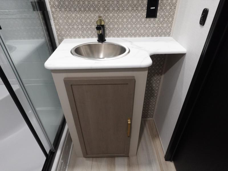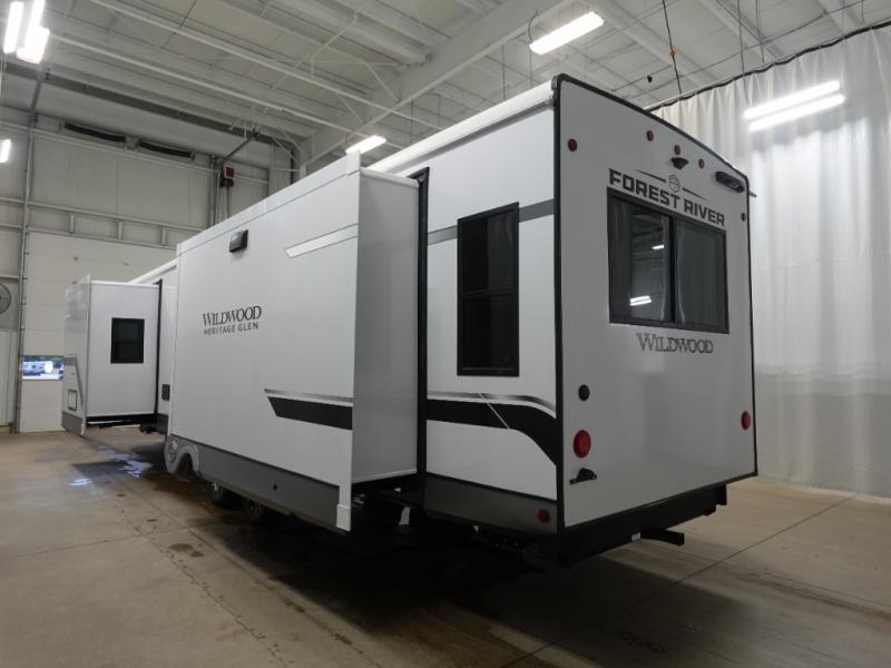 With any Wildwood Heritage Glen travel trailer by Forest River, the quality construction, attention to detail and design along with a bright and welcoming interior allows you to relax in comfort with conveniences while exploring outdoors. Each model includes a WeatherShield one piece fiberglass roof, Maxxis radial tires, and an enclosed underbelly with 12V tank heaters on all holding tanks for added protection. You will appreciate the on-demand tankless water heater, along with the 15K BTU Quite Cool A/C and 50 Amp service with a brace for a second A/C. There is an outside shower with hot and cold water, solar prep, a power tongue jack, plus many more exterior conveniences. Head inside to enjoy matte gold hardware, wood door casings in place of plastic door casings, and full length barreled ceilings for additional head room.