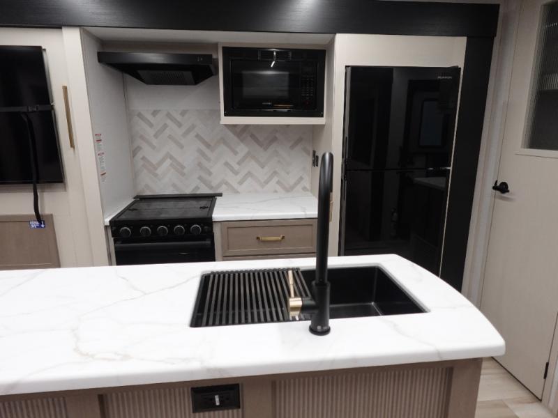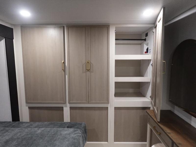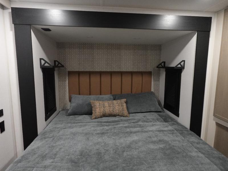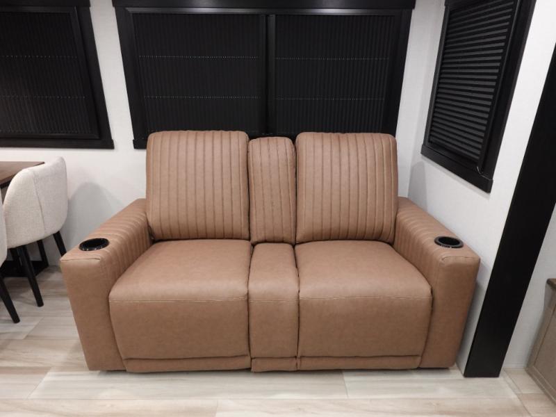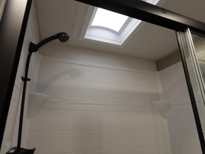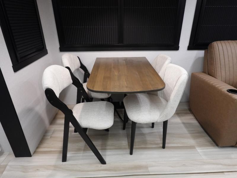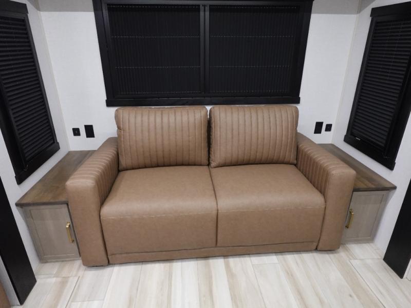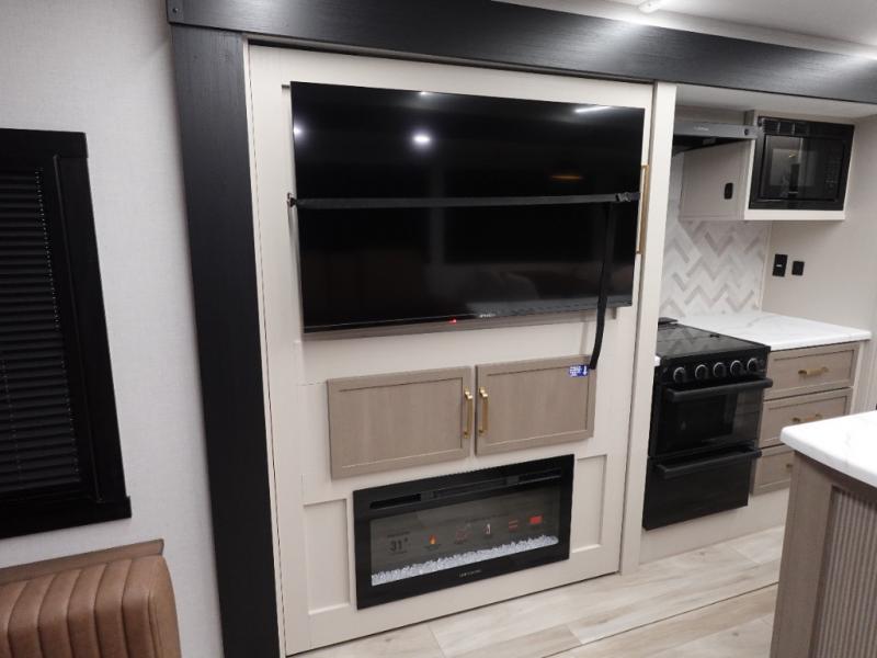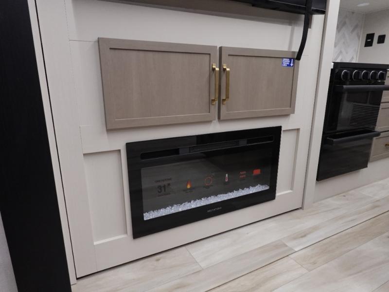 You are going to love the spacious private bedroom with a space-saving door, custom king bed slide, a dresser, and a full-width wardrobe with washer and dryer prep. If you ever decide to get out of bed, you can enjoy a relaxing shower in the residential shower with a skylight and a wide-open kitchen and living area with dual opposing slide outs. The cook will love having a kitchen island, a hutch, a large pantry, plus a 12V refrigerator. There is an entertainment center with a 50" TV and fireplace plus plenty of seating on the furniture. You can dine at the free-standing dinette if you prefer having your own seat. And don't forget about the natural lighting and views you will receive from the panoramic windows.