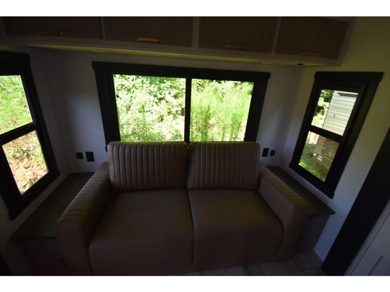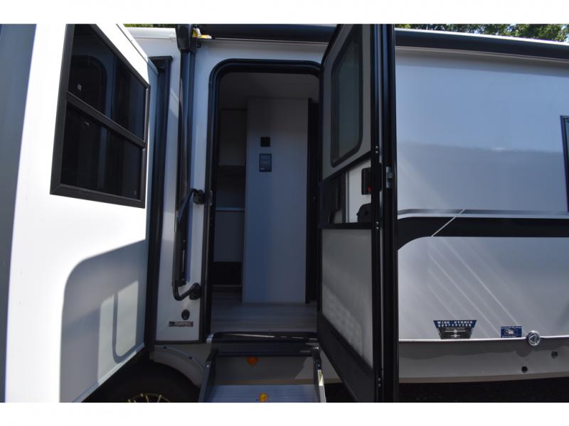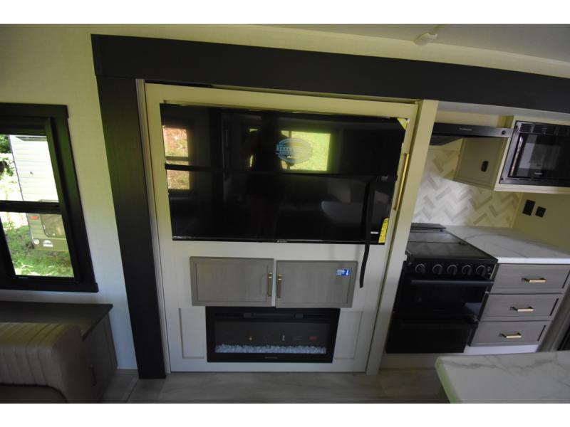 You are going to love the spacious private bedroom with a space-saving door, custom king bed slide, a dresser, and a full-width wardrobe with washer and dryer prep. If you ever decide to get out of bed, you can enjoy a relaxing shower in the residential shower with a skylight and a wide-open kitchen and living area with dual opposing slide outs. The cook will love having a kitchen island, a hutch, a large pantry, plus a 12V refrigerator. There is an entertainment center with a 50" TV and fireplace plus plenty of seating on the furniture. You can dine at the booth dinette or choose to add the free-standing dinette option if you prefer having your own seat. And don't forget about the natural lighting and views you will receive from the panoramic windows.