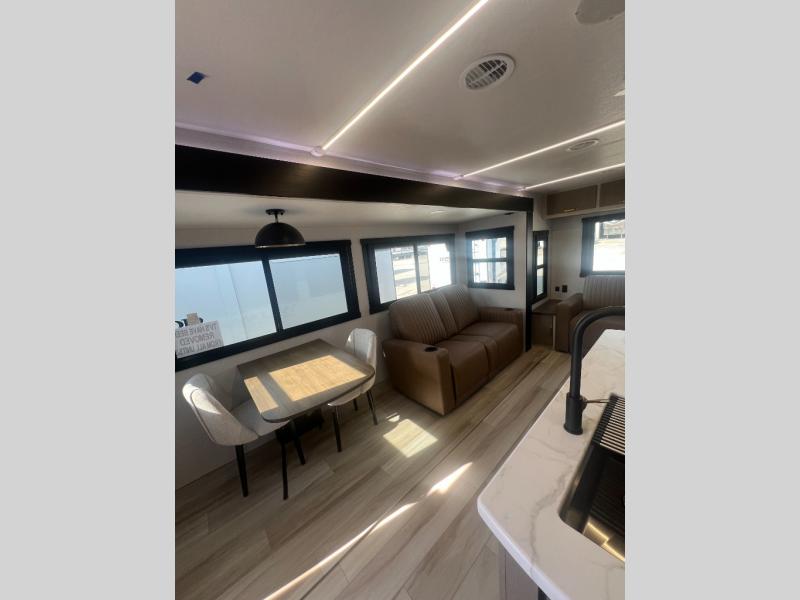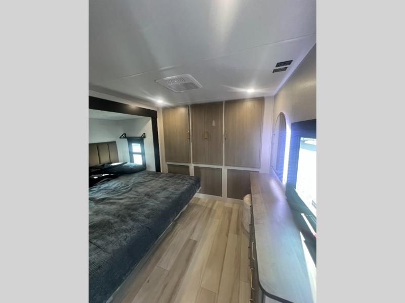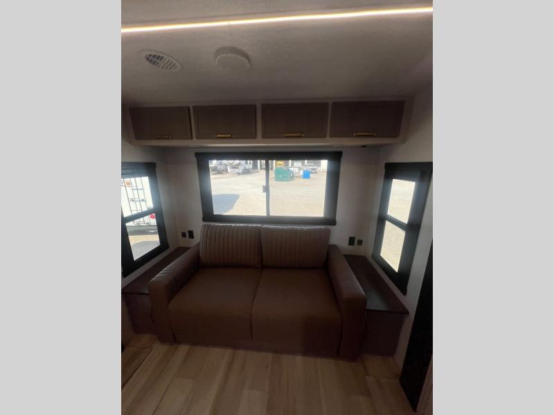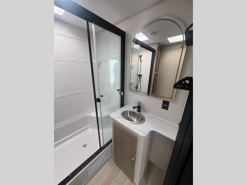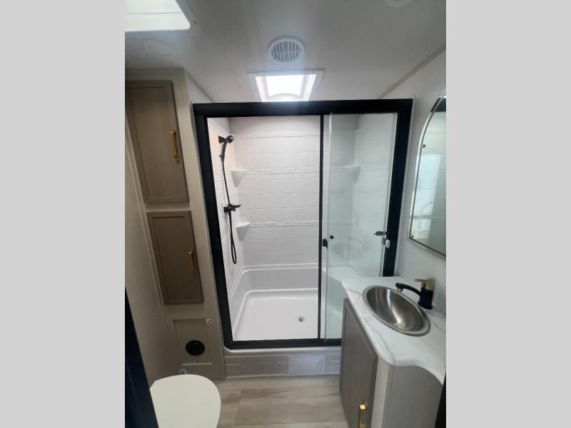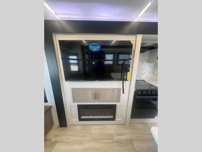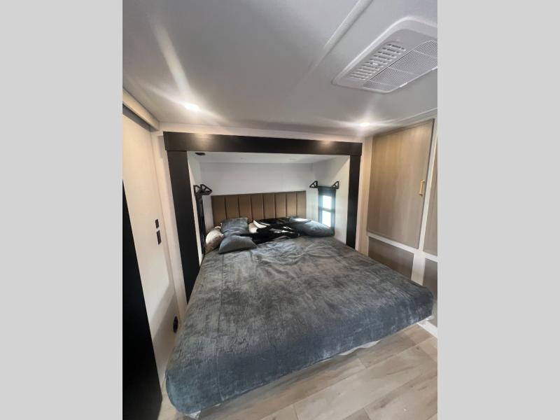You are going to love the spacious private bedroom with a space-saving door, custom king bed slide, a dresser, and a full-width wardrobe with washer and dryer prep. If you ever decide to get out of bed, you can enjoy a relaxing shower in the residential shower with a skylight and a wide-open kitchen and living area with dual opposing slide outs. The cook will love having a kitchen island, a hutch, a large pantry, plus a 12V refrigerator. There is an entertainment center with a 50" TV and fireplace plus plenty of seating on the furniture. You can dine at the booth dinette or choose to add the free-standing dinette option if you prefer having your own seat. And don't forget about the natural lighting and views you will receive from the panoramic windows.