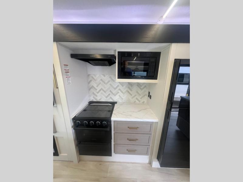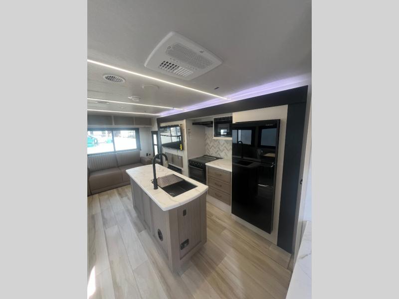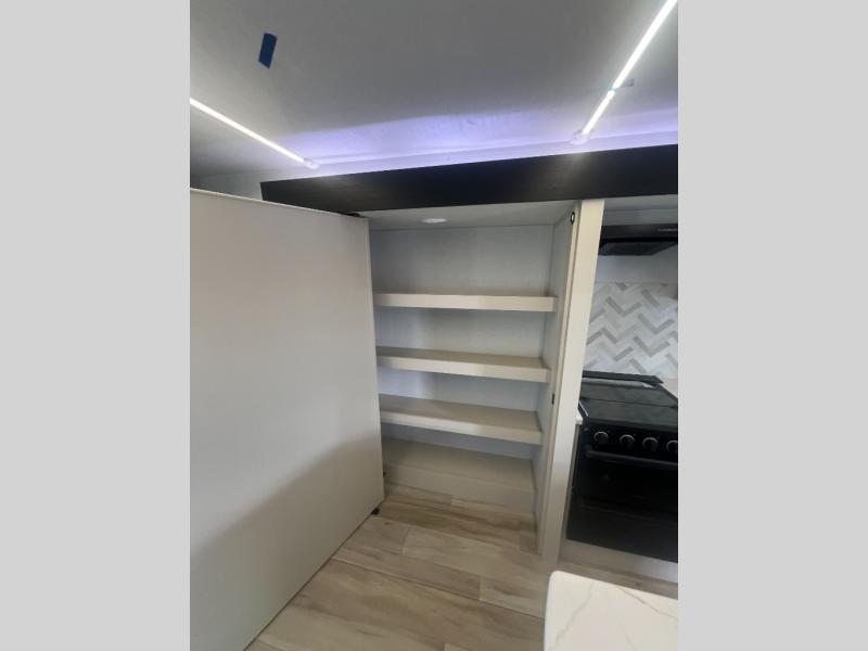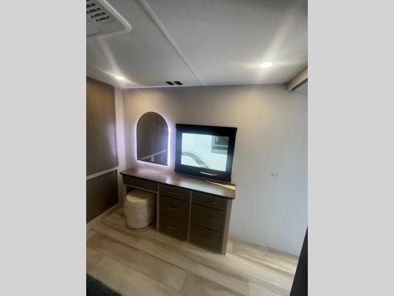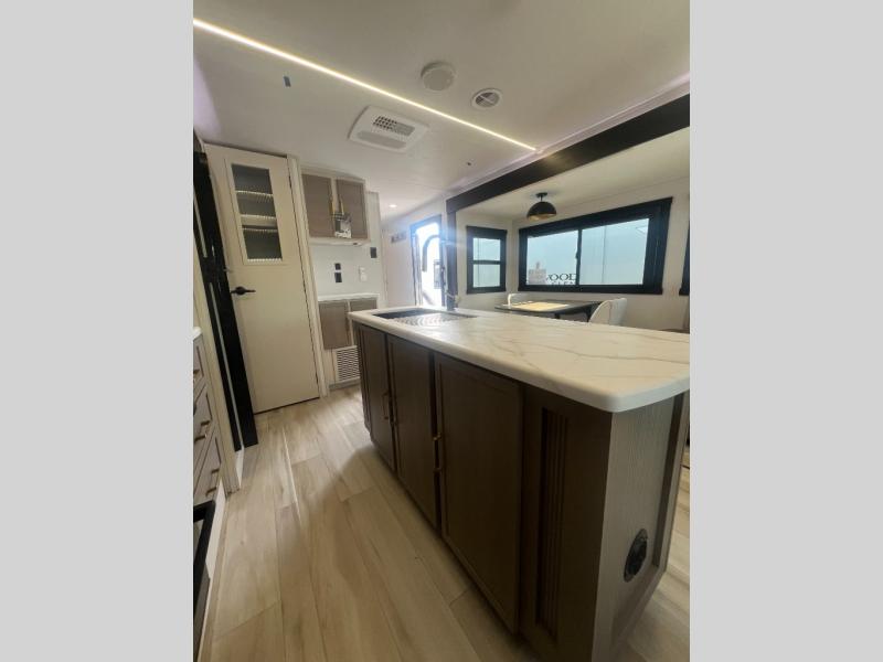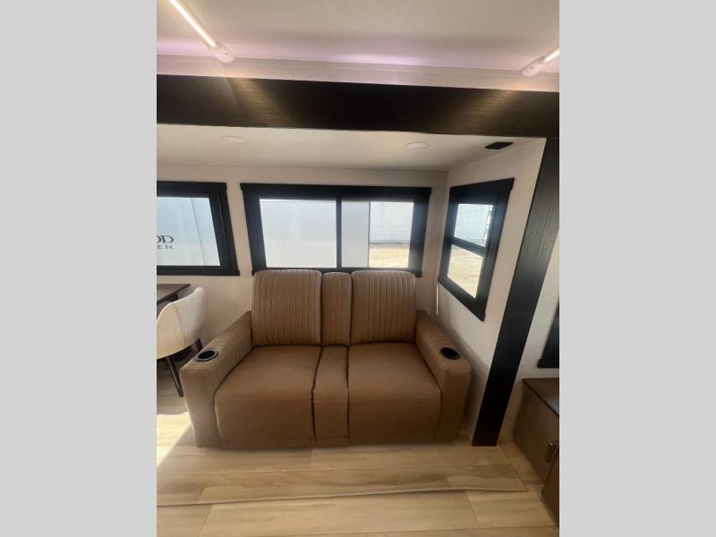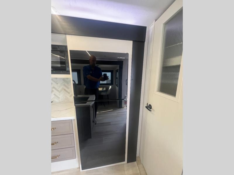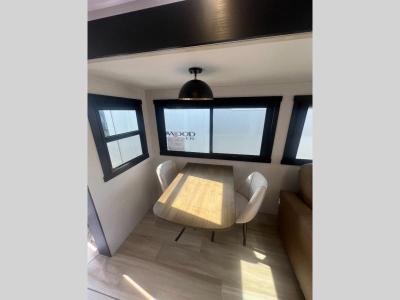 You are going to love the spacious private bedroom with a space-saving door, custom king bed slide, a dresser, and a full-width wardrobe with washer and dryer prep. If you ever decide to get out of bed, you can enjoy a relaxing shower in the residential shower with a skylight and a wide-open kitchen and living area with dual opposing slide outs. The cook will love having a kitchen island, a hutch, a large pantry, plus a 12V refrigerator. There is an entertainment center with a 50" TV and fireplace plus plenty of seating on the furniture. You can dine at the booth dinette or choose to add the free-standing dinette option if you prefer having your own seat. And don't forget about the natural lighting and views you will receive from the panoramic windows.
