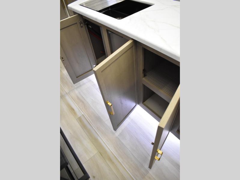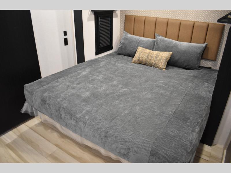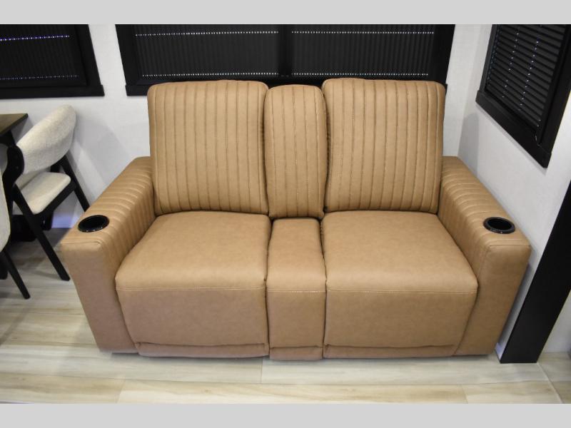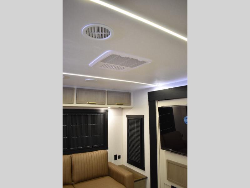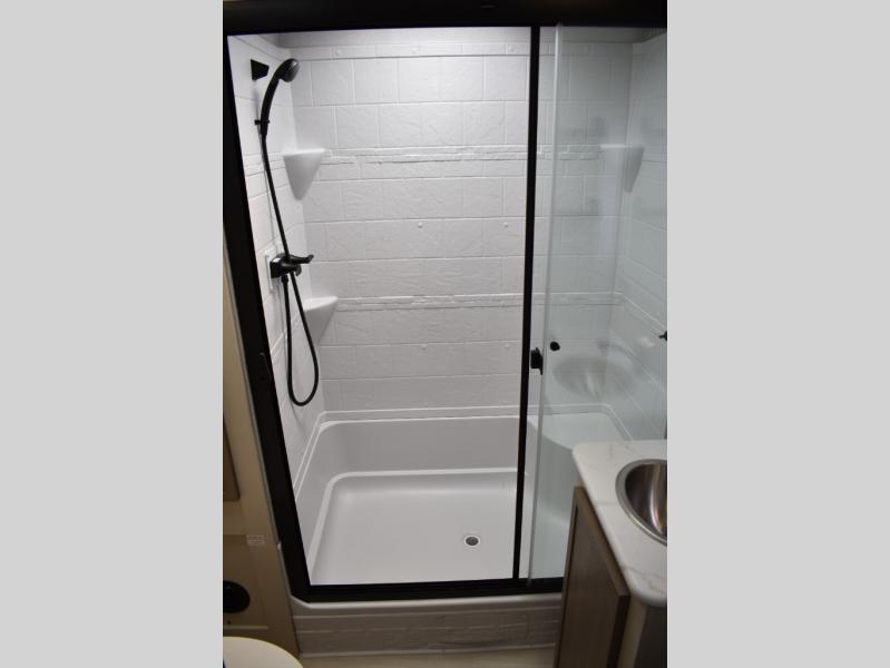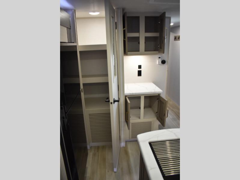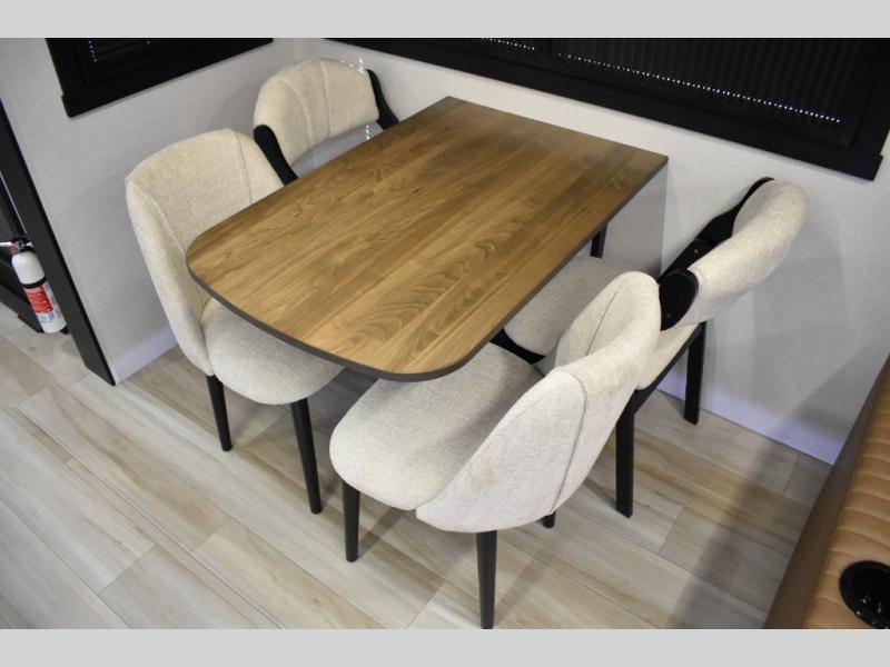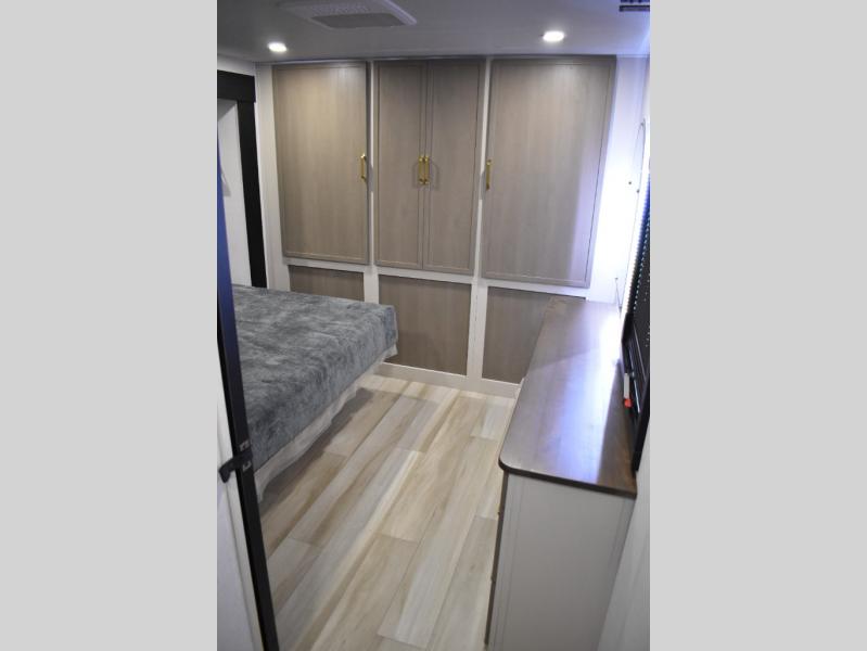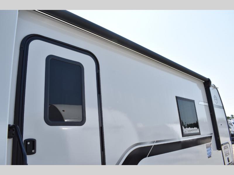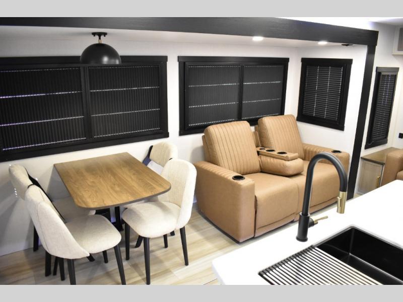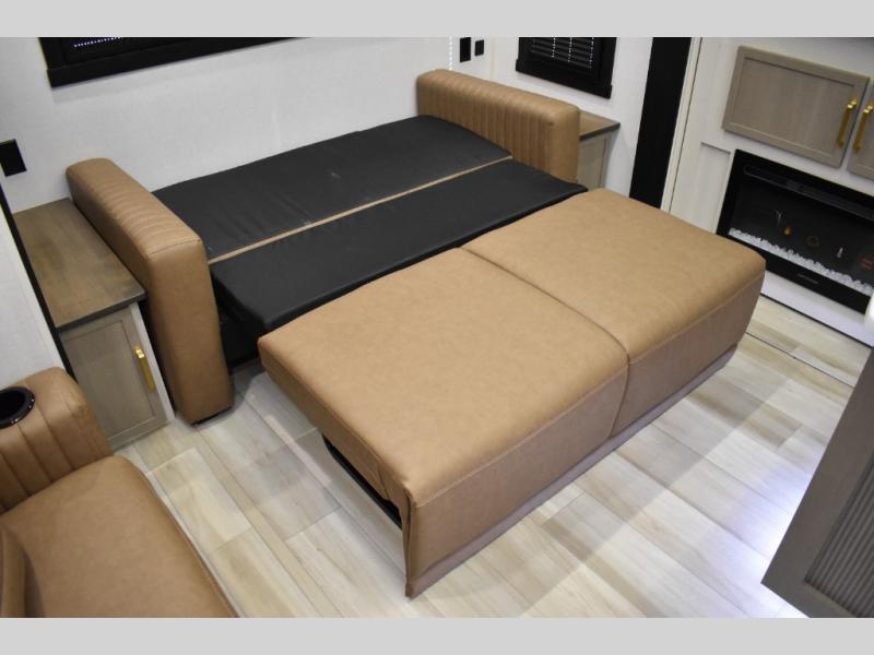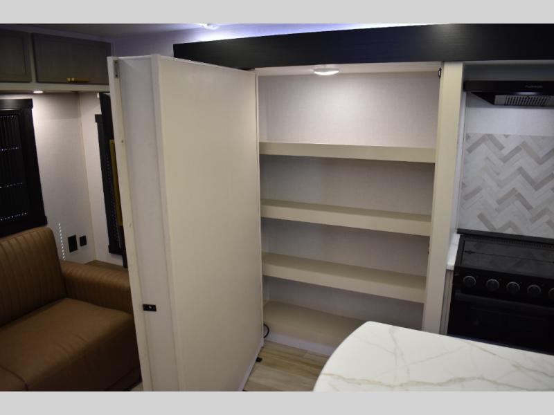 You are going to love the spacious private bedroom with a space-saving door, custom king bed slide, a dresser, and a full-width wardrobe with washer and dryer prep. If you ever decide to get out of bed, you can enjoy a relaxing shower in the residential shower with a skylight and a wide-open kitchen and living area with dual opposing slide outs. The cook will love having a kitchen island, a hutch, a large pantry, plus a 12V refrigerator. There is an entertainment center with a 50" TV and fireplace plus plenty of seating on the furniture. You can dine at the booth dinette or choose to add the free-standing dinette option if you prefer having your own seat. And don't forget about the natural lighting and views you will receive from the panoramic windows.