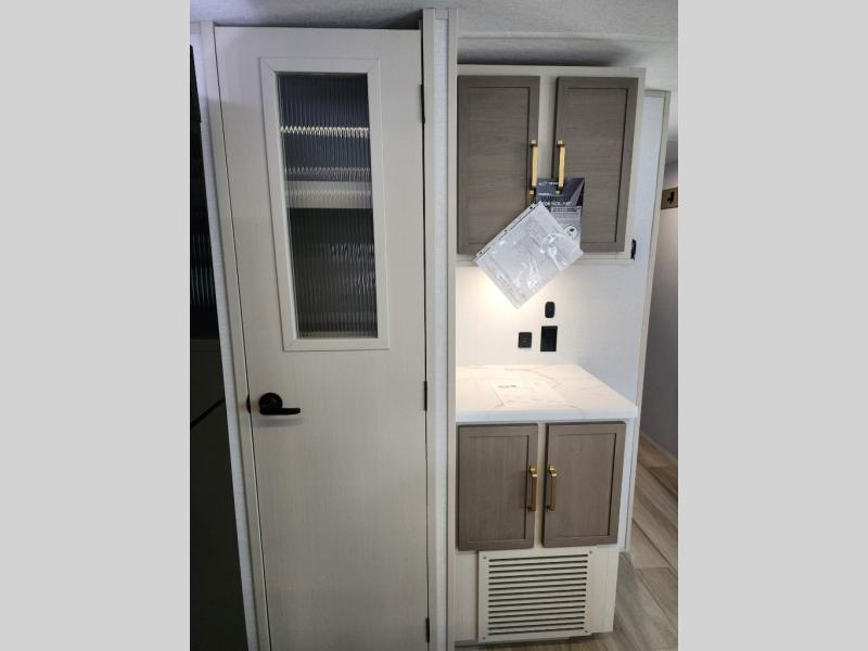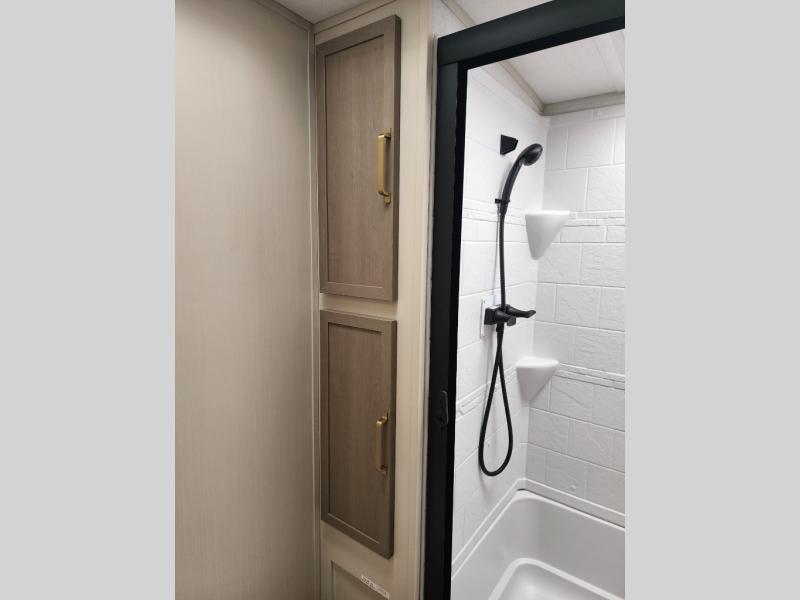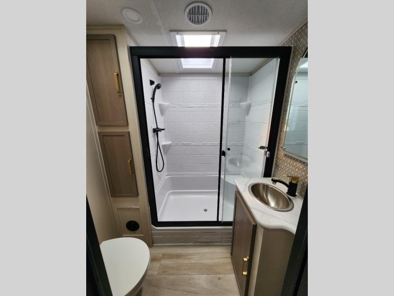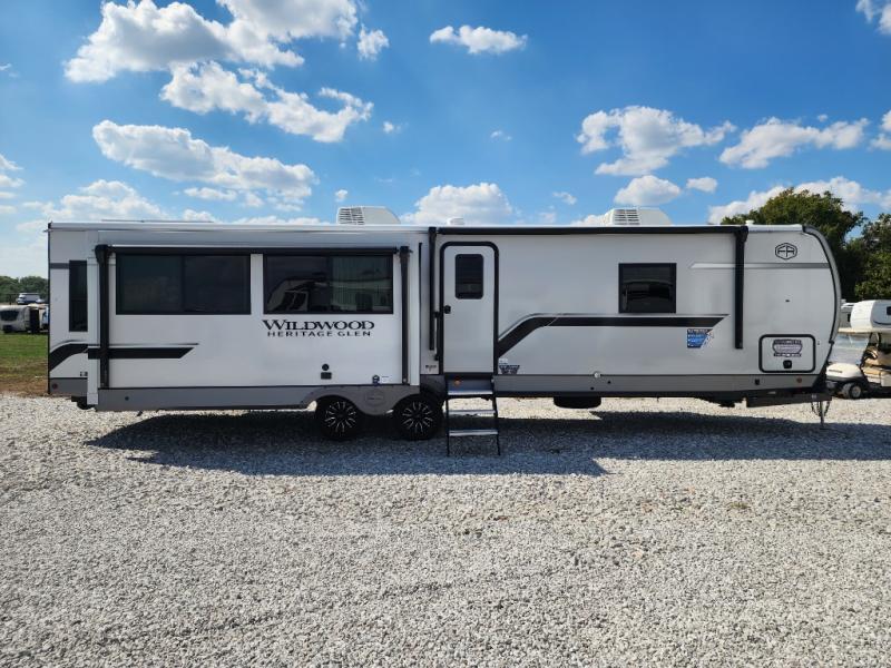 With any Wildwood Heritage Glen travel trailer by Forest River, the quality construction, attention to detail and design along with a bright and welcoming interior allows you to relax in comfort with conveniences while exploring outdoors. Each model includes a WeatherShield one piece fiberglass roof, Maxxis radial tires, and an enclosed underbelly with 12V tank heaters on all holding tanks for added protection. You will appreciate the on-demand tankless water heater, along with the 15K BTU Quite Cool A/C and 50 Amp service with a brace for a second A/C. There is an outside shower with hot and cold water, solar prep, a power tongue jack, plus many more exterior conveniences. Head inside to enjoy matte gold hardware, wood door casings in place of plastic door casings, and full length barreled ceilings for additional head room.