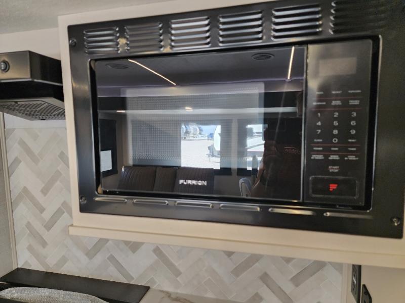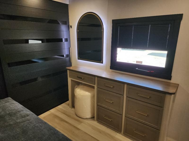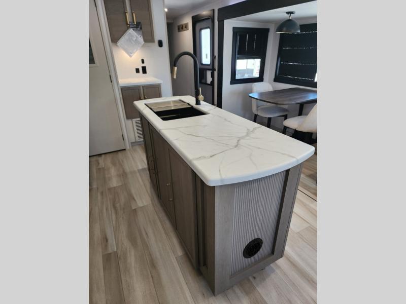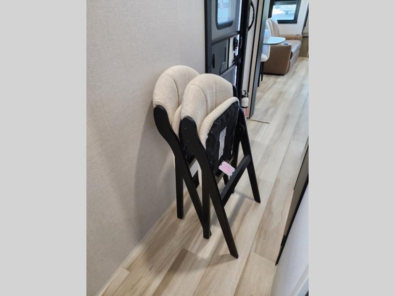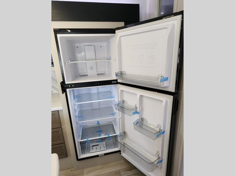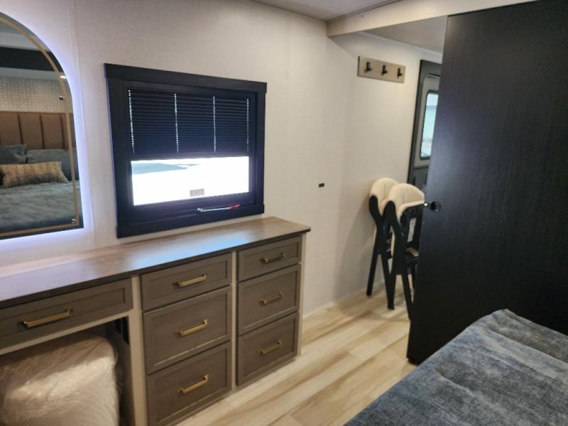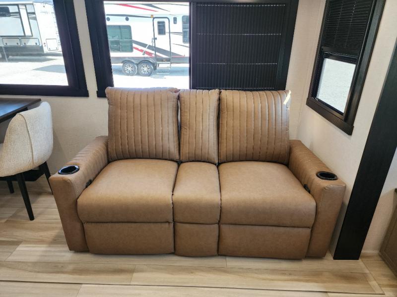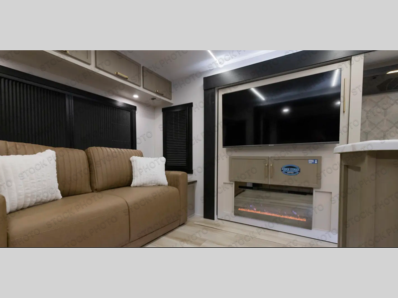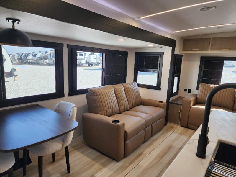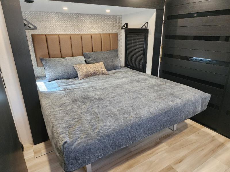 You are going to love the spacious private bedroom with a space-saving door, custom king bed slide, a dresser, and a full-width wardrobe with washer and dryer prep. If you ever decide to get out of bed, you can enjoy a relaxing shower in the residential shower with a skylight and a wide-open kitchen and living area with dual opposing slide outs. The cook will love having a kitchen island, a hutch, a large pantry, plus a 12V refrigerator. There is an entertainment center with a 50" TV and fireplace plus plenty of seating on the furniture. You can dine at the booth dinette or choose to add the free-standing dinette option if you prefer having your own seat. And don't forget about the natural lighting and views you will receive from the panoramic windows.