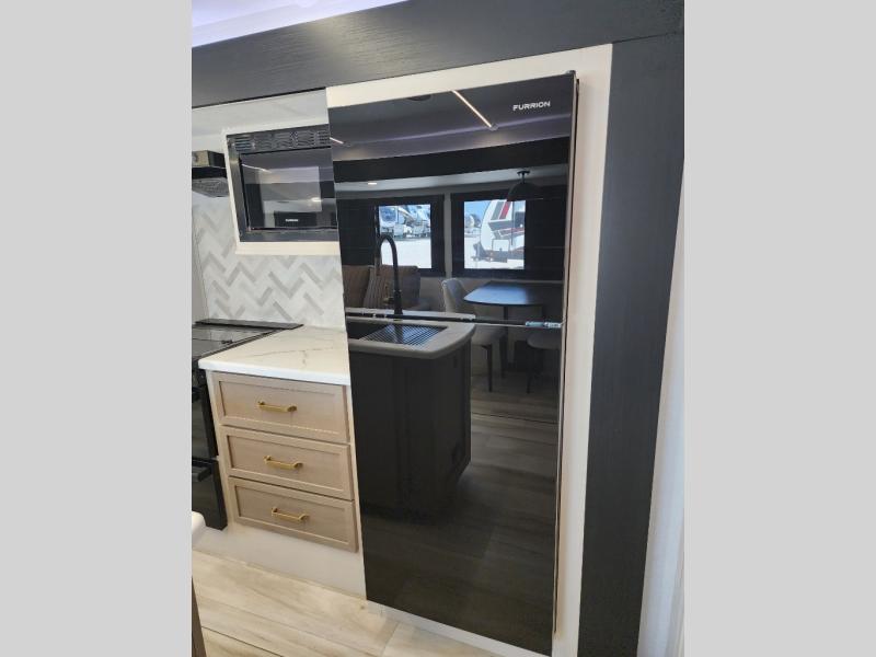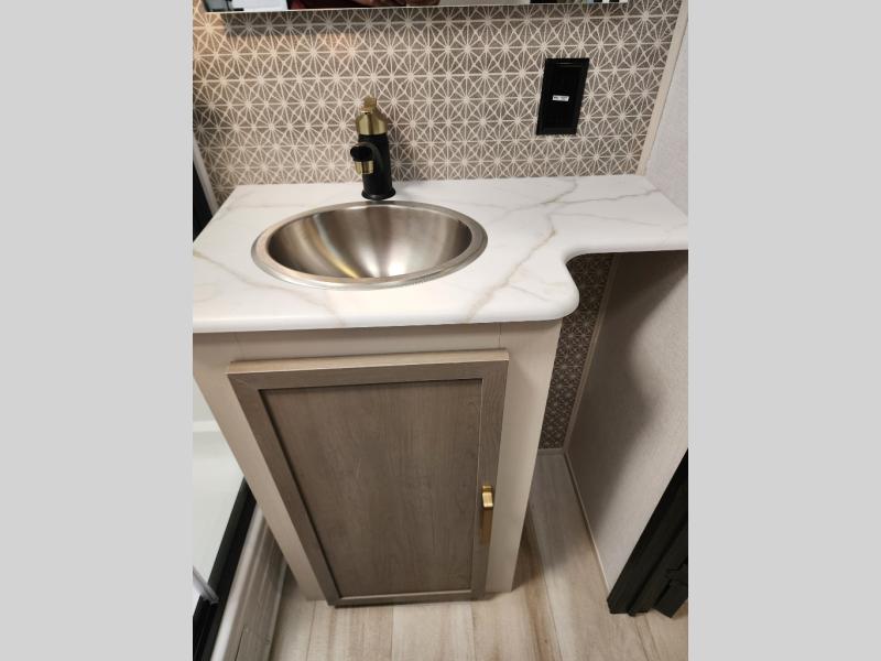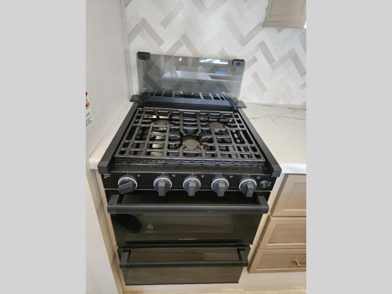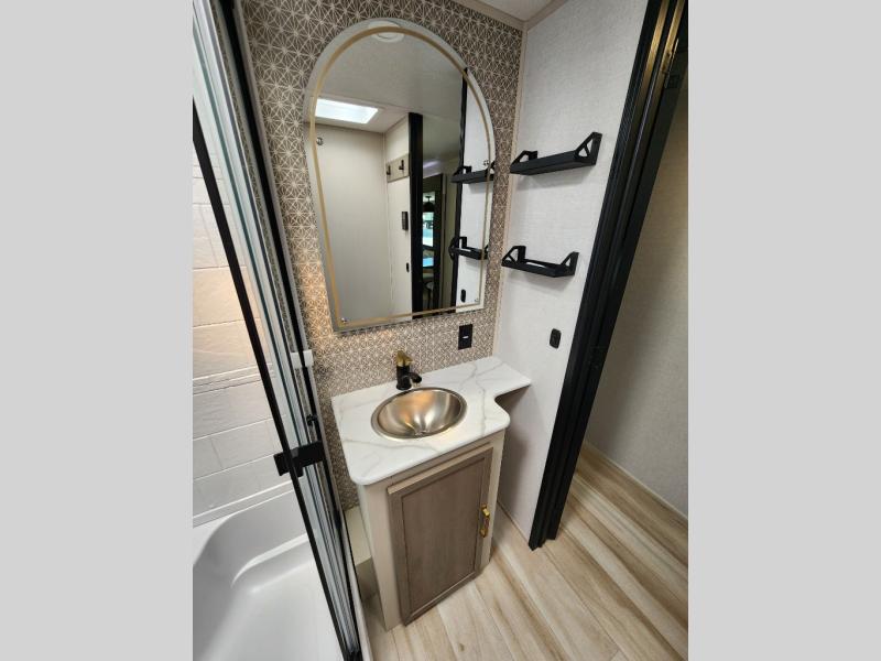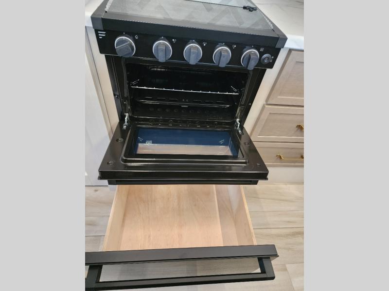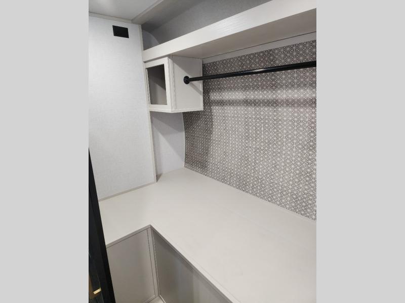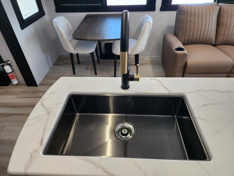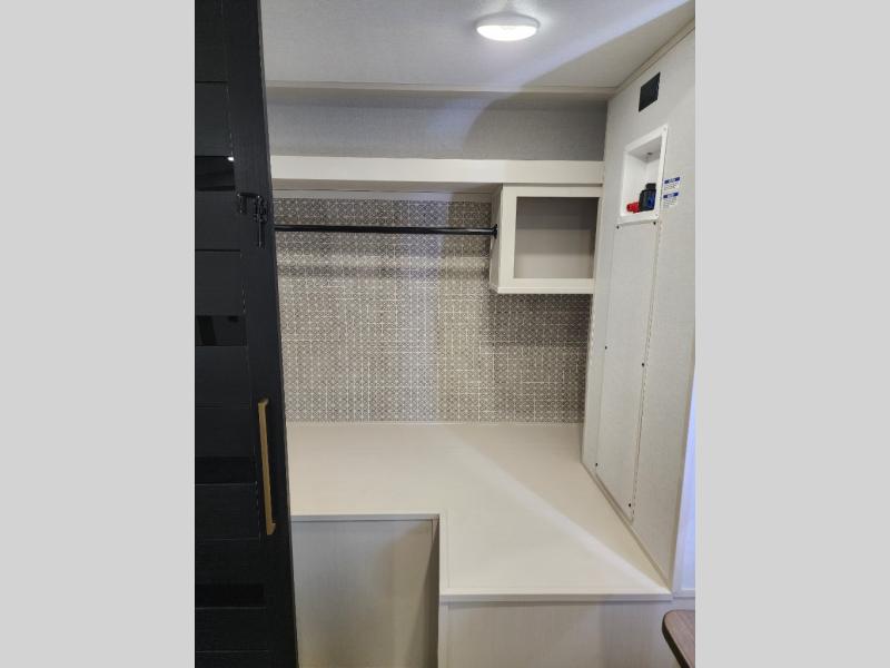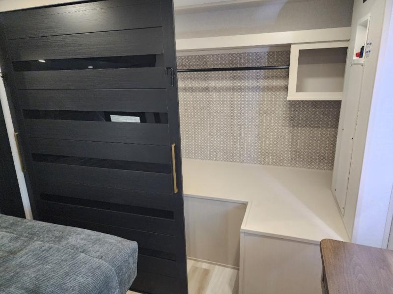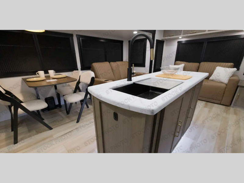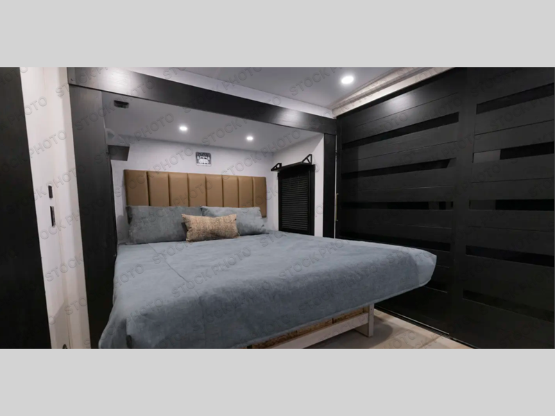 You are going to love the spacious private bedroom with a space-saving door, custom king bed slide, a dresser, and a full-width wardrobe with washer and dryer prep. If you ever decide to get out of bed, you can enjoy a relaxing shower in the residential shower with a skylight and a wide-open kitchen and living area with dual opposing slide outs. The cook will love having a kitchen island, a hutch, a large pantry, plus a 12V refrigerator. There is an entertainment center with a 50" TV and fireplace plus plenty of seating on the furniture. You can dine at the booth dinette or choose to add the free-standing dinette option if you prefer having your own seat. And don't forget about the natural lighting and views you will receive from the panoramic windows.