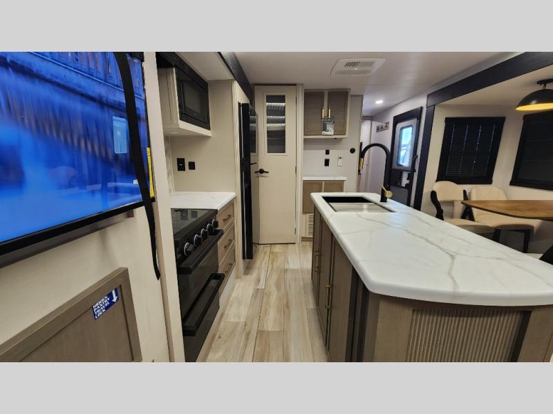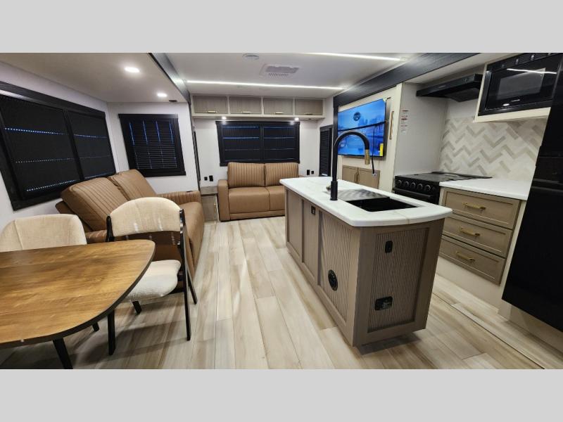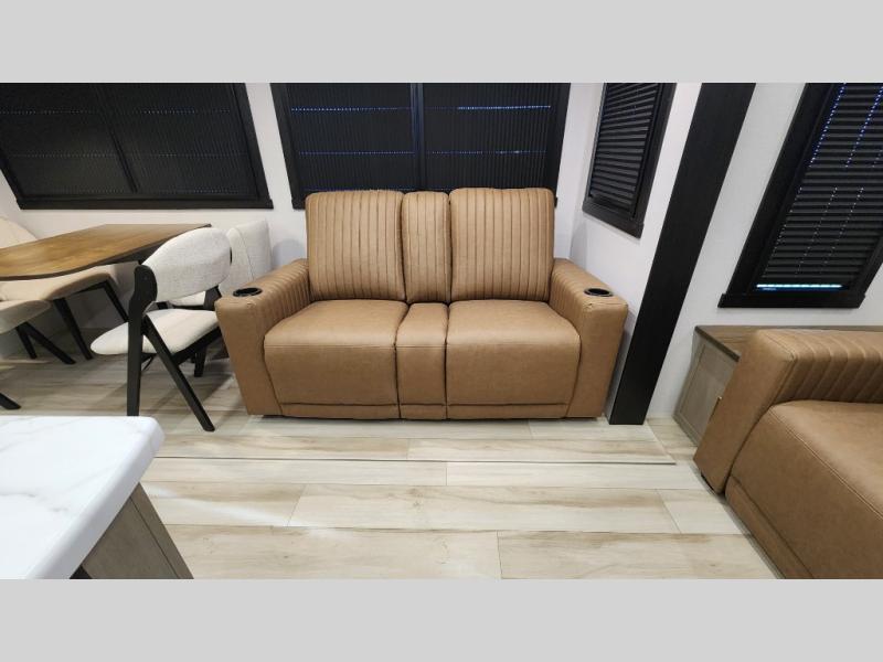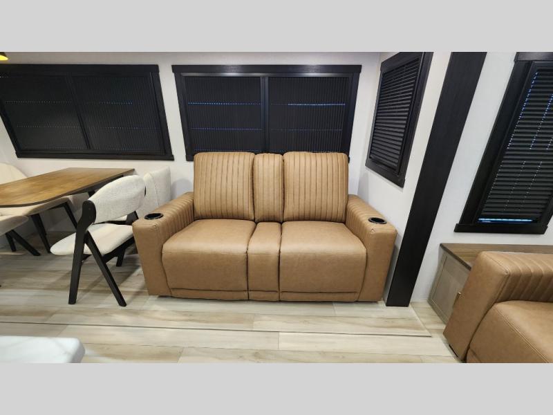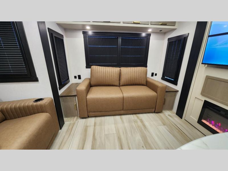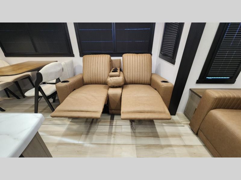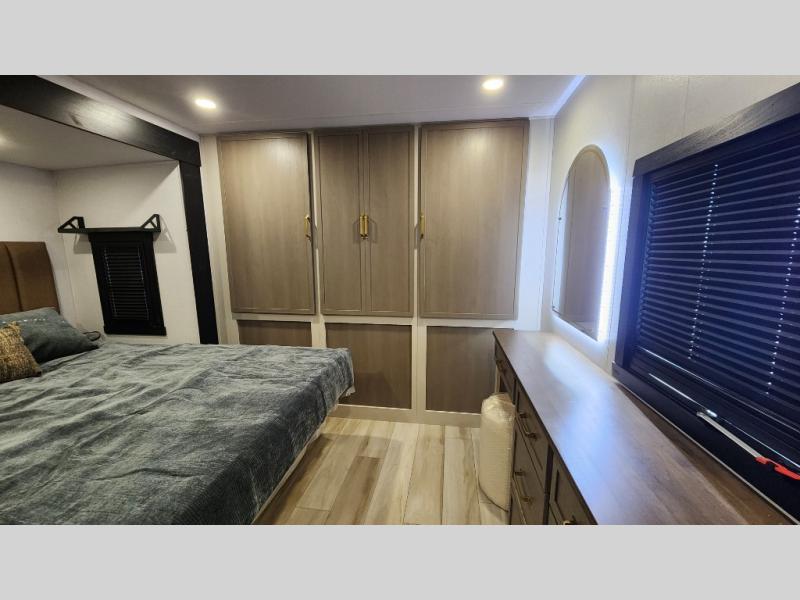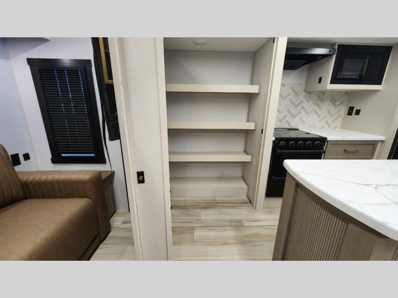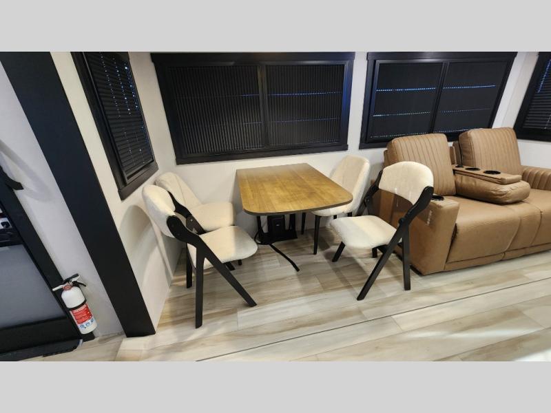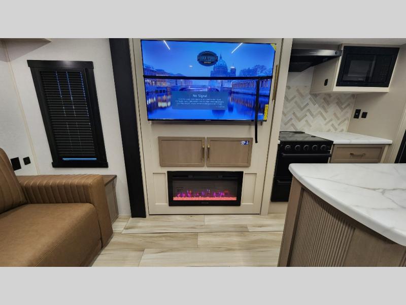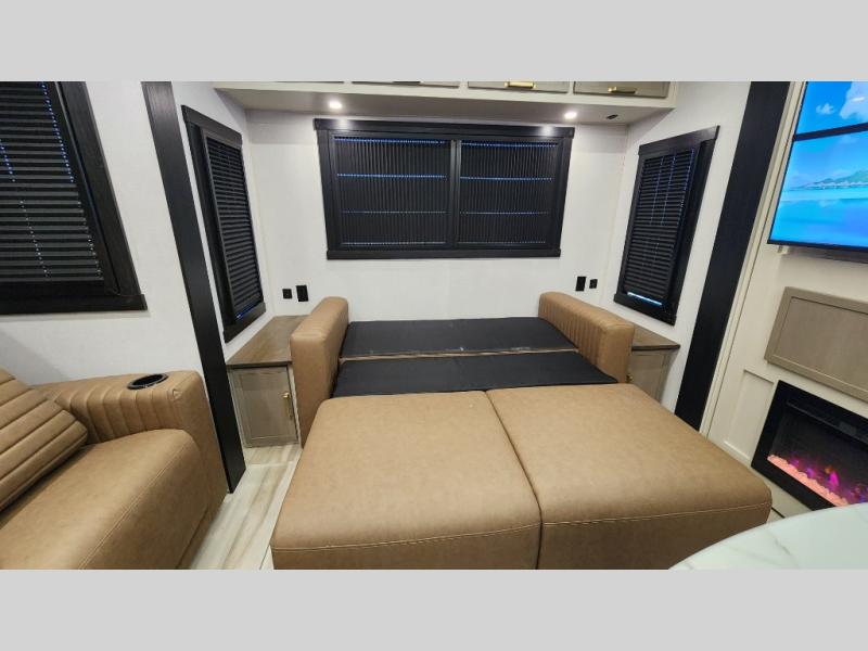 You are going to love the spacious private bedroom with a space-saving door, custom king bed slide, a dresser, and a full-width wardrobe with washer and dryer prep. If you ever decide to get out of bed, you can enjoy a relaxing shower in the residential shower with a skylight and a wide-open kitchen and living area with dual opposing slide outs. The cook will love having a kitchen island, a hutch, a large pantry, plus a 12V refrigerator. There is an entertainment center with a 50" TV and fireplace plus plenty of seating on the furniture. You can dine at the booth dinette or choose to add the free-standing dinette option if you prefer having your own seat. And don't forget about the natural lighting and views you will receive from the panoramic windows.