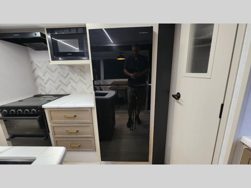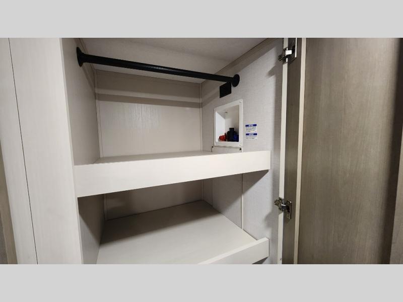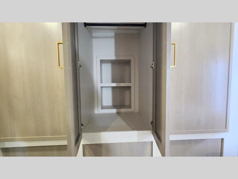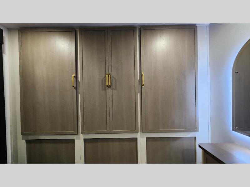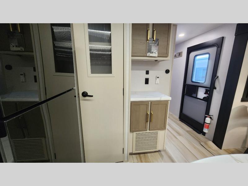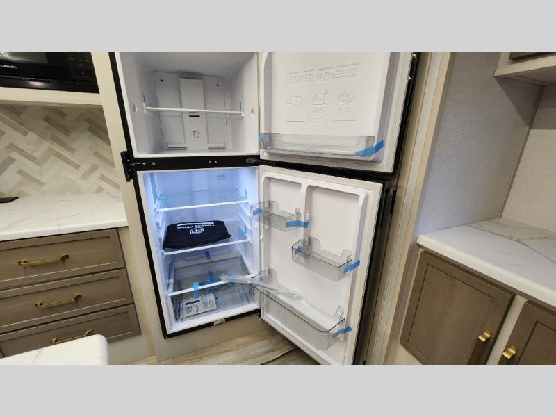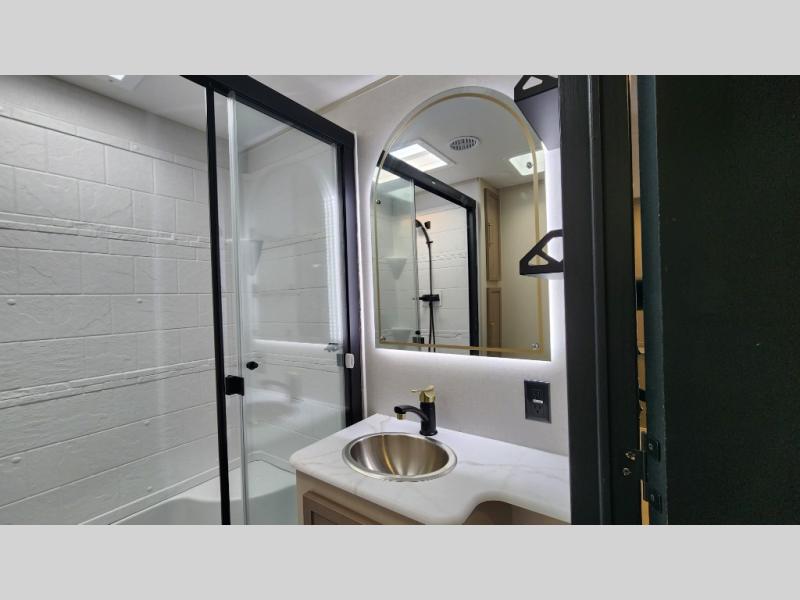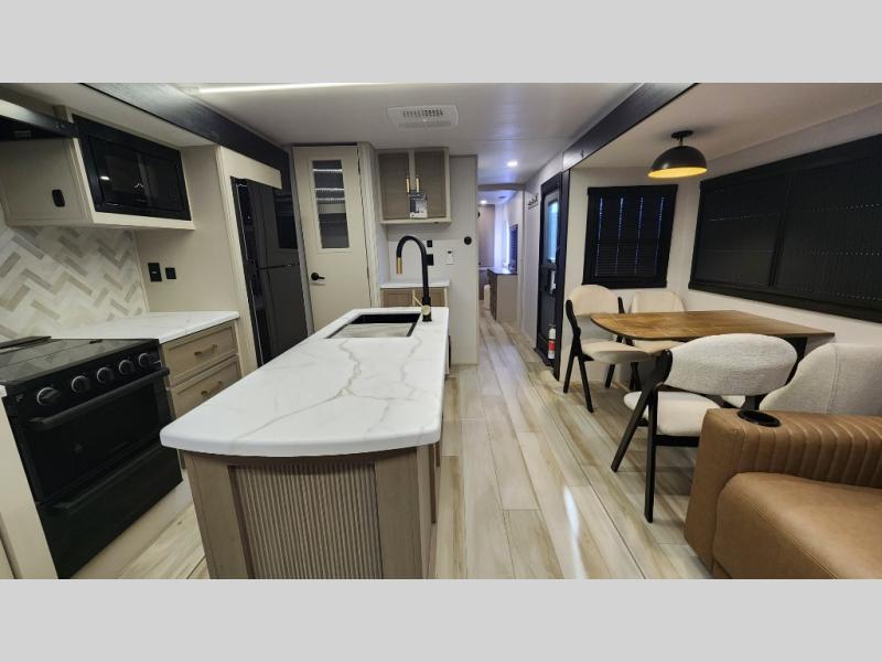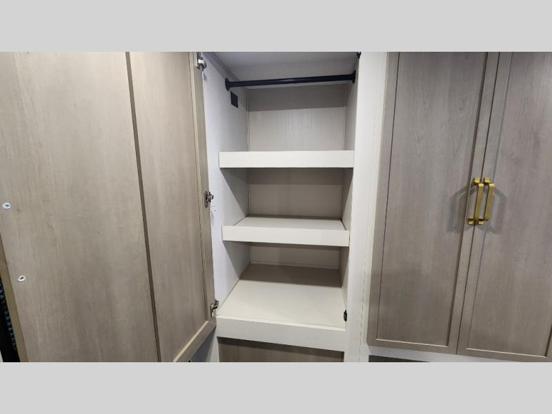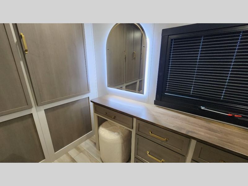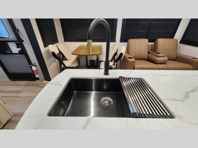 You are going to love the spacious private bedroom with a space-saving door, custom king bed slide, a dresser, and a full-width wardrobe with washer and dryer prep. If you ever decide to get out of bed, you can enjoy a relaxing shower in the residential shower with a skylight and a wide-open kitchen and living area with dual opposing slide outs. The cook will love having a kitchen island, a hutch, a large pantry, plus a 12V refrigerator. There is an entertainment center with a 50" TV and fireplace plus plenty of seating on the furniture. You can dine at the booth dinette or choose to add the free-standing dinette option if you prefer having your own seat. And don't forget about the natural lighting and views you will receive from the panoramic windows.