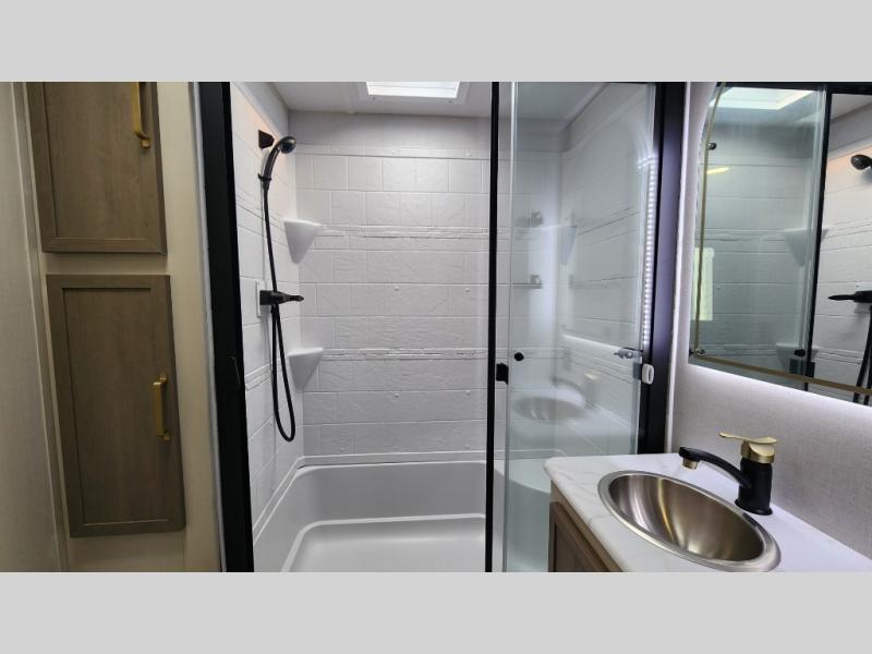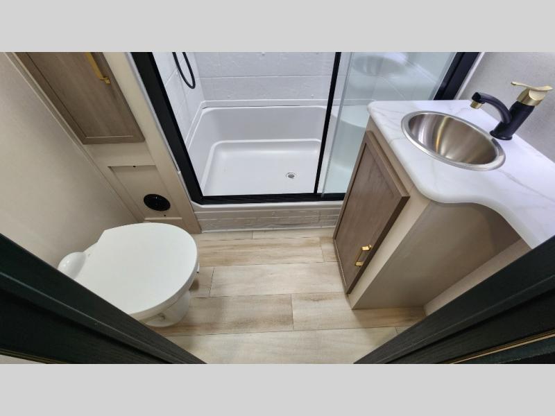 With any Wildwood Heritage Glen travel trailer by Forest River, the quality construction, attention to detail and design along with a bright and welcoming interior allows you to relax in comfort with conveniences while exploring outdoors. Each model includes a WeatherShield one piece fiberglass roof, Maxxis radial tires, and an enclosed underbelly with 12V tank heaters on all holding tanks for added protection. You will appreciate the on-demand tankless water heater, along with the 15K BTU Quite Cool A/C and 50 Amp service with a brace for a second A/C. There is an outside shower with hot and cold water, solar prep, a power tongue jack, plus many more exterior conveniences. Head inside to enjoy matte gold hardware, wood door casings in place of plastic door casings, and full length barreled ceilings for additional head room.