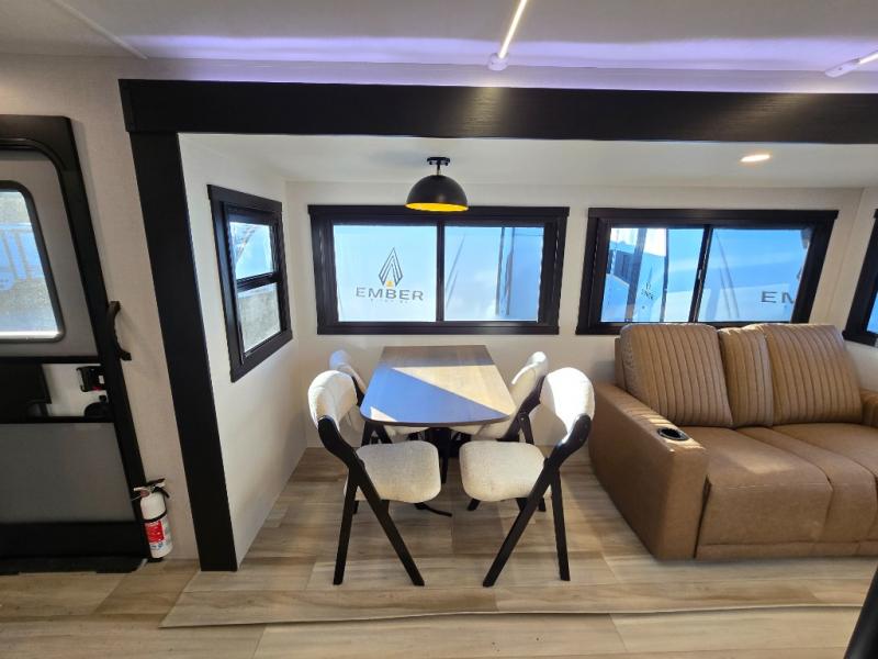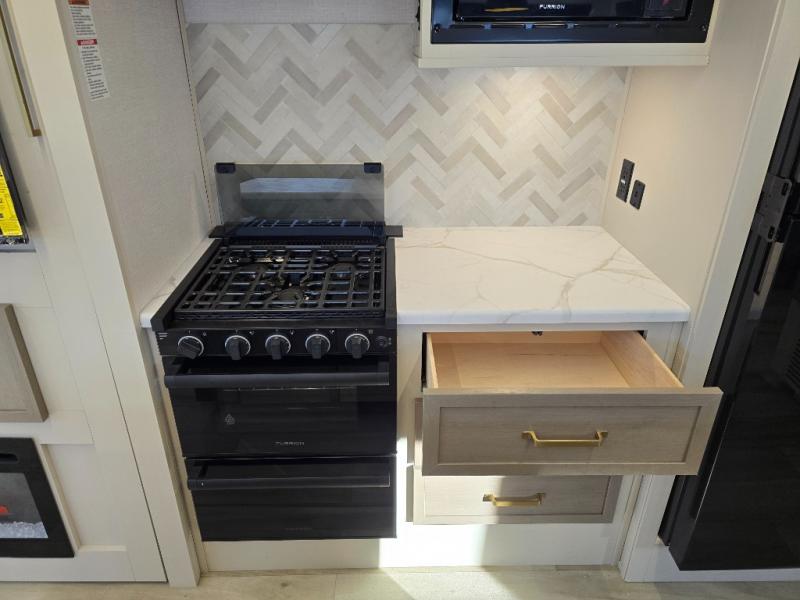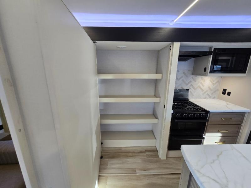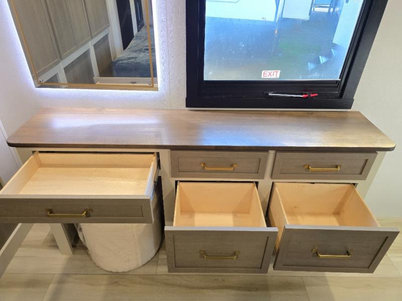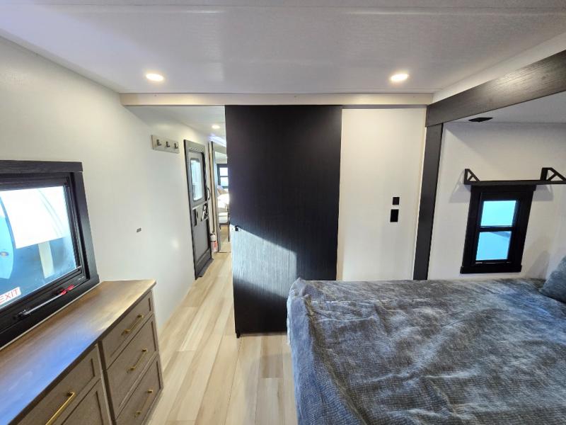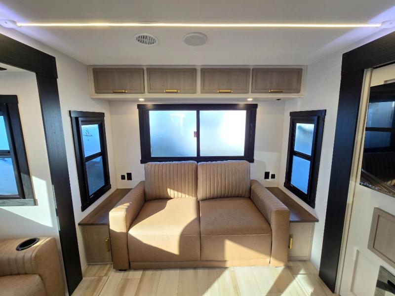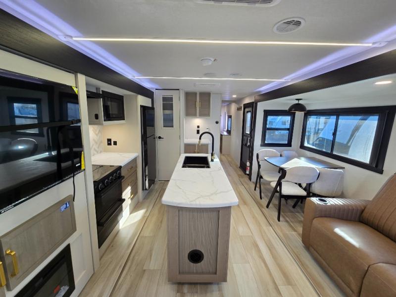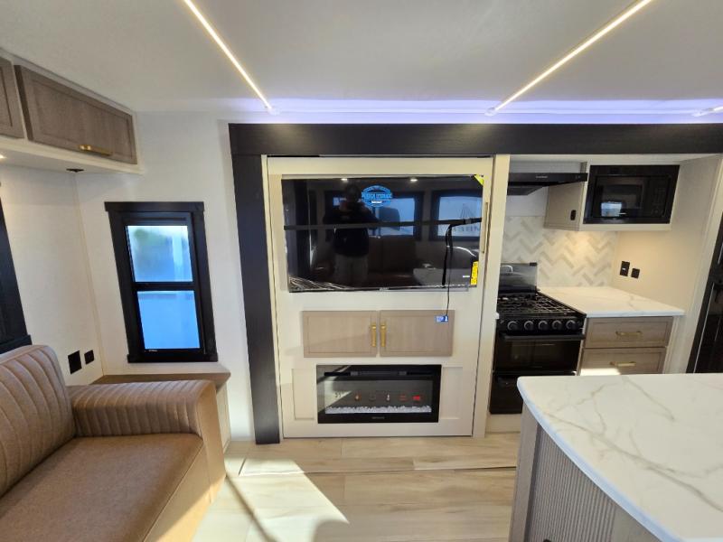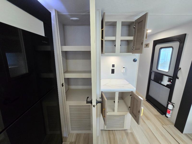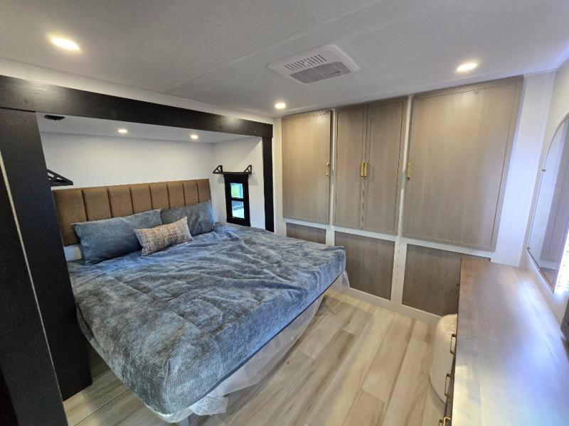 You are going to love the spacious private bedroom with a space-saving door, custom king bed slide, a dresser, and a full-width wardrobe with washer and dryer prep. If you ever decide to get out of bed, you can enjoy a relaxing shower in the residential shower with a skylight and a wide-open kitchen and living area with dual opposing slide outs. The cook will love having a kitchen island, a hutch, a large pantry, plus a 12V refrigerator. There is an entertainment center with a 50" TV and fireplace plus plenty of seating on the furniture. You can dine at the booth dinette or choose to add the free-standing dinette option if you prefer having your own seat. And don't forget about the natural lighting and views you will receive from the panoramic windows.