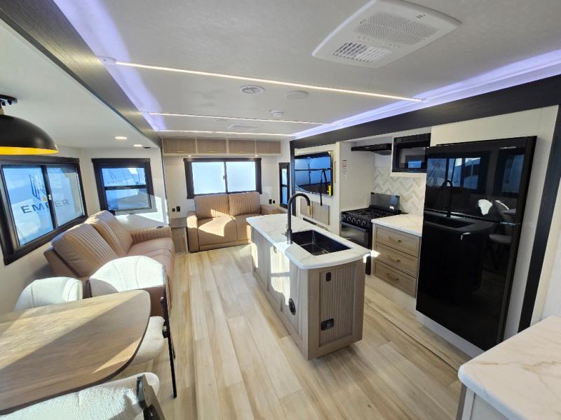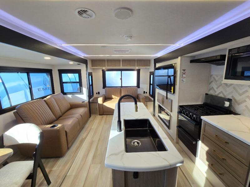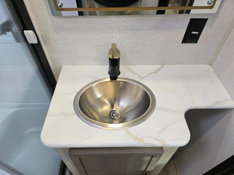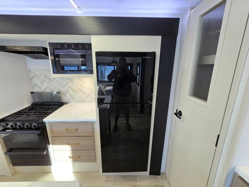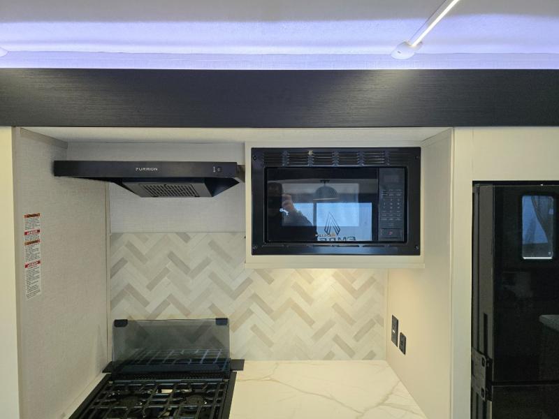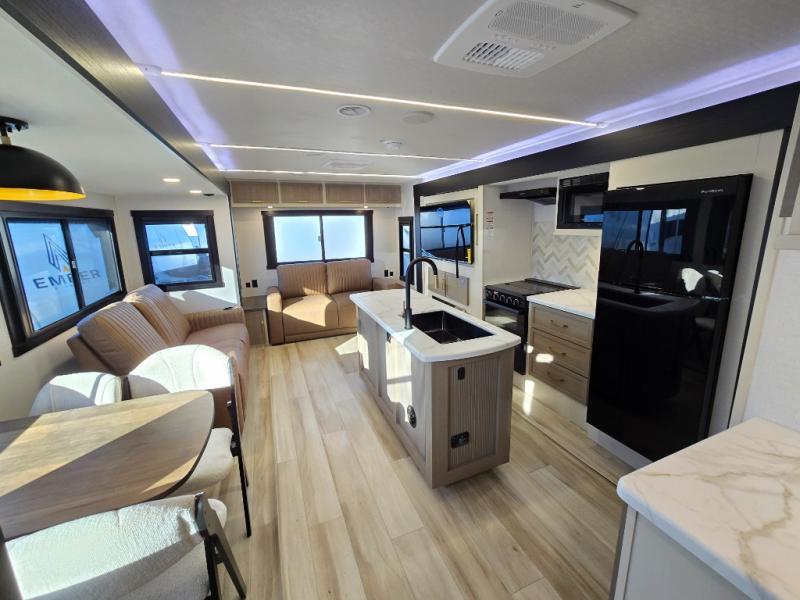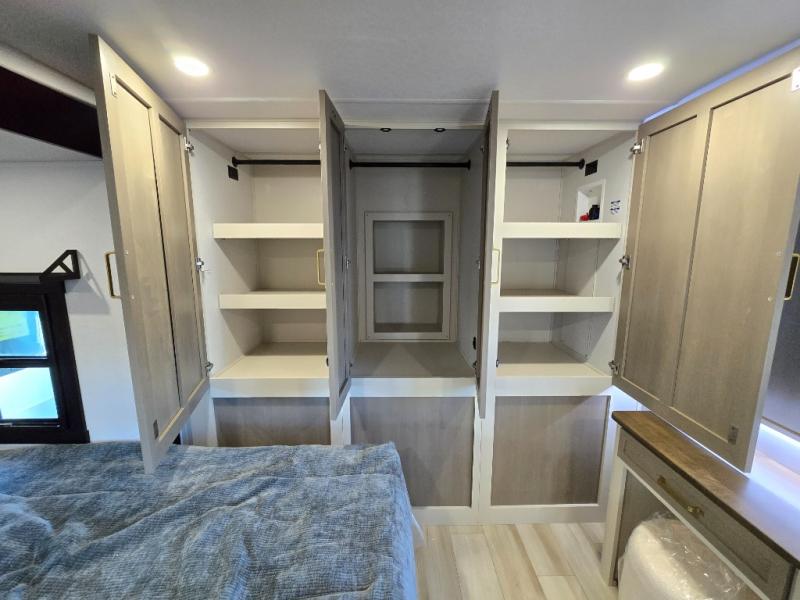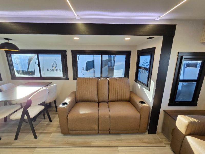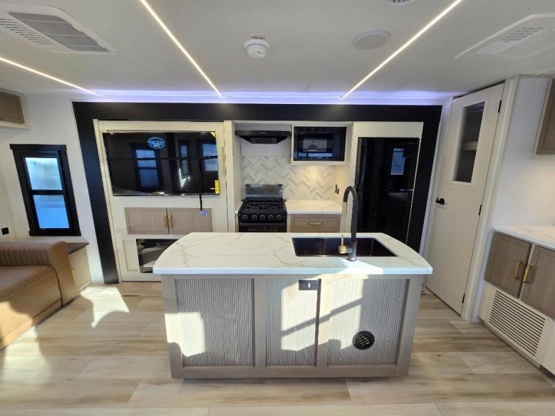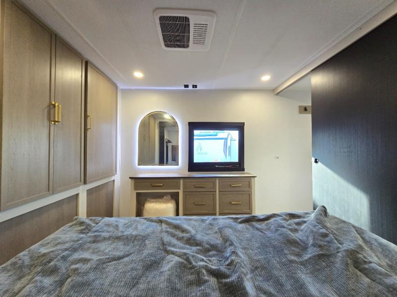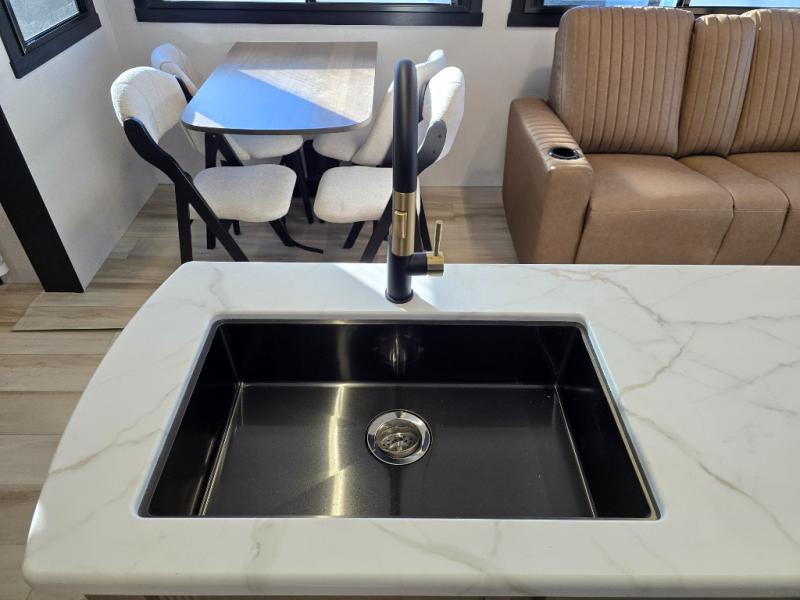 You are going to love the spacious private bedroom with a space-saving door, custom king bed slide, a dresser, and a full-width wardrobe with washer and dryer prep. If you ever decide to get out of bed, you can enjoy a relaxing shower in the residential shower with a skylight and a wide-open kitchen and living area with dual opposing slide outs. The cook will love having a kitchen island, a hutch, a large pantry, plus a 12V refrigerator. There is an entertainment center with a 50" TV and fireplace plus plenty of seating on the furniture. You can dine at the booth dinette or choose to add the free-standing dinette option if you prefer having your own seat. And don't forget about the natural lighting and views you will receive from the panoramic windows.