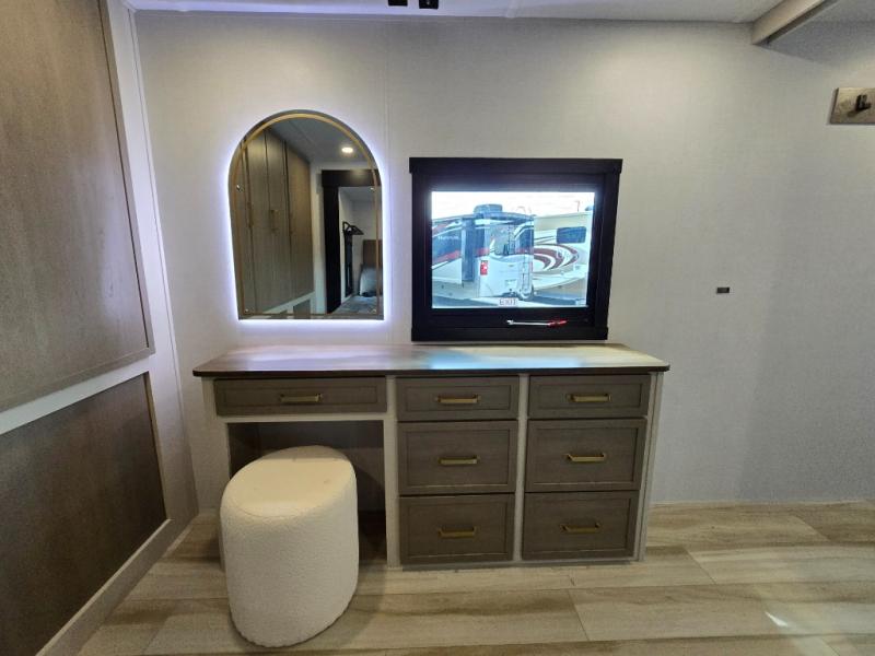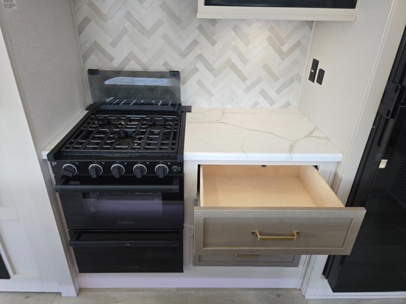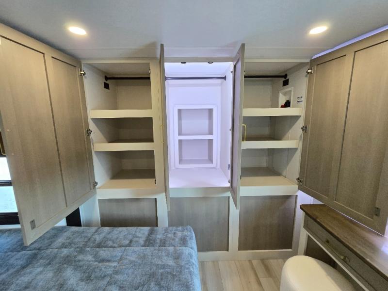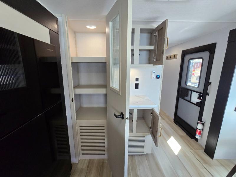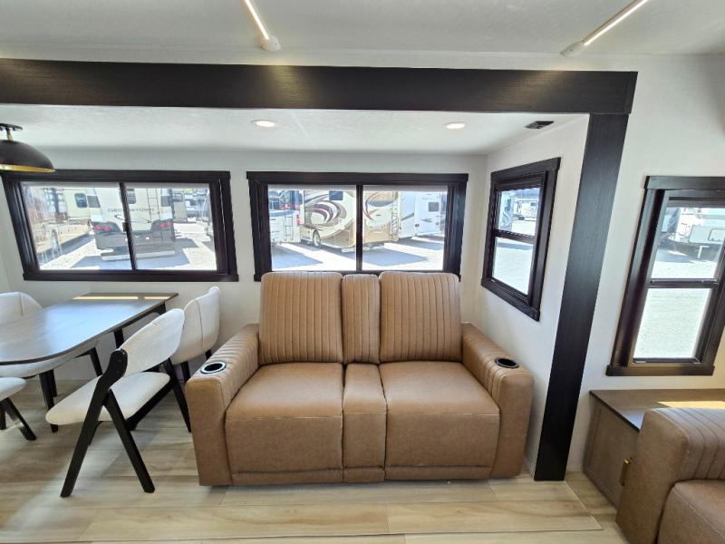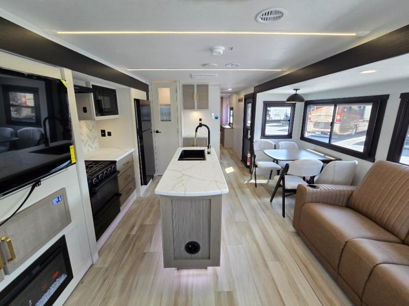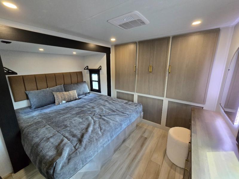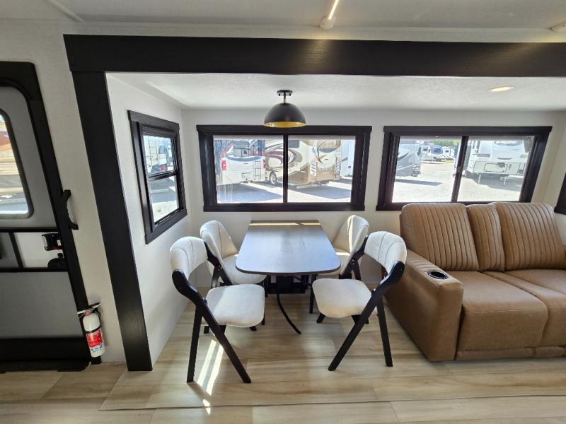 You are going to love the spacious private bedroom with a space-saving door, custom king bed slide, a dresser, and a full-width wardrobe with washer and dryer prep. If you ever decide to get out of bed, you can enjoy a relaxing shower in the residential shower with a skylight and a wide-open kitchen and living area with dual opposing slide outs. The cook will love having a kitchen island, a hutch, a large pantry, plus a 12V refrigerator. There is an entertainment center with a 50" TV and fireplace plus plenty of seating on the furniture. You can dine at the booth dinette or choose to add the free-standing dinette option if you prefer having your own seat. And don't forget about the natural lighting and views you will receive from the panoramic windows.