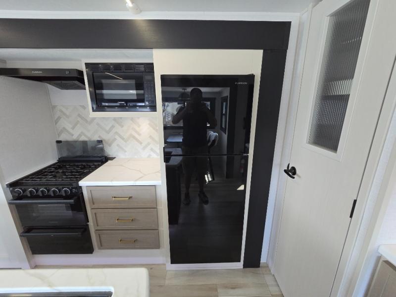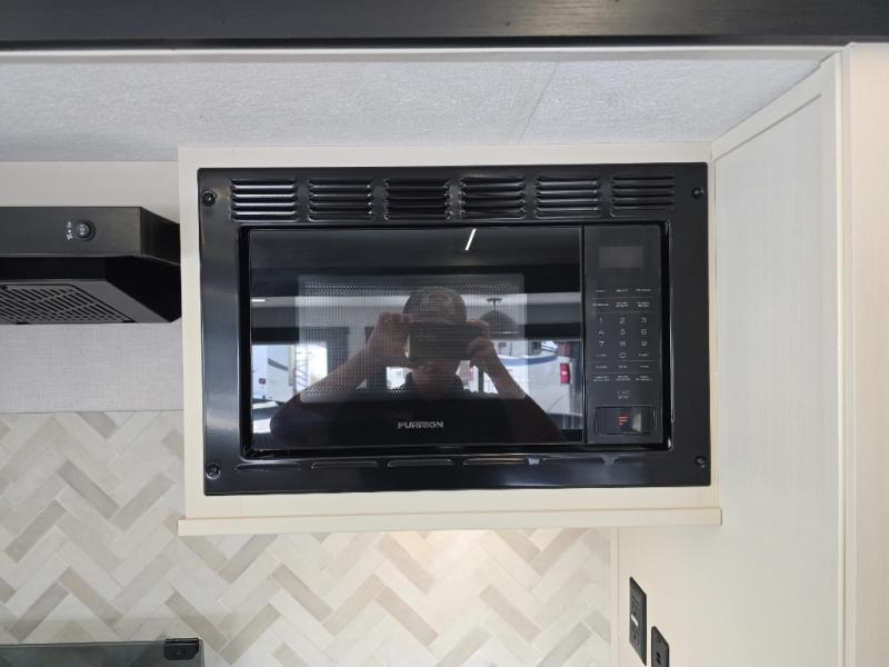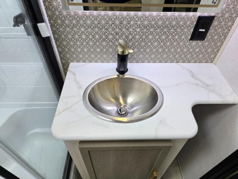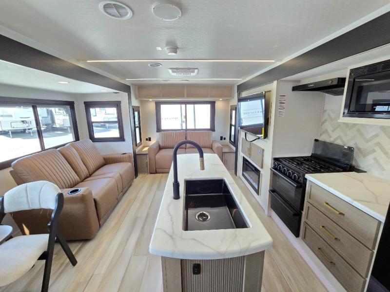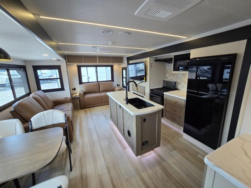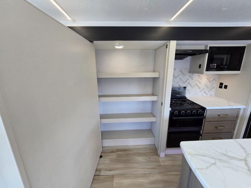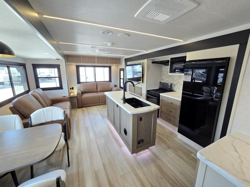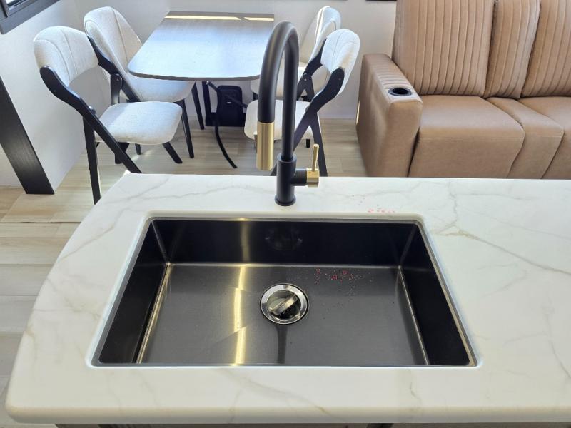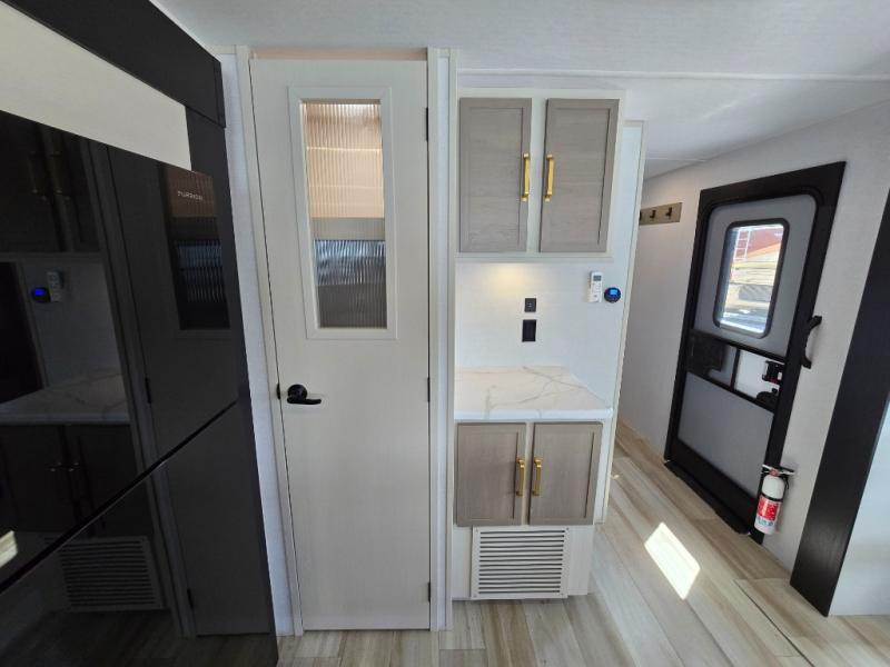 You are going to love the spacious private bedroom with a space-saving door, custom king bed slide, a dresser, and a full-width wardrobe with washer and dryer prep. If you ever decide to get out of bed, you can enjoy a relaxing shower in the residential shower with a skylight and a wide-open kitchen and living area with dual opposing slide outs. The cook will love having a kitchen island, a hutch, a large pantry, plus a 12V refrigerator. There is an entertainment center with a 50" TV and fireplace plus plenty of seating on the furniture. You can dine at the booth dinette or choose to add the free-standing dinette option if you prefer having your own seat. And don't forget about the natural lighting and views you will receive from the panoramic windows.