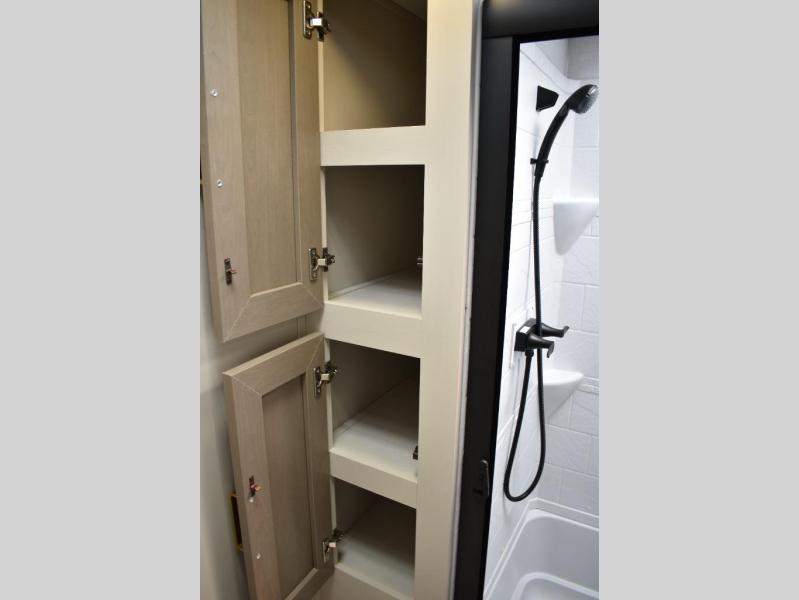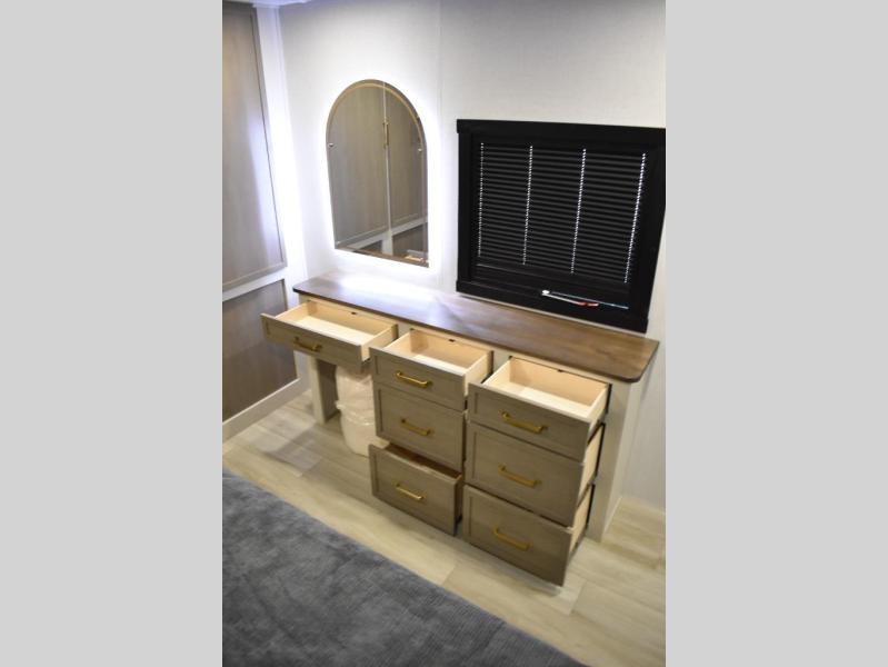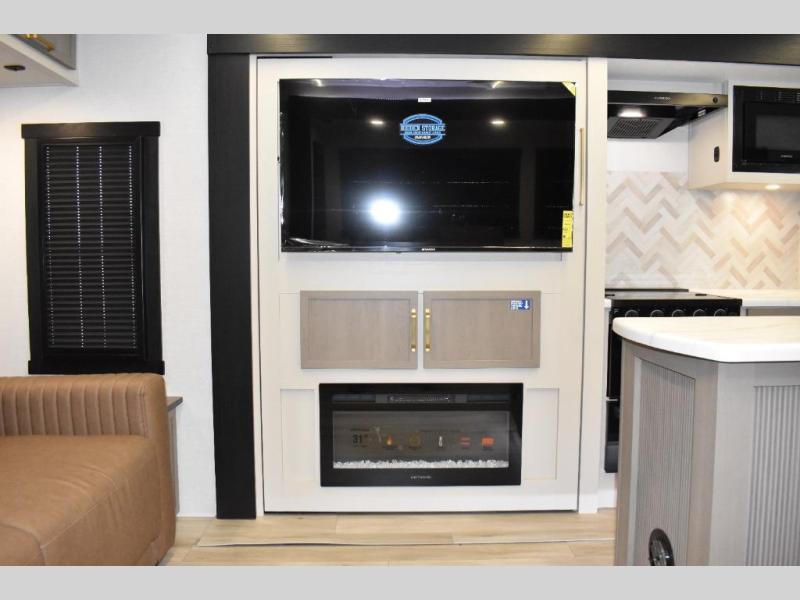 You are going to love the spacious private bedroom with a space-saving door, custom king bed slide, a dresser, and a full-width wardrobe with washer and dryer prep. If you ever decide to get out of bed, you can enjoy a relaxing shower in the residential shower with a skylight and a wide-open kitchen and living area with dual opposing slide outs. The cook will love having a kitchen island, a hutch, a large pantry, plus a 12V refrigerator. There is an entertainment center with a 50" TV and fireplace plus plenty of seating on the furniture. You can dine at the booth dinette or choose to add the free-standing dinette option if you prefer having your own seat. And don't forget about the natural lighting and views you will receive from the panoramic windows.