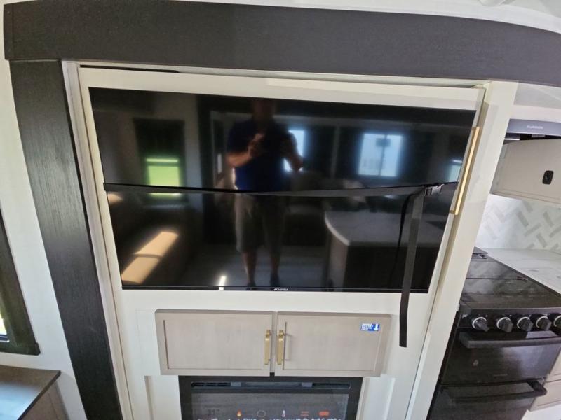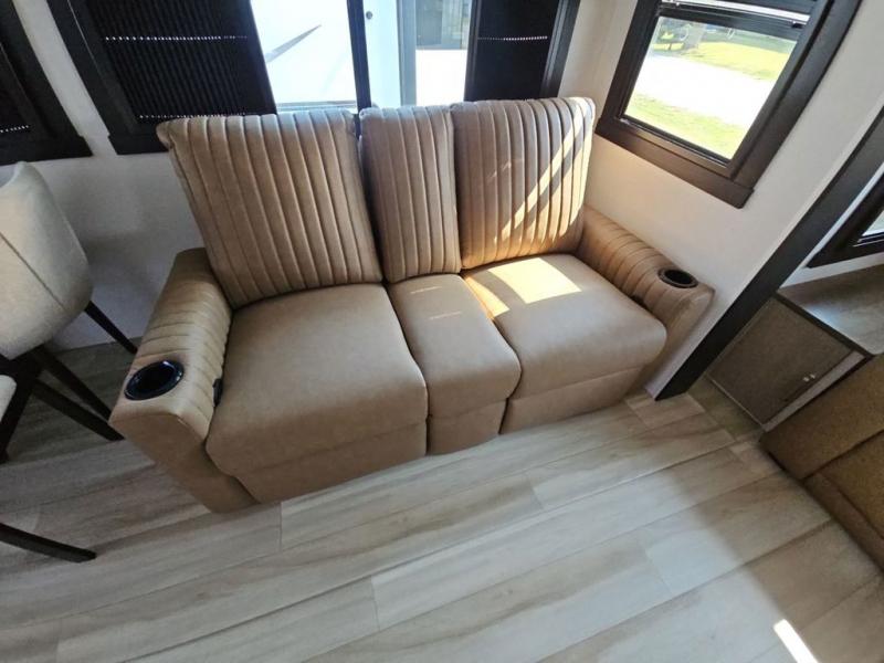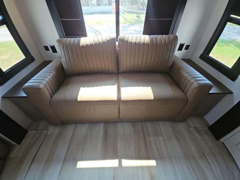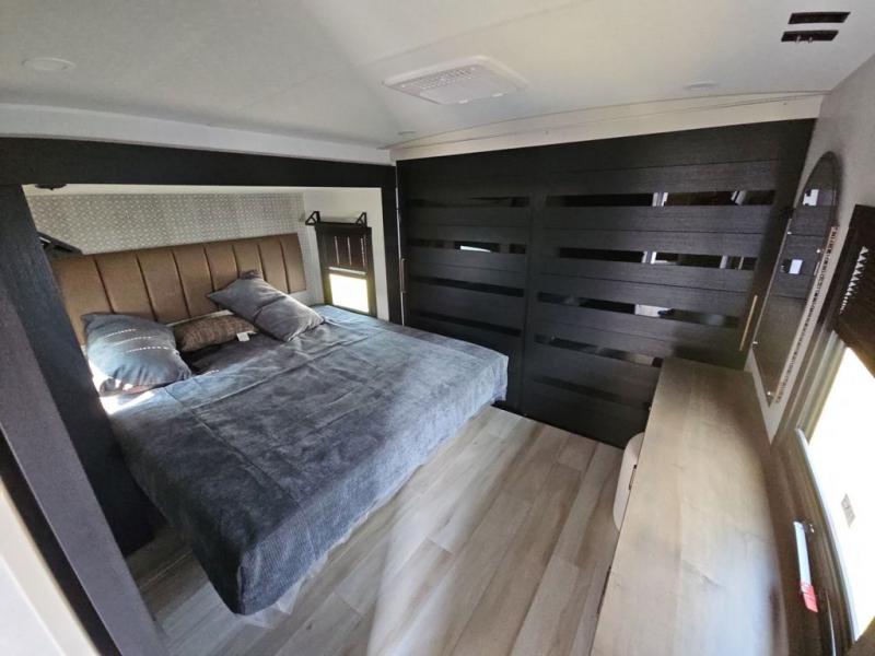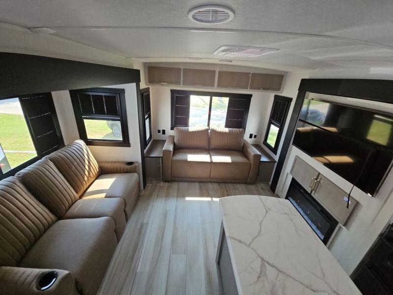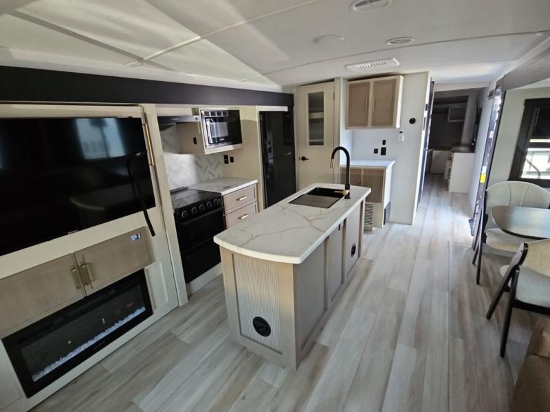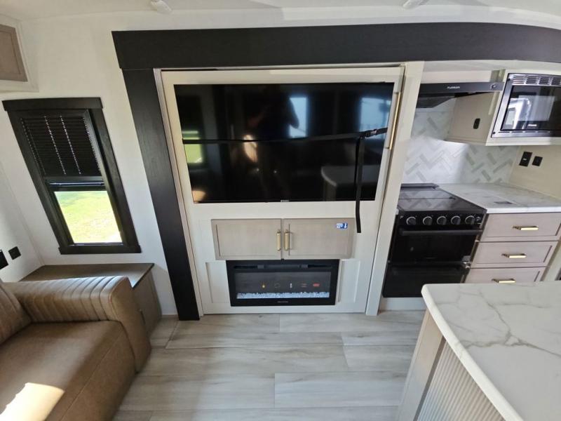 You are going to love the spacious private bedroom with a space-saving door, custom king bed slide, a dresser, and a full-width wardrobe with washer and dryer prep. If you ever decide to get out of bed, you can enjoy a relaxing shower in the residential shower with a skylight and a wide-open kitchen and living area with dual opposing slide outs. The cook will love having a kitchen island, a hutch, a large pantry, plus a 12V refrigerator. There is an entertainment center with a 50" TV and fireplace plus plenty of seating on the furniture. You can dine at the booth dinette or choose to add the free-standing dinette option if you prefer having your own seat. And don't forget about the natural lighting and views you will receive from the panoramic windows.