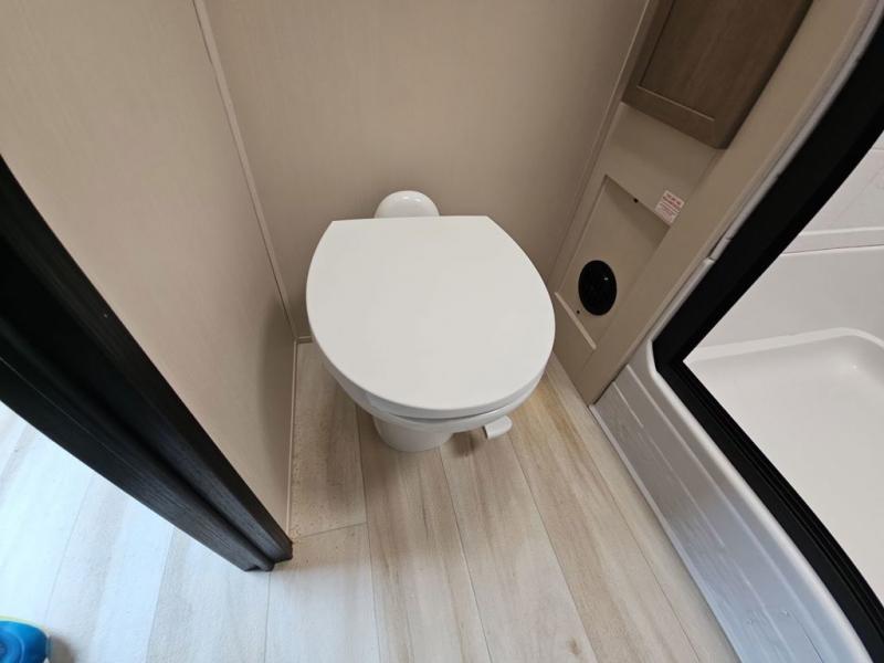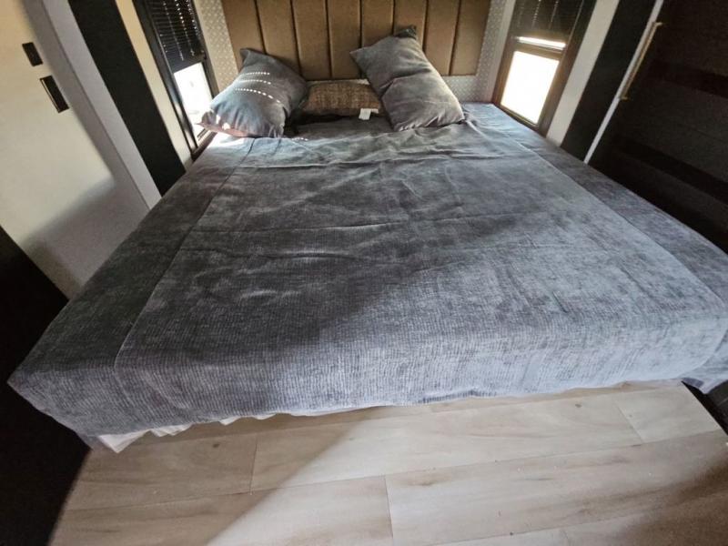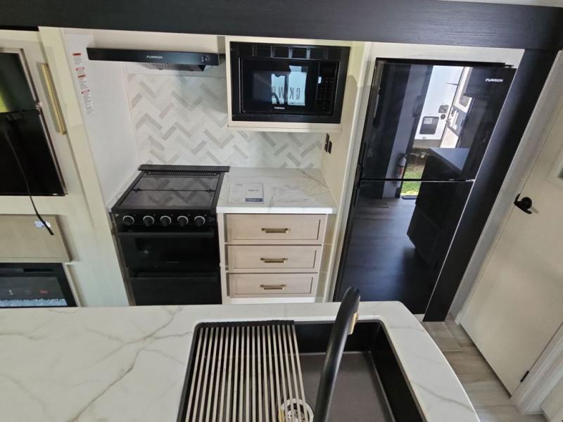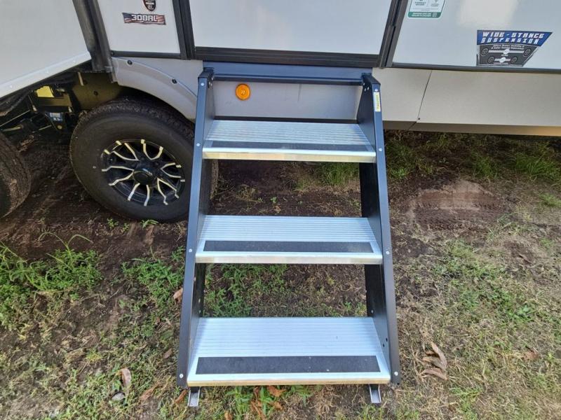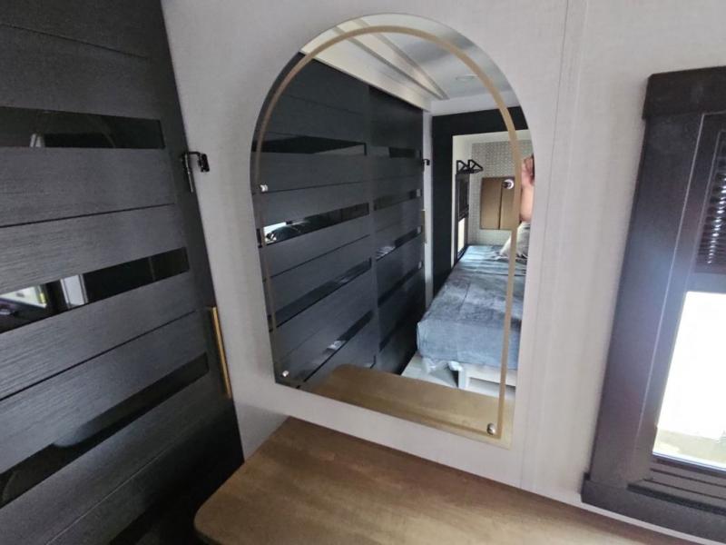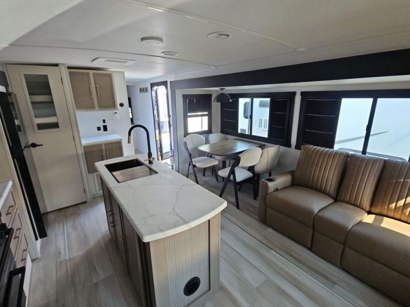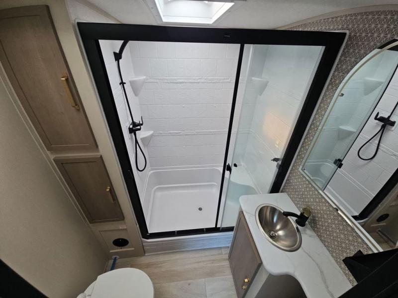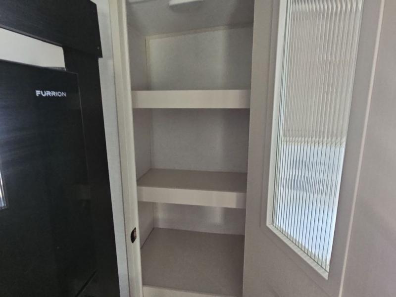 You are going to love the spacious private bedroom with a space-saving door, custom king bed slide, a dresser, and a full-width wardrobe with washer and dryer prep. If you ever decide to get out of bed, you can enjoy a relaxing shower in the residential shower with a skylight and a wide-open kitchen and living area with dual opposing slide outs. The cook will love having a kitchen island, a hutch, a large pantry, plus a 12V refrigerator. There is an entertainment center with a 50" TV and fireplace plus plenty of seating on the furniture. You can dine at the booth dinette or choose to add the free-standing dinette option if you prefer having your own seat. And don't forget about the natural lighting and views you will receive from the panoramic windows.