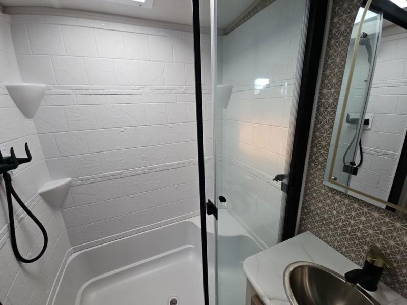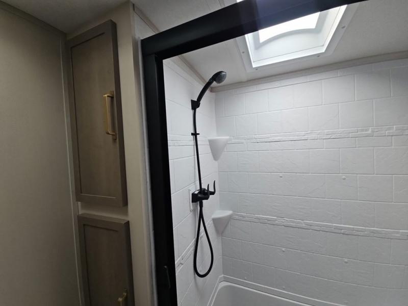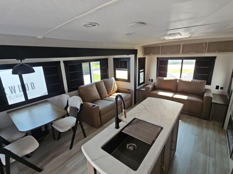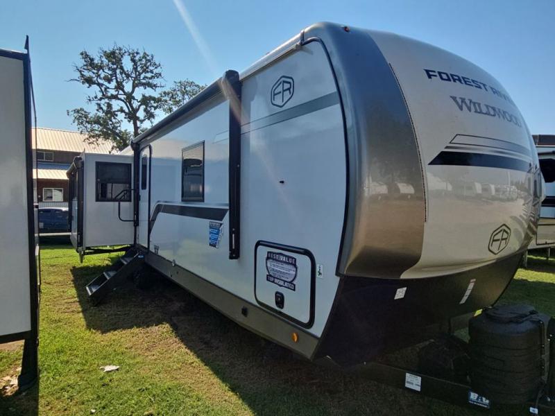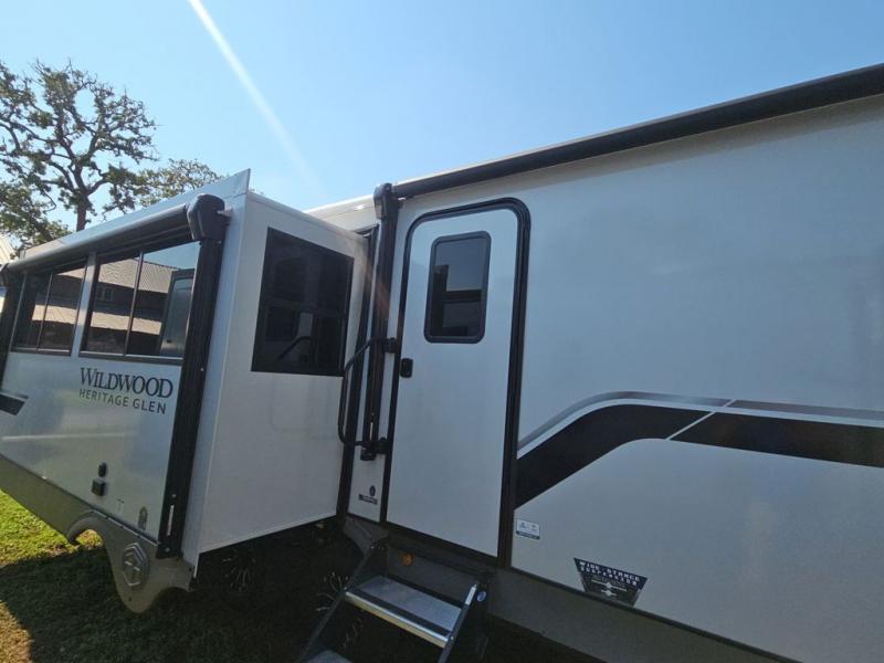 With any Wildwood Heritage Glen travel trailer by Forest River, the quality construction, attention to detail and design along with a bright and welcoming interior allows you to relax in comfort with conveniences while exploring outdoors. Each model includes a WeatherShield one piece fiberglass roof, Maxxis radial tires, and an enclosed underbelly with 12V tank heaters on all holding tanks for added protection. You will appreciate the on-demand tankless water heater, along with the 15K BTU Quite Cool A/C and 50 Amp service with a brace for a second A/C. There is an outside shower with hot and cold water, solar prep, a power tongue jack, plus many more exterior conveniences. Head inside to enjoy matte gold hardware, wood door casings in place of plastic door casings, and full length barreled ceilings for additional head room.